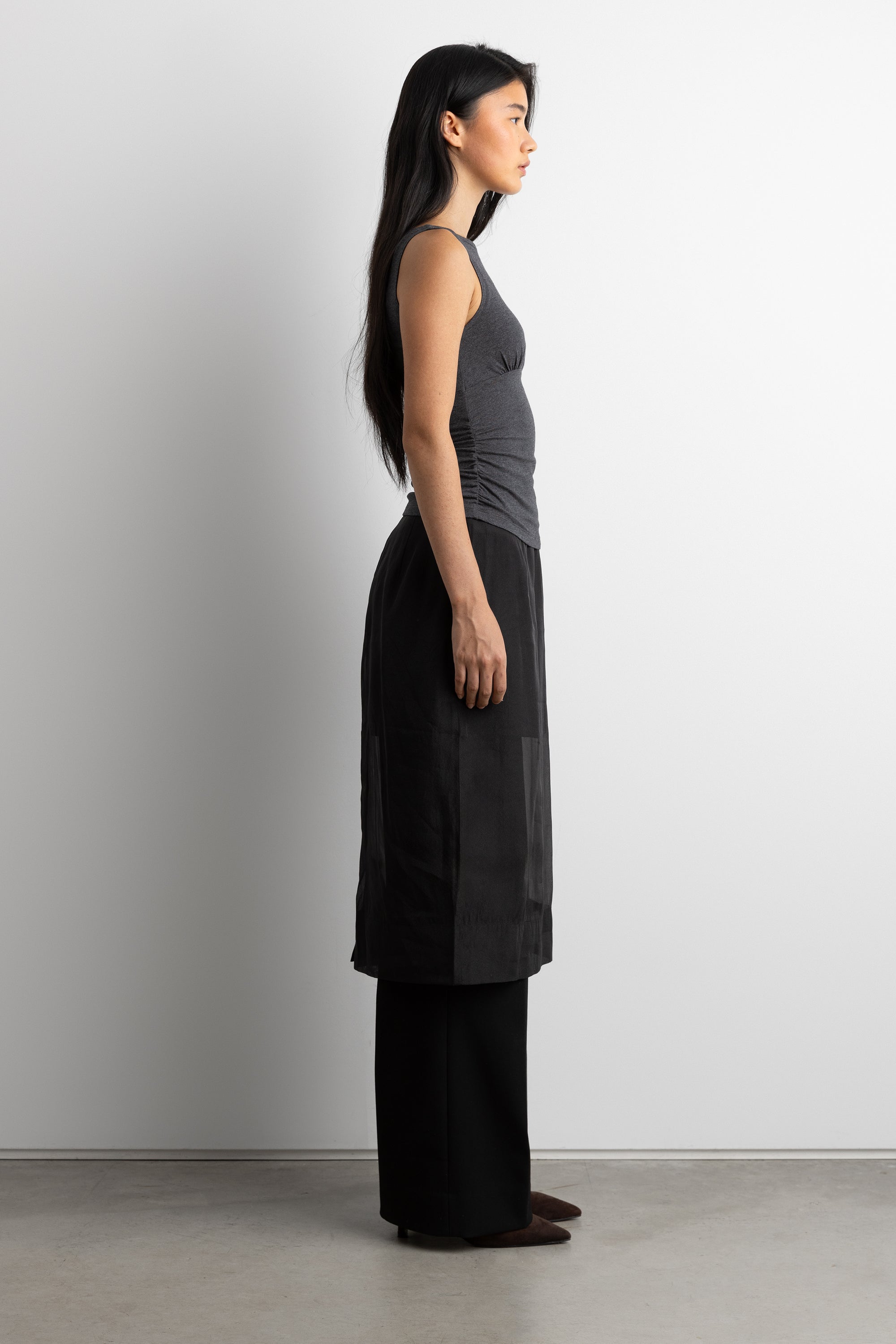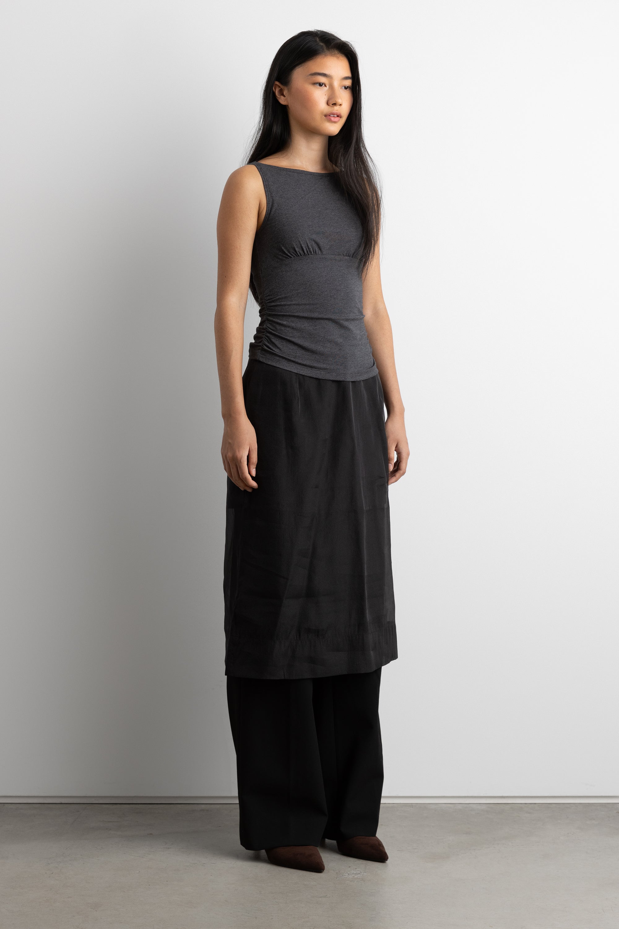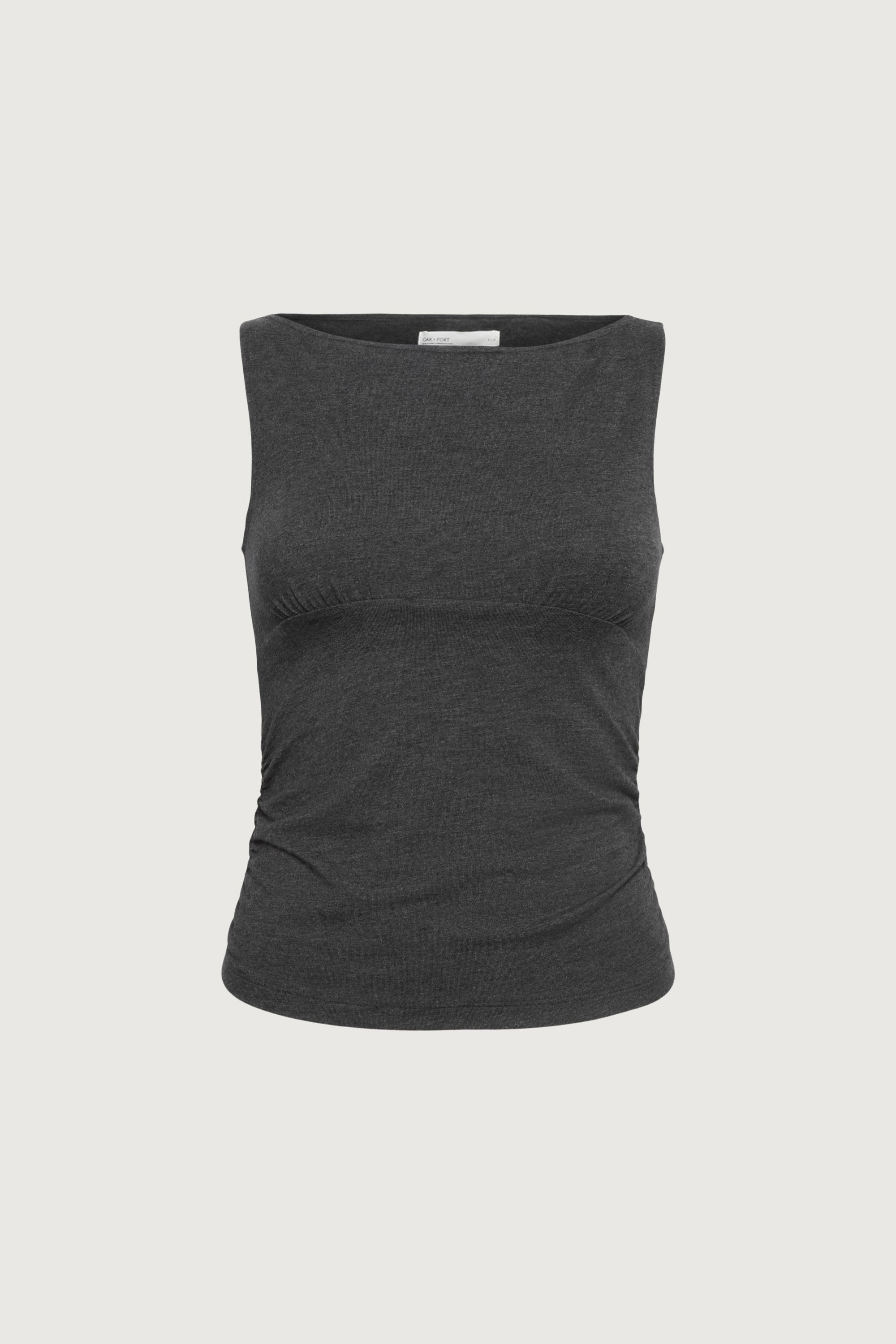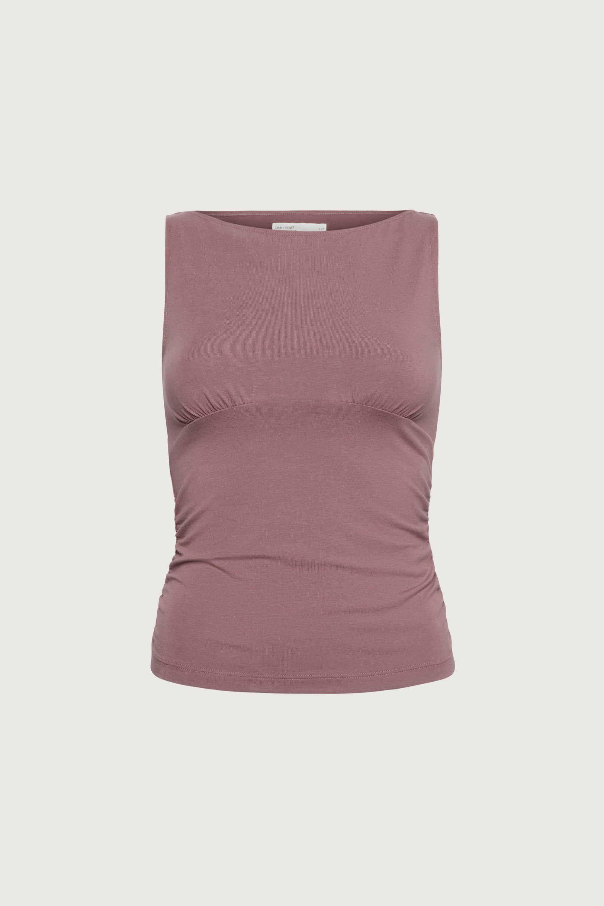 Cotton modal. Enzyme wash effect. High boat neckline. Ruching at sides at bust.