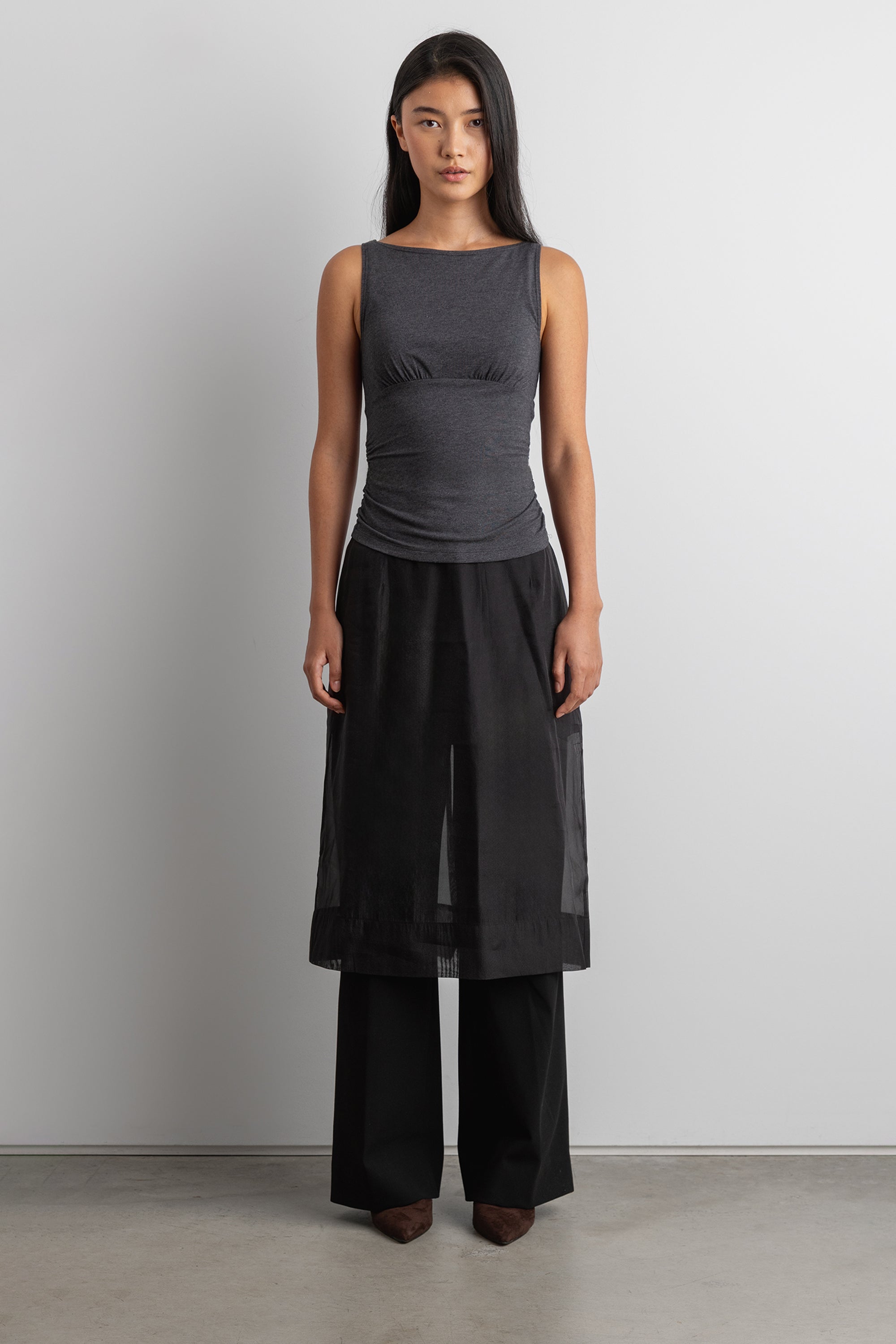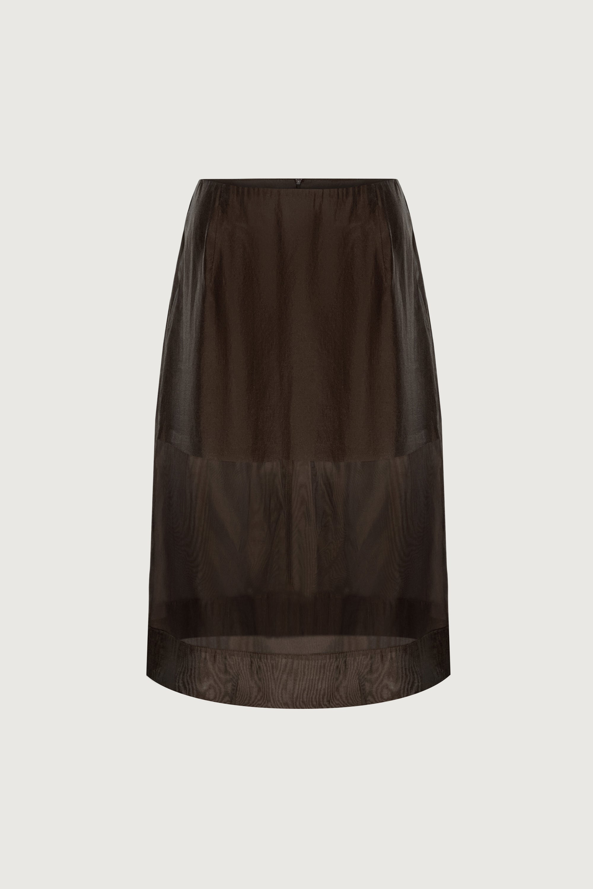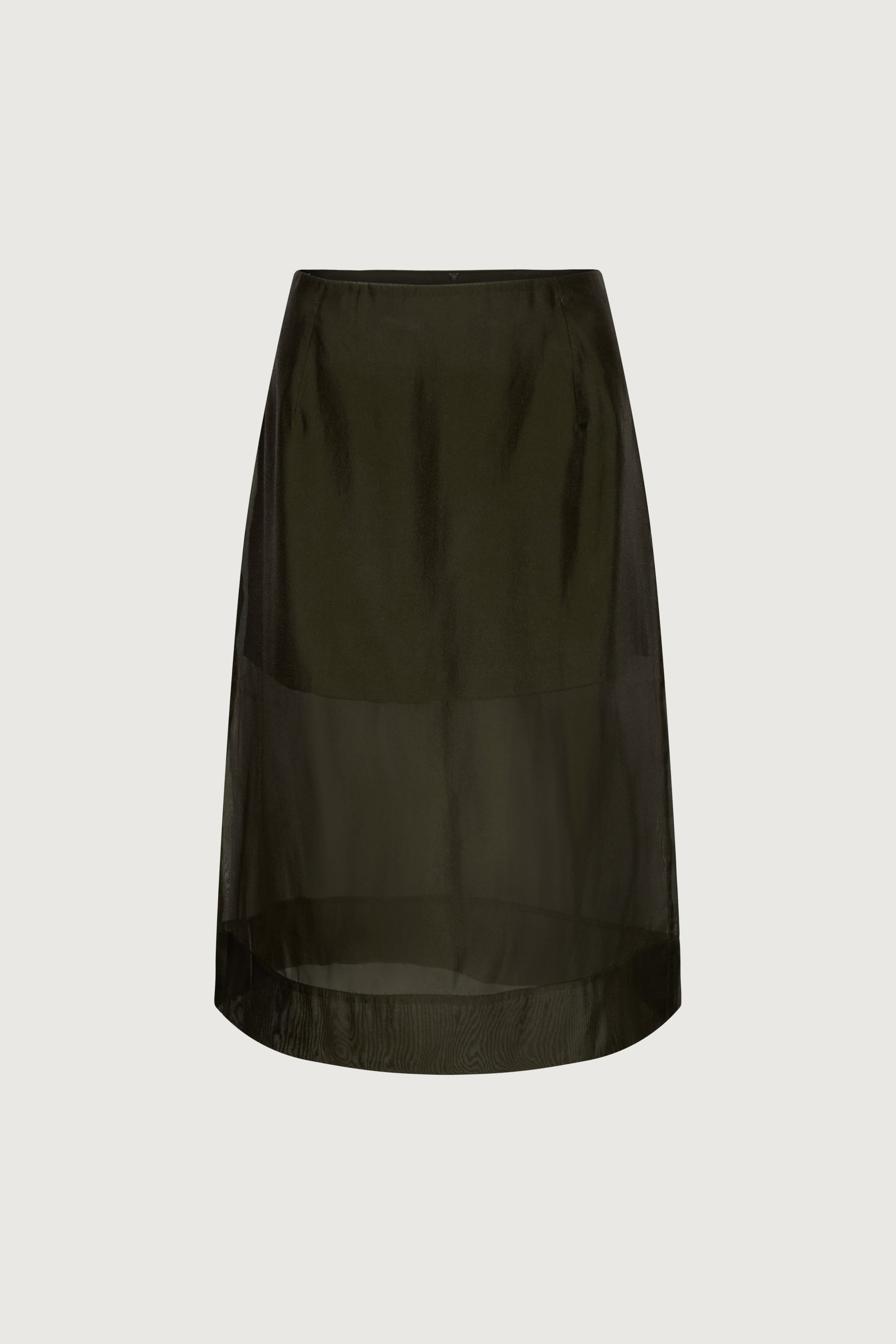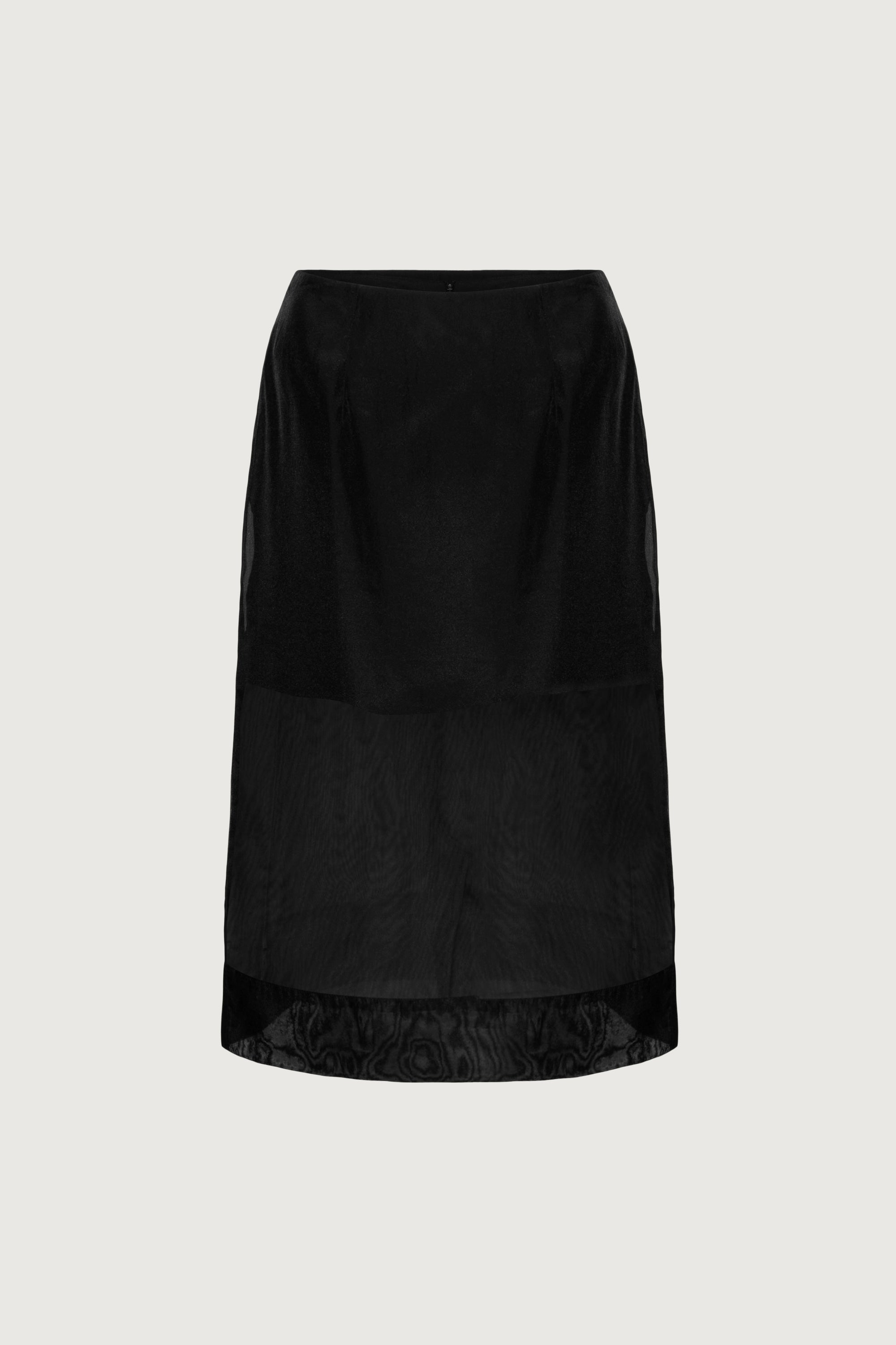 Classic pencil skirt silhouette. Sheer, lightweight organza fabric. Subtle sheen. Internal layer. Rear zipper.