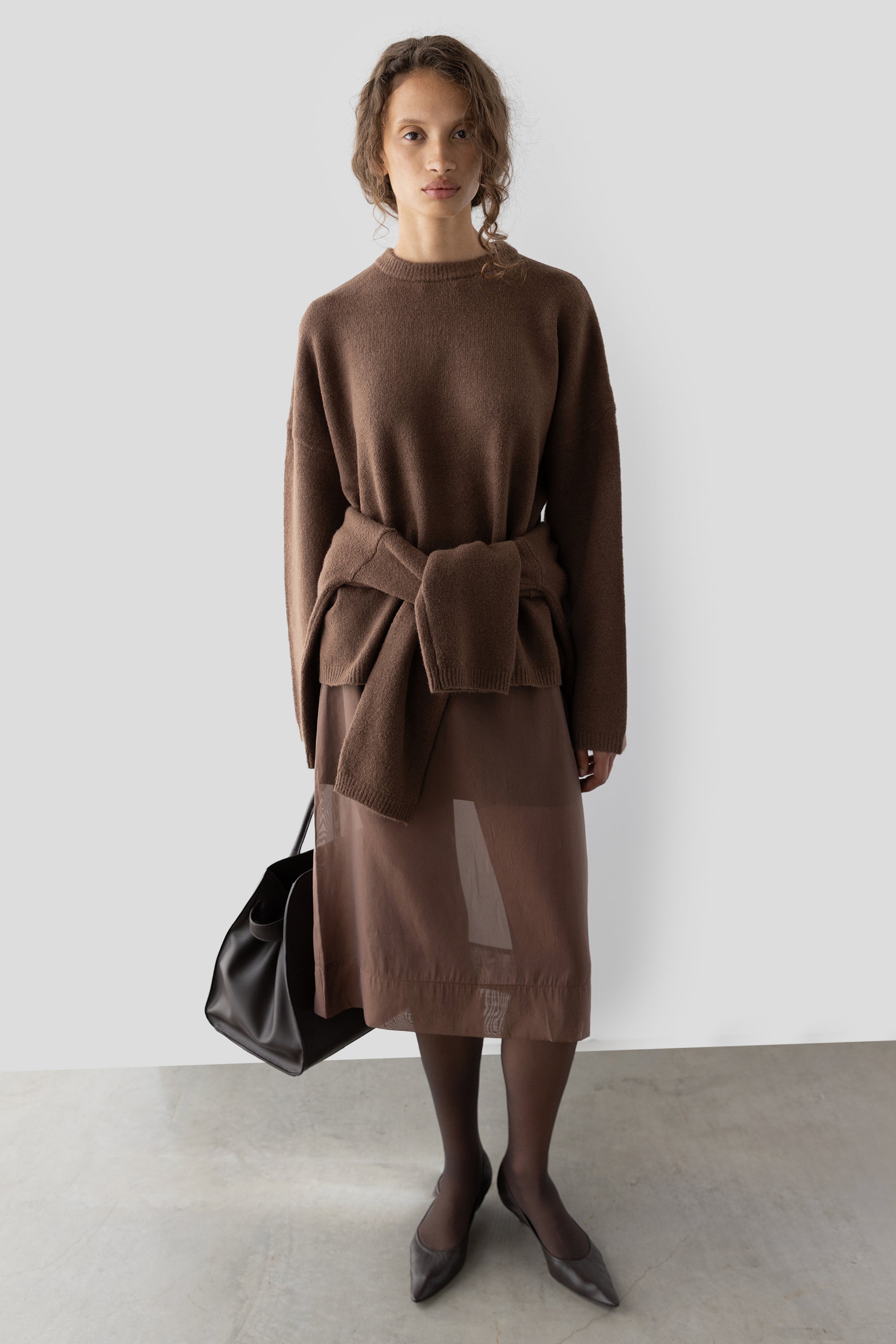 This skirt has a relaxed fit, and classic pencil skirt silhouette. It is cut from sheer, lightweight organza fabric with subtle sheen. It is detailed with an internal layer and a rear zipper for a secure fit.