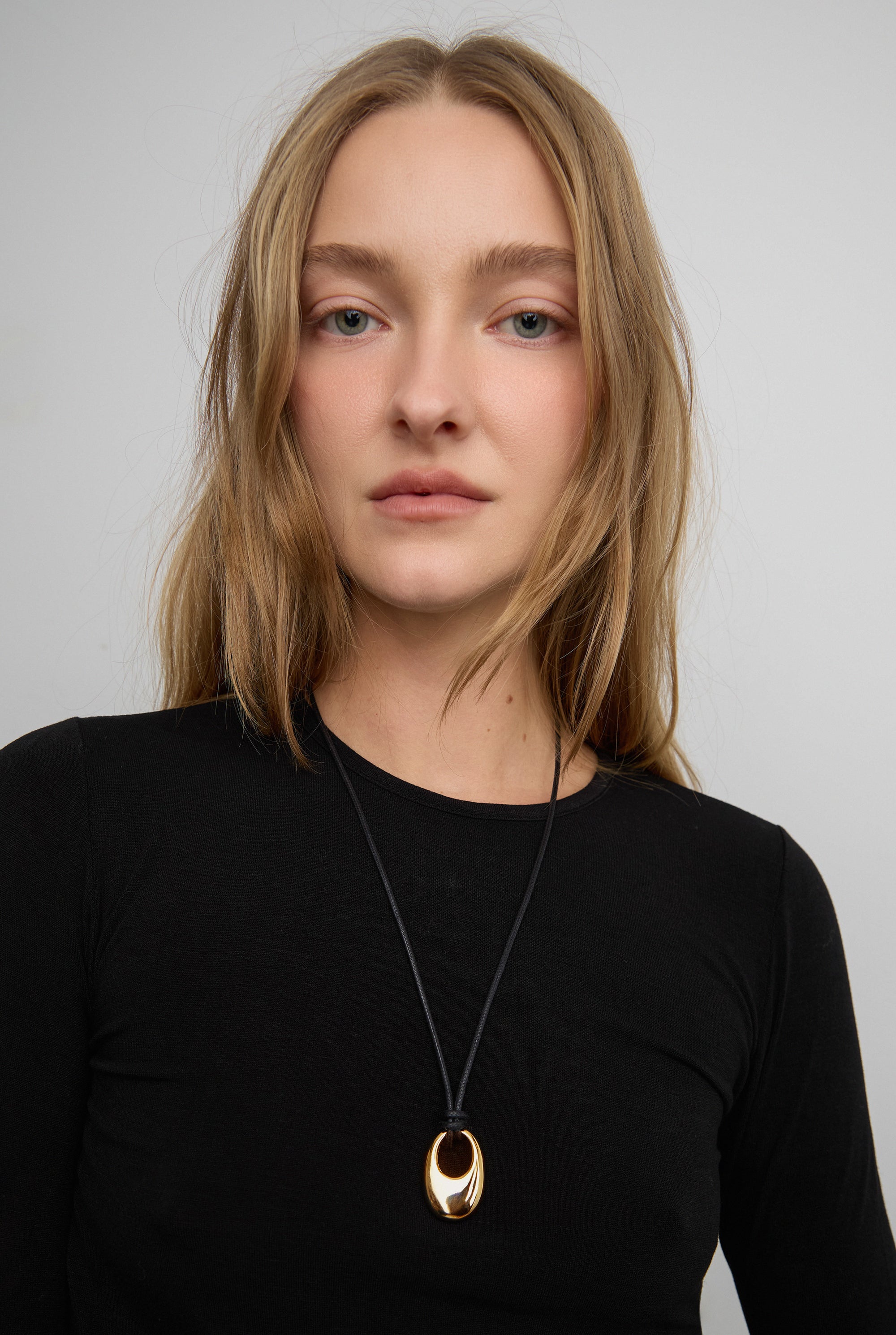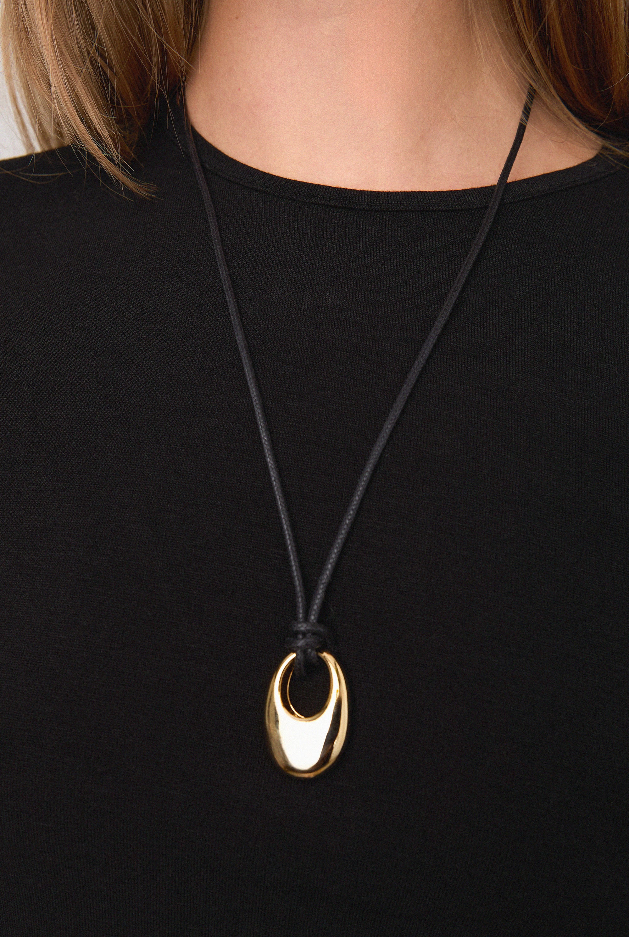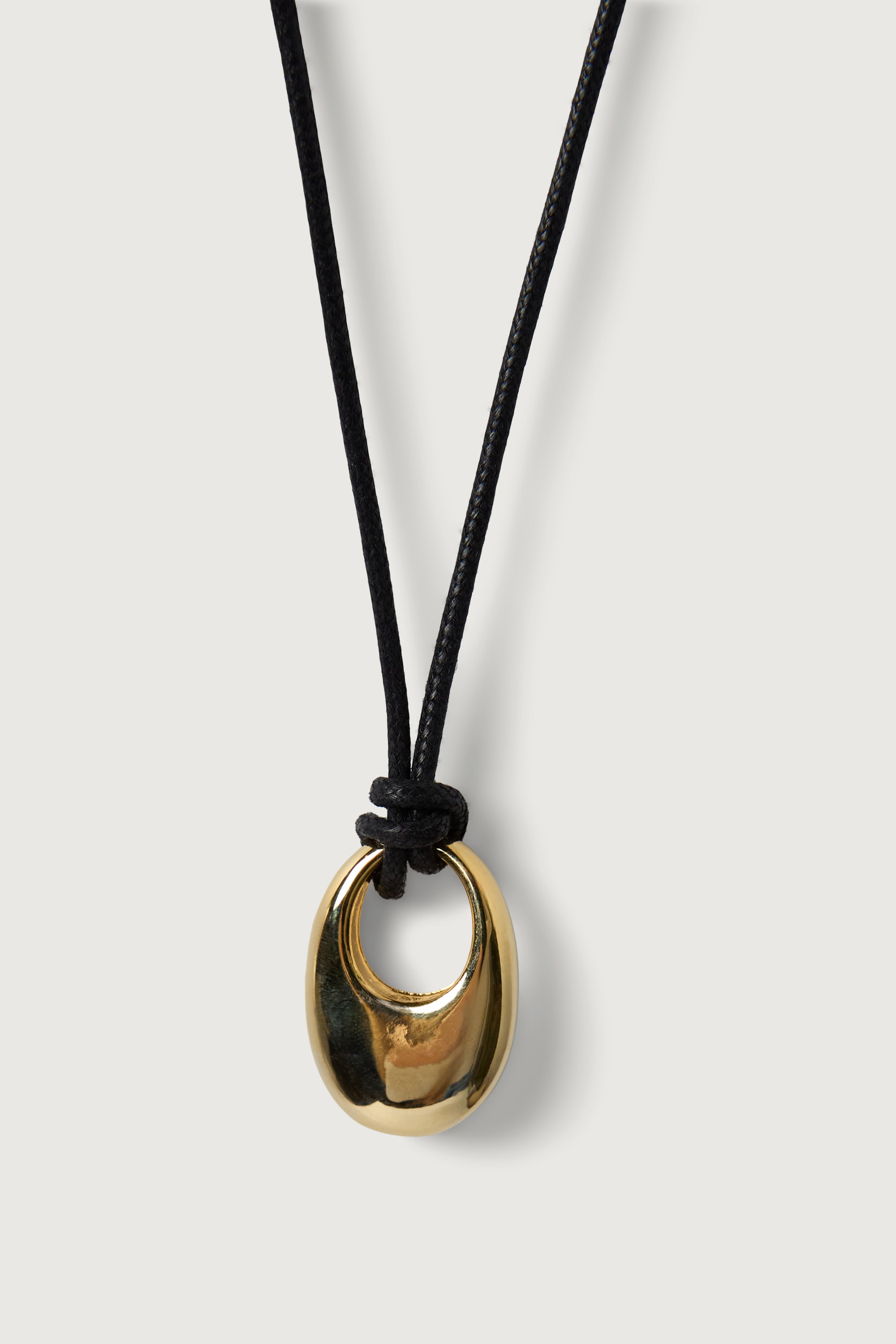 A modern cord necklace detailed with a sculptural hoop pendant. Designed with adjustable ties for a customizable fit, this piece adds a clean, understated finish to any look.