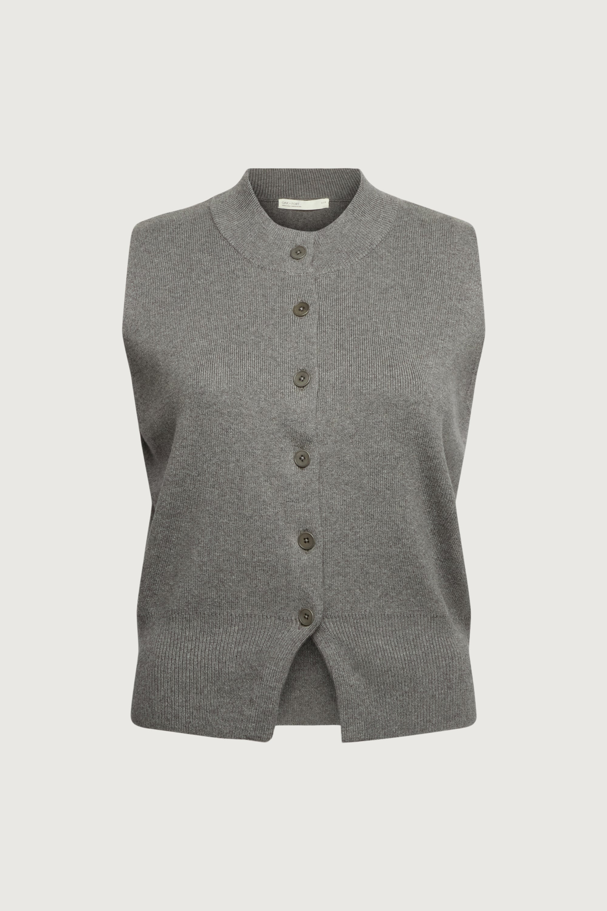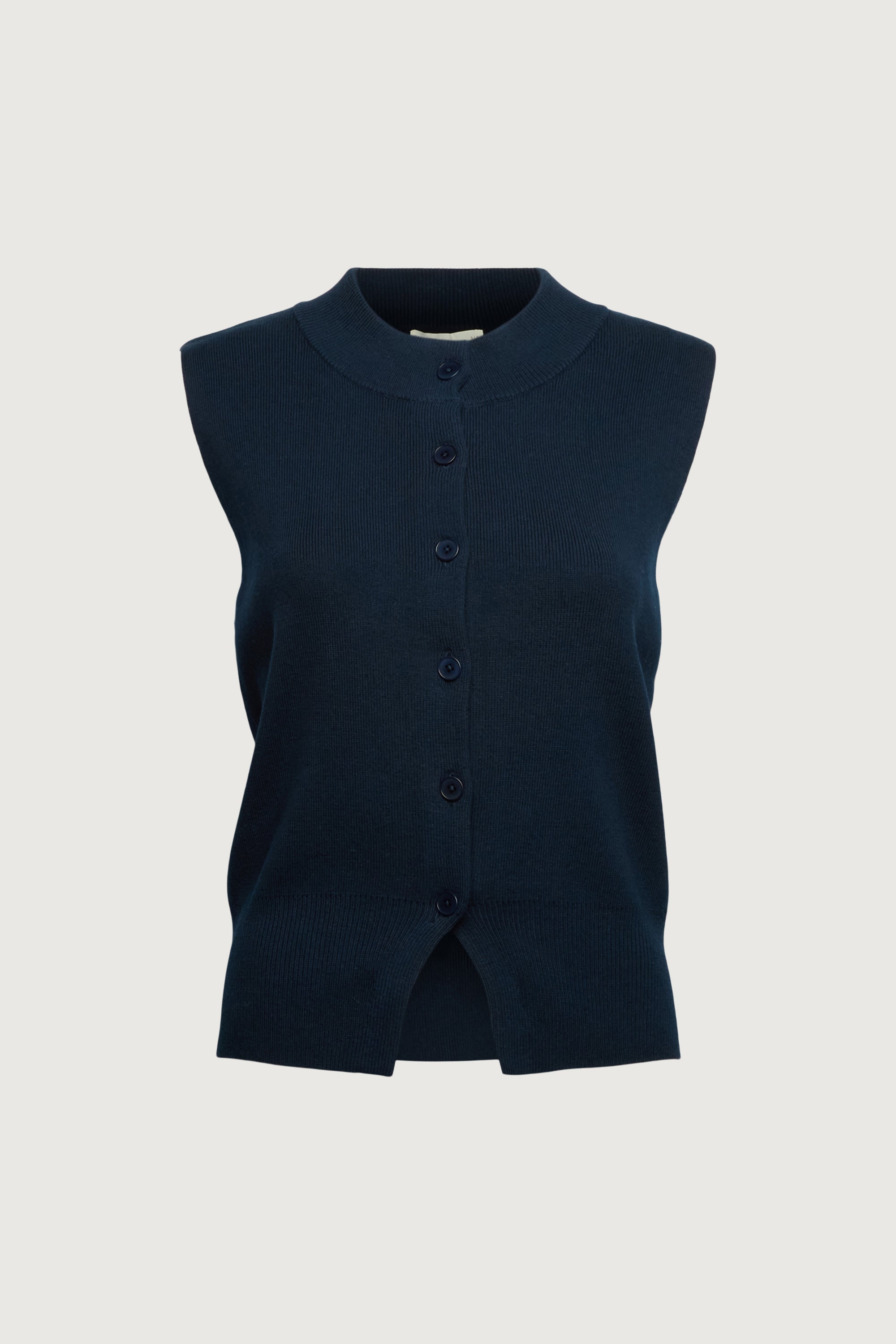 This knit button up sleeveless vest is made in a classic fit. It has ribbed trims and a subtle mock neckline. Pair yours over a basic tee and jeans.