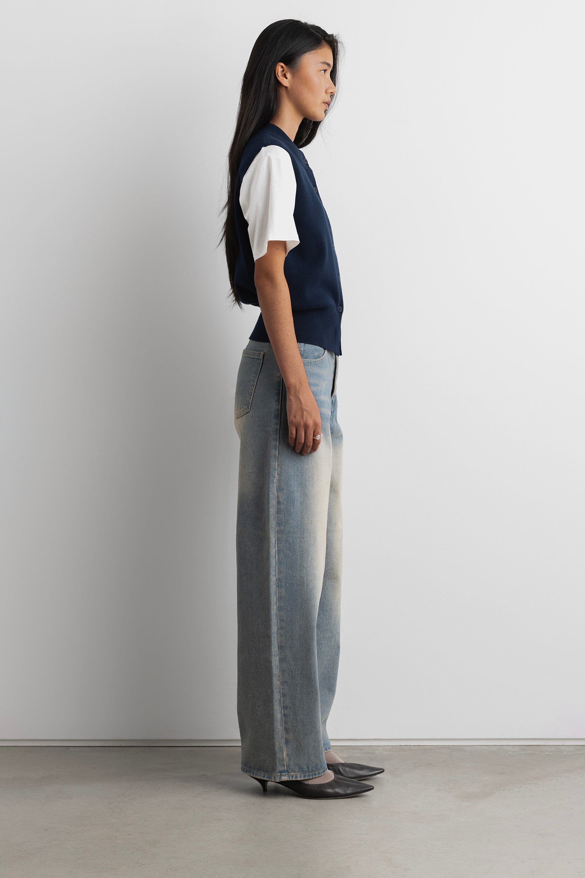 Structured knit. Ribbed mock neckline. Corozo buttons.
