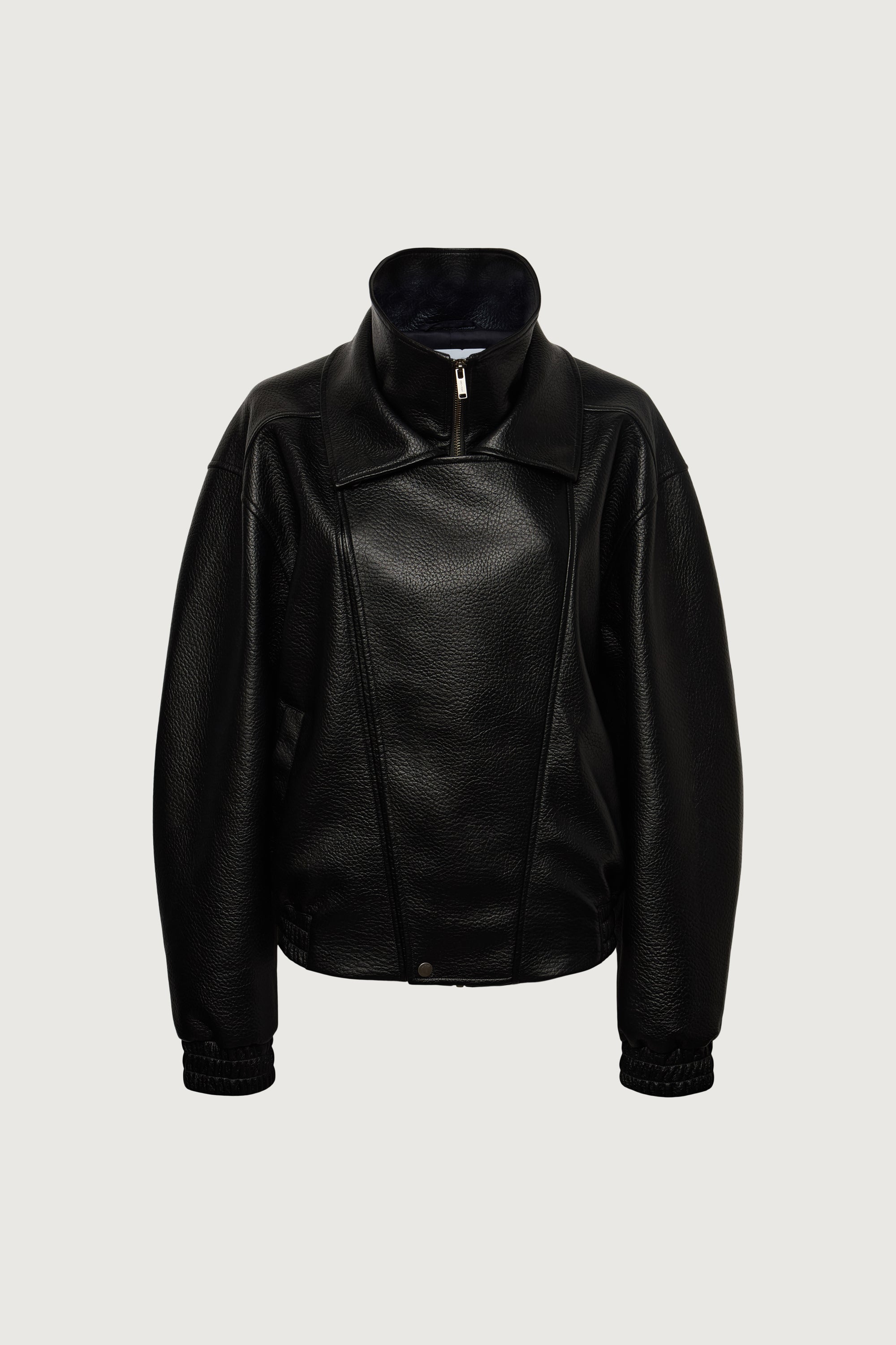 This vegan leather biker jacket is made in an oversized fit and is detailed with a double collar with a zip-up front closure that you can create into a funnel neck look. It features a front flap with a snap button that covers that front zipper, elasticated cuffs and hem and slash pockets.