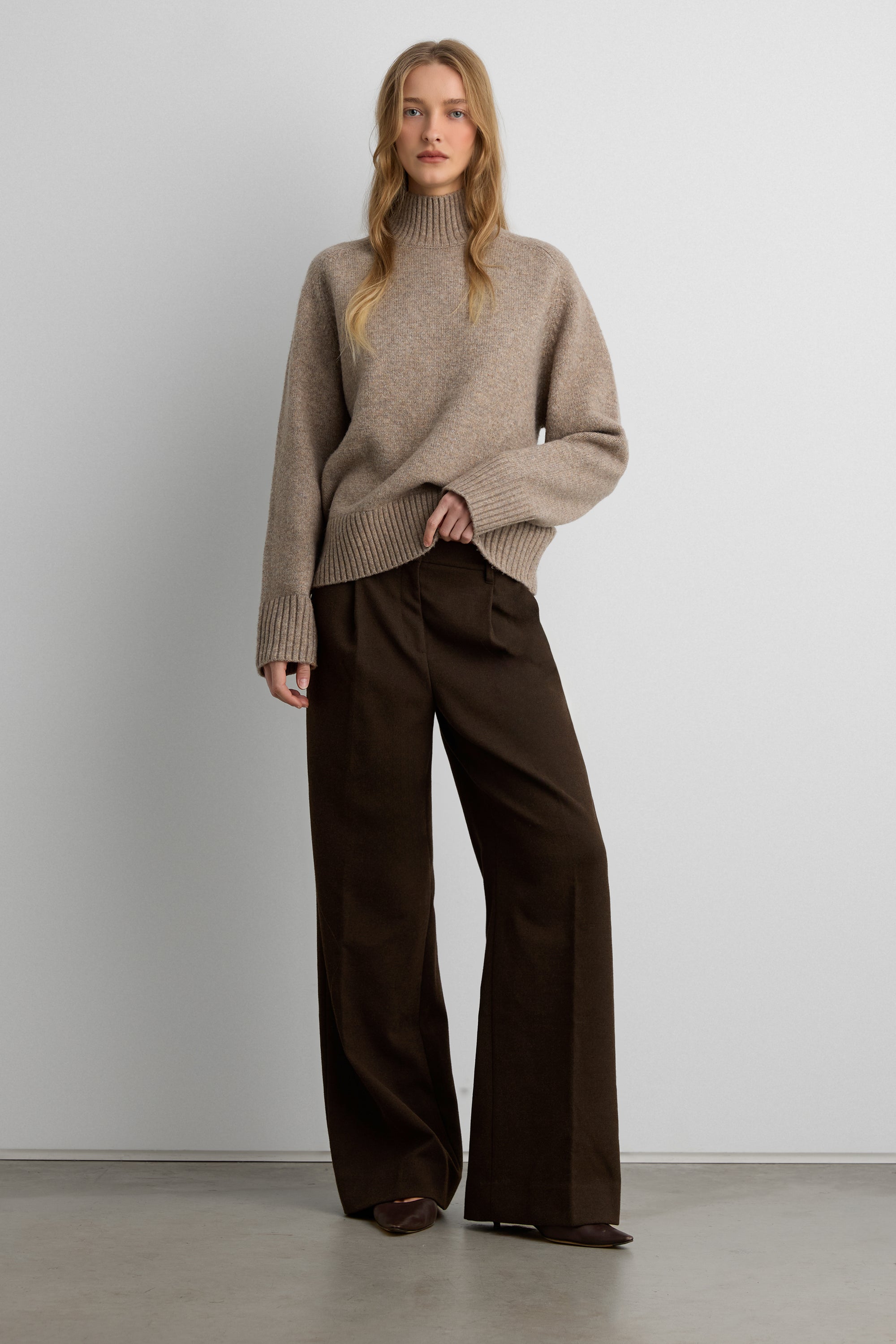 Thick brushed suiting fabric. Belt loops. Wide leg cut. High-rise waist. Side pockets. Front pleats. Back welt pocket detail.