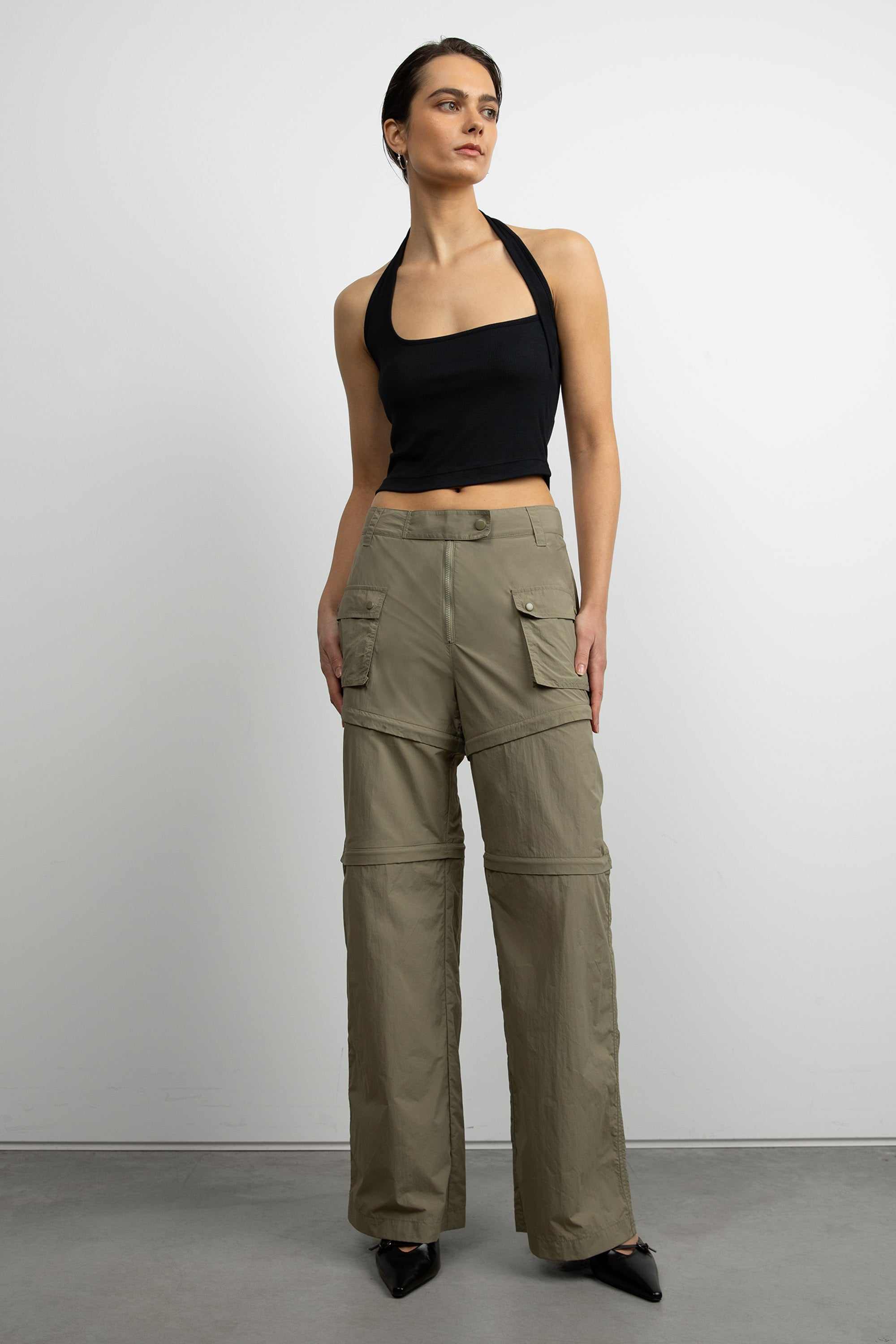 These straight leg nylon pants are made in a relaxed fit with a high-rise waist. It's designed with two zippers so can wear it as shorts or bermuda shorts on warmer days. Wear yours with a basic tee and sneakers.