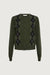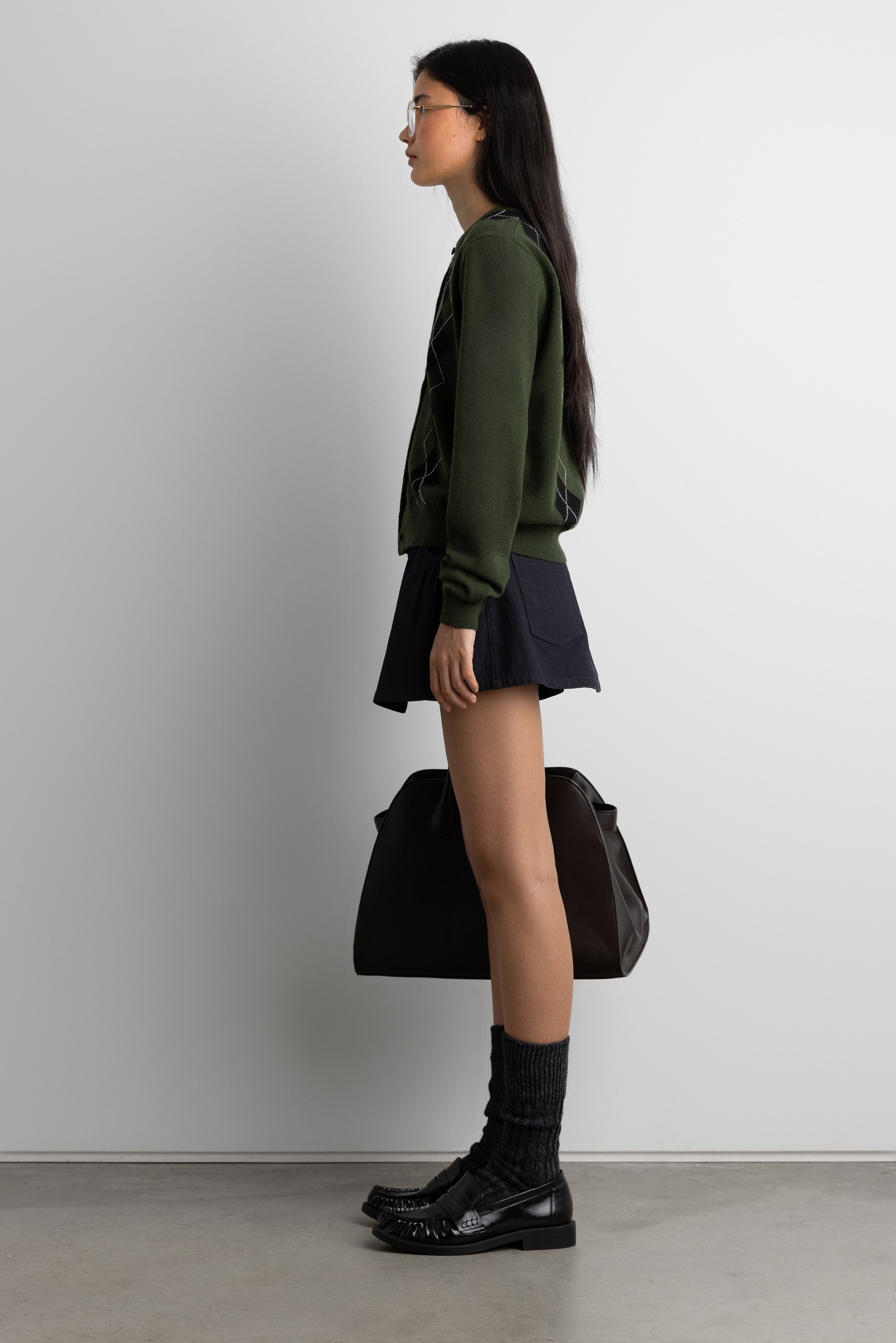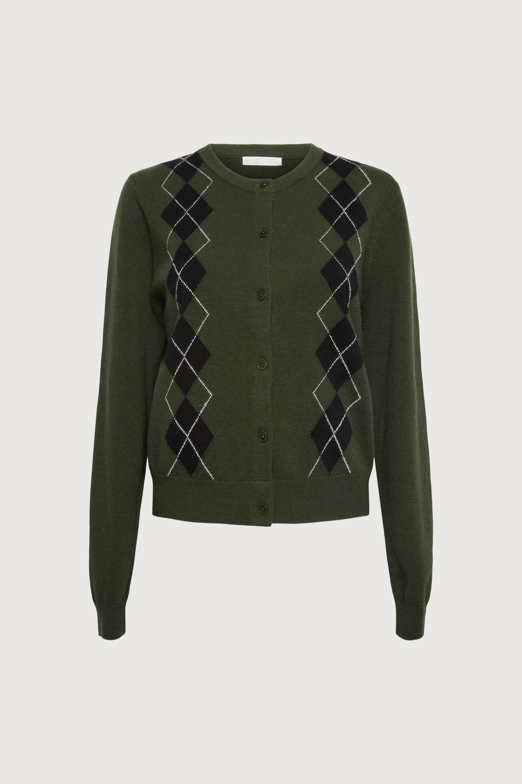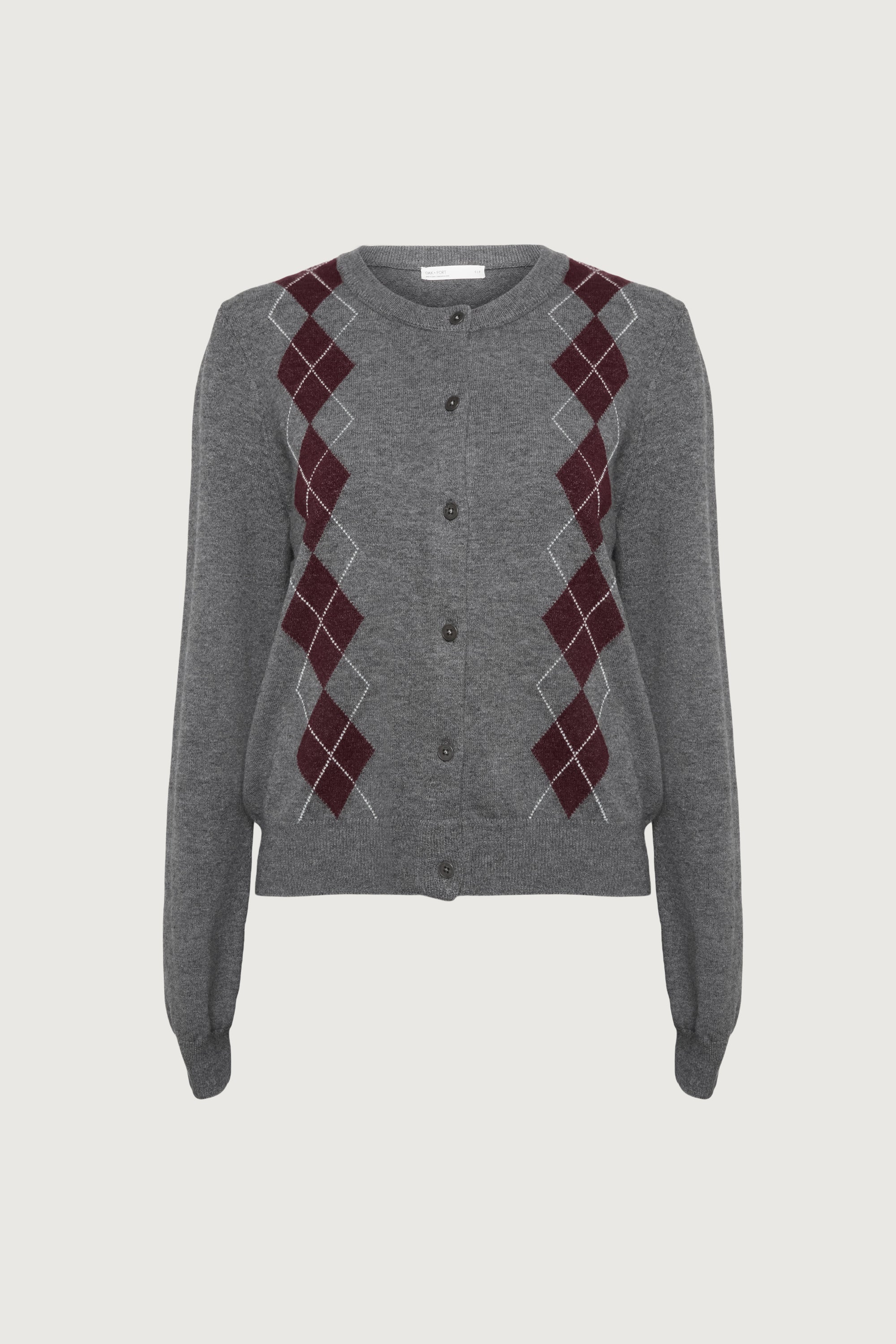 Argyle intarsia knit. Crew neckline. Button front. Ribbed trims.