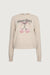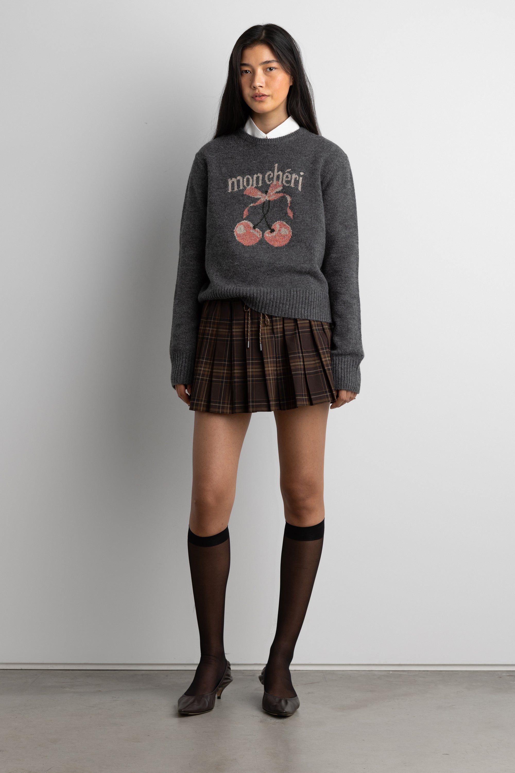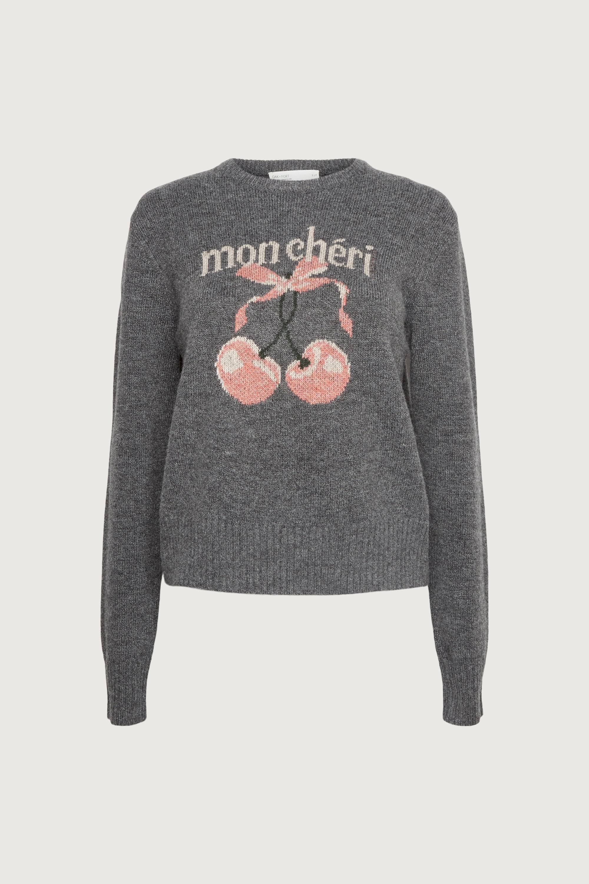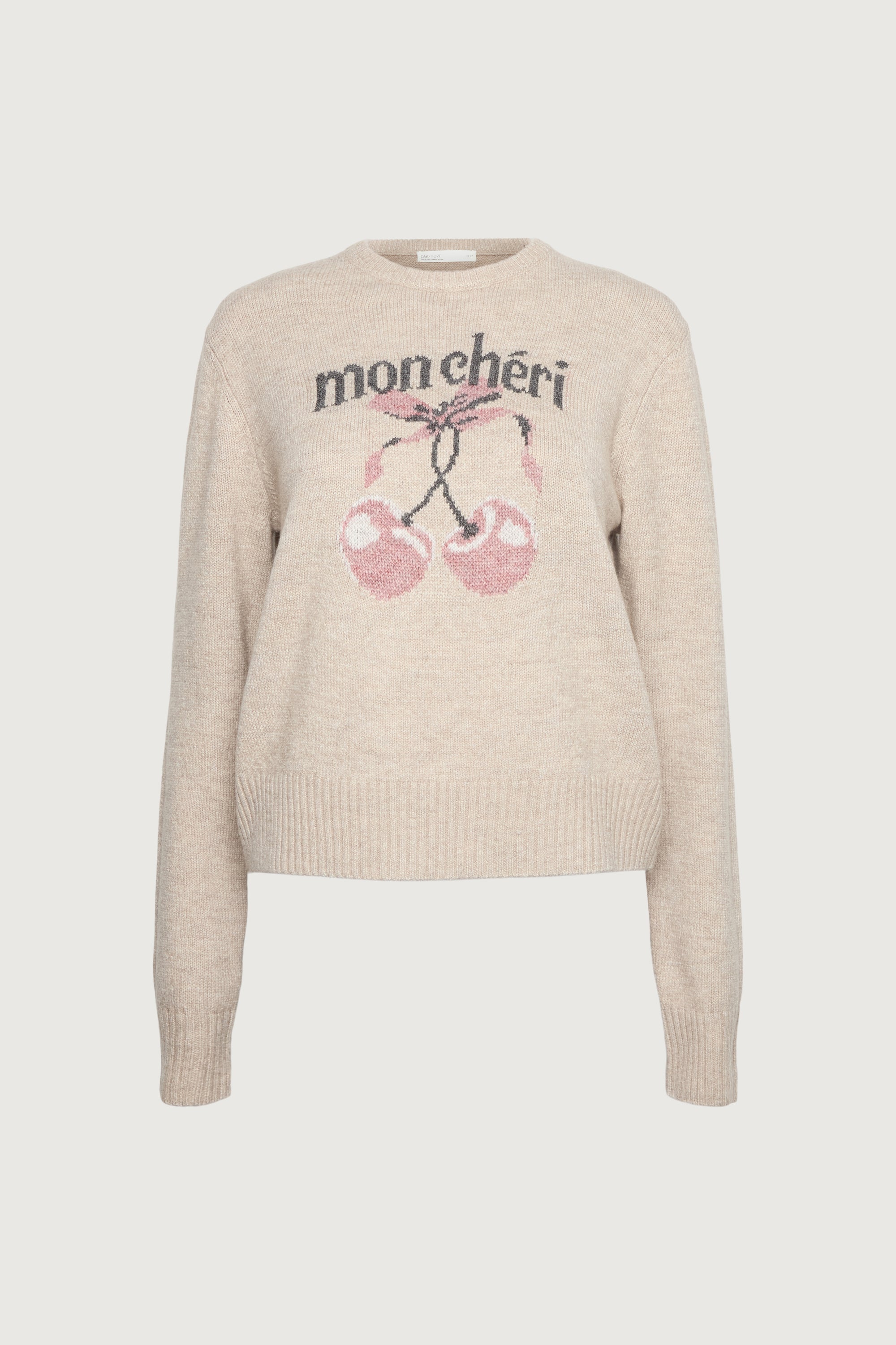 Lightweight knit. Crew neckline. Ribbed trims. Jacquard knit of a cherry print and ”mon cheri" across the front.