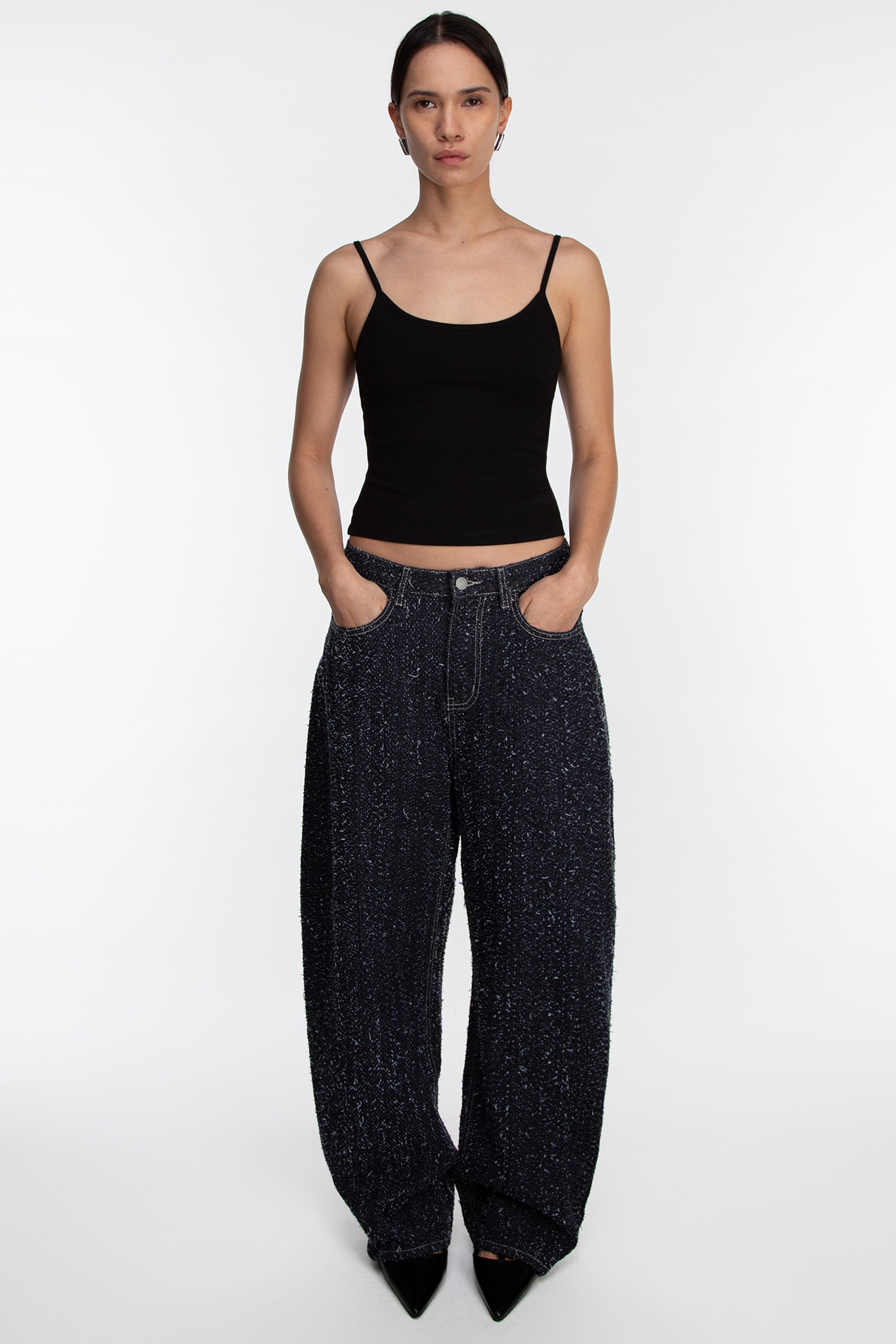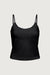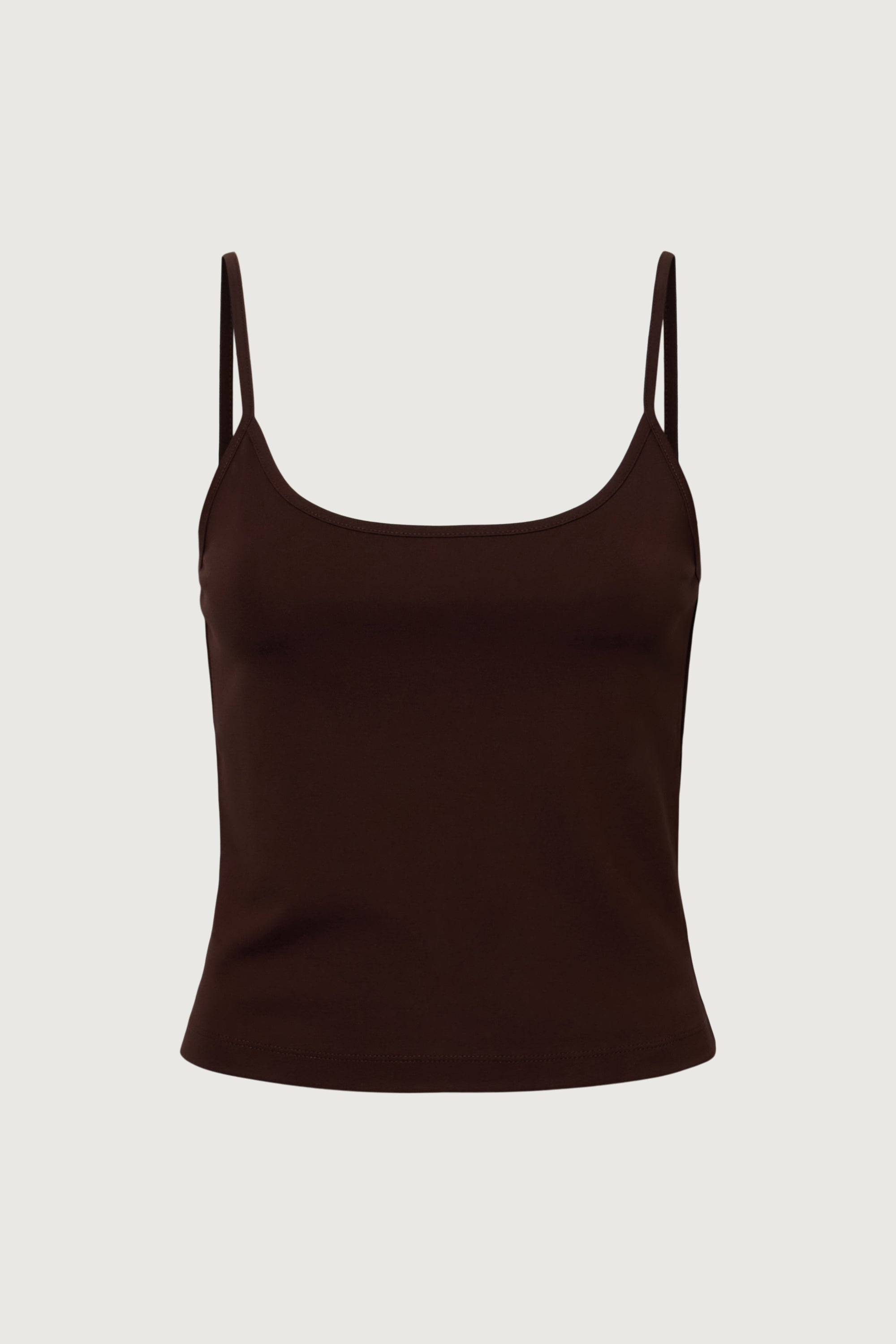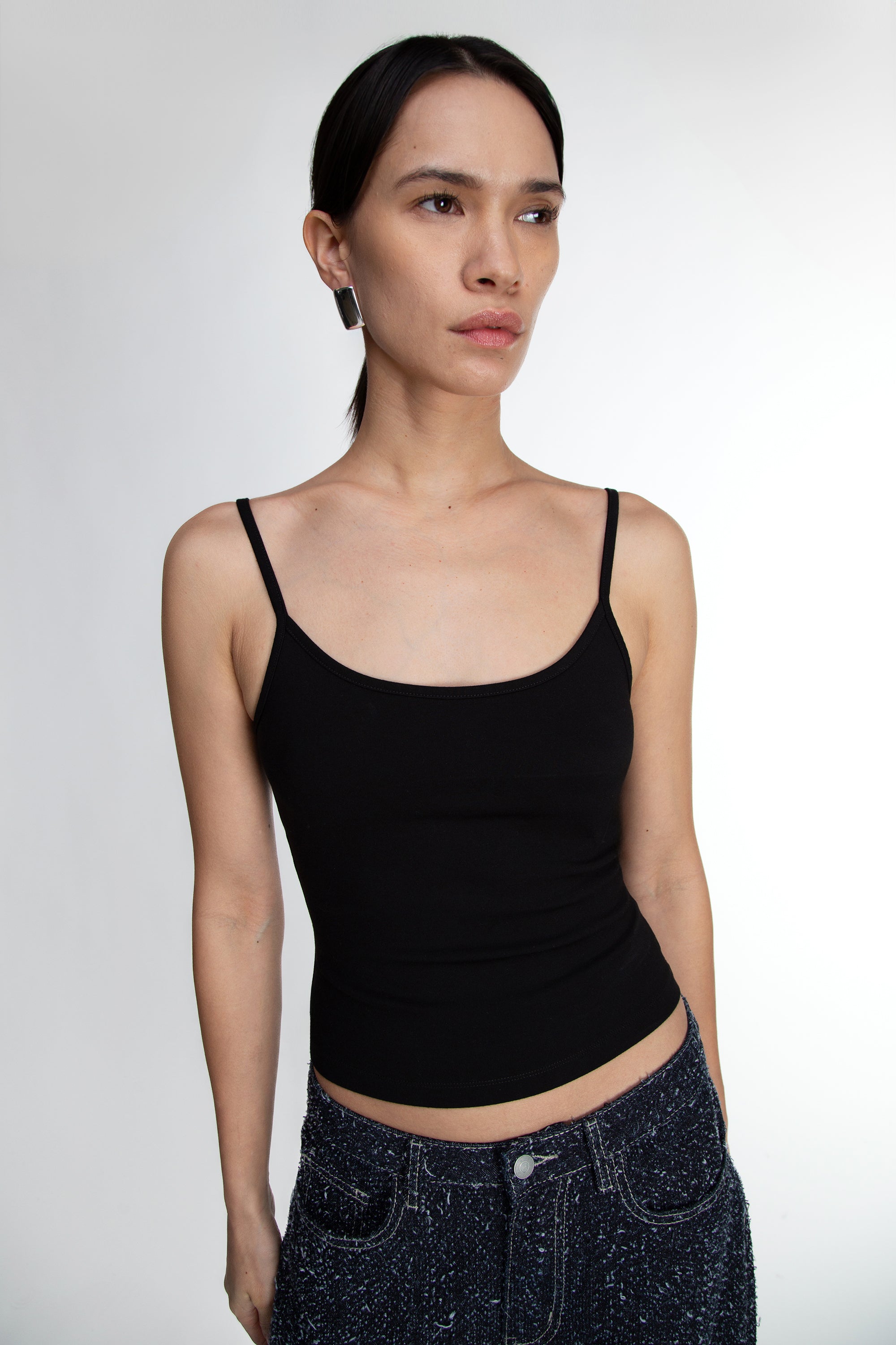 Thick stretch fabric. Scoop neckline. Cropped length. Shoulder straps.
