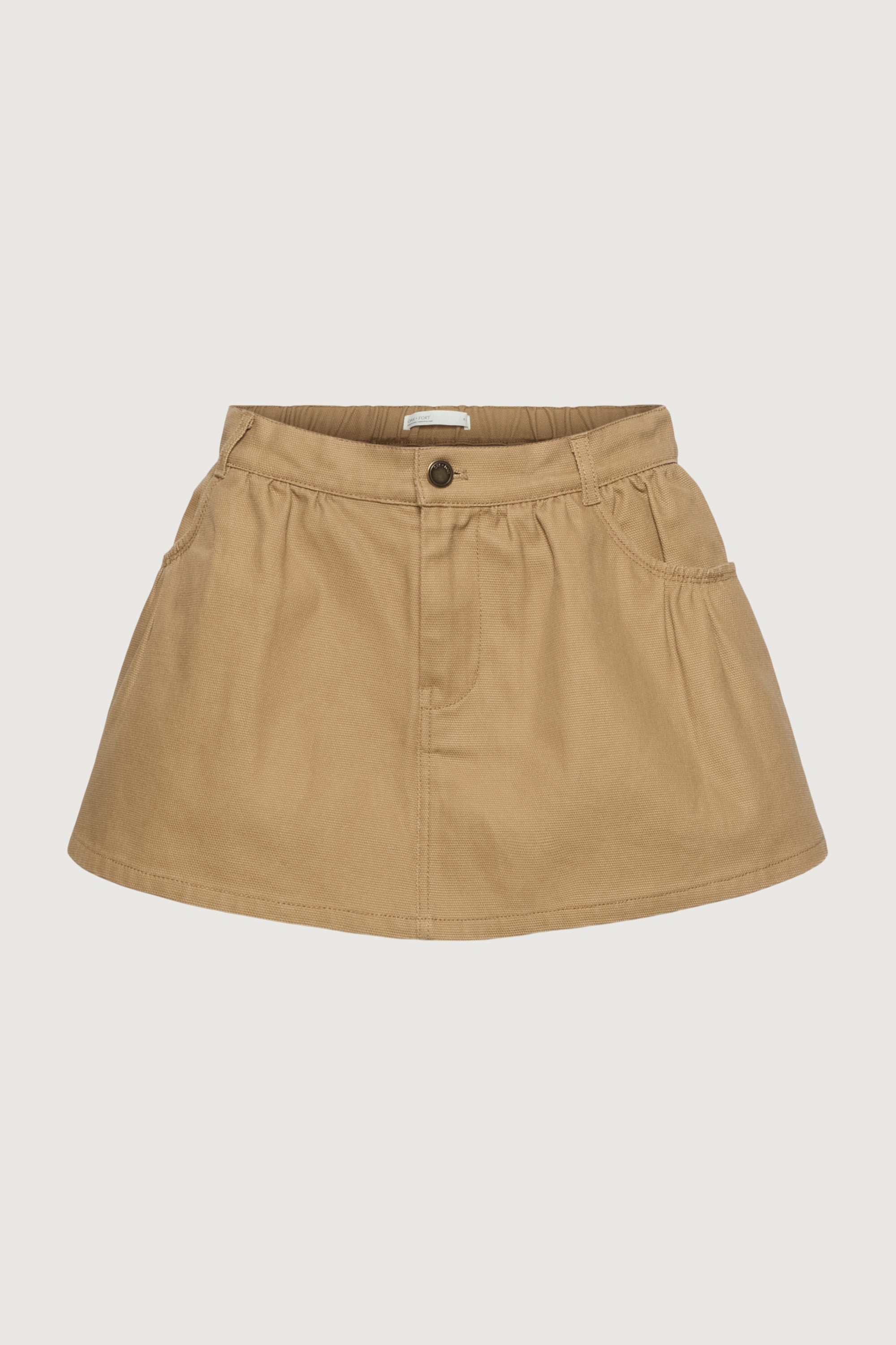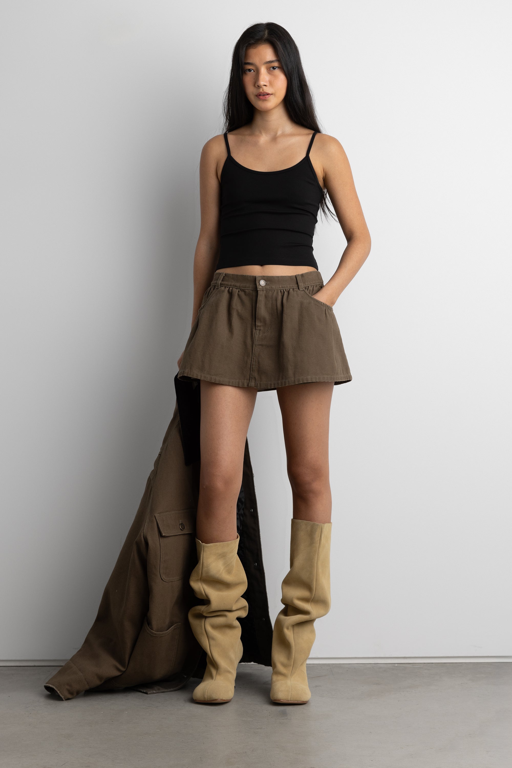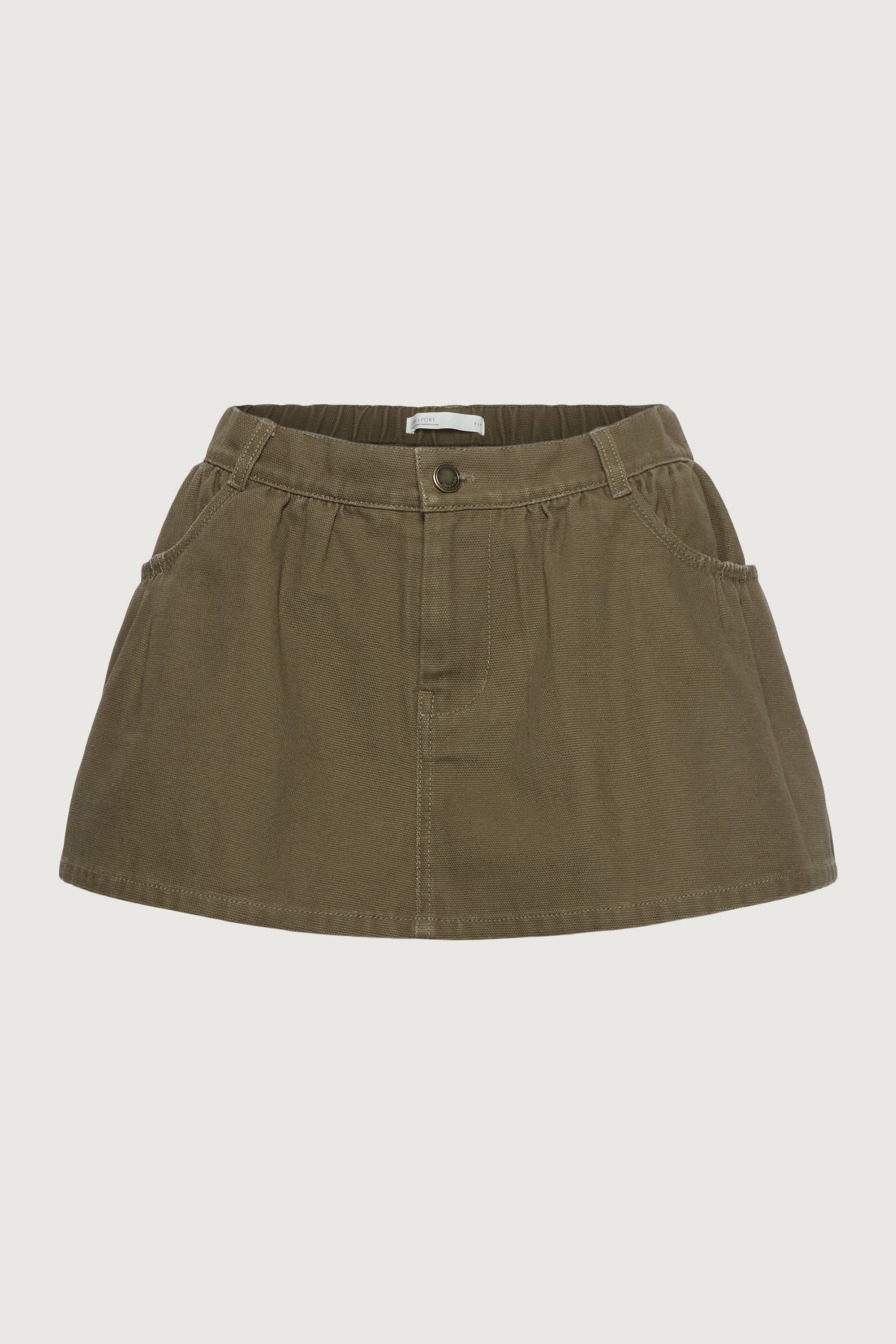 This ultra mini skirt is cut from a cotton canvas in a relaxed fit. It has an elasticated waist, back patch pockets and is lined with shorts. Wear yours as a set with the matching chore jacket and boots.