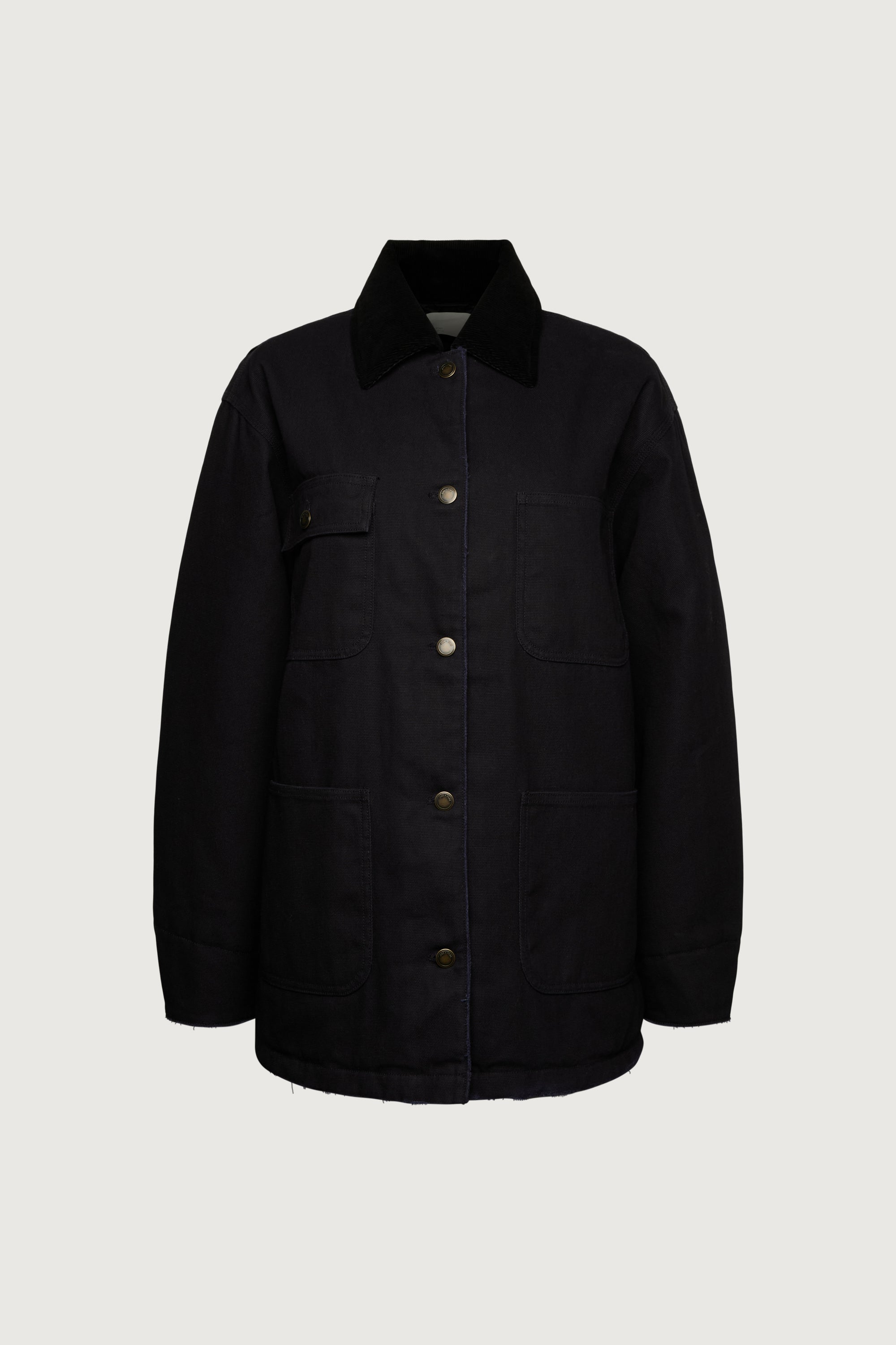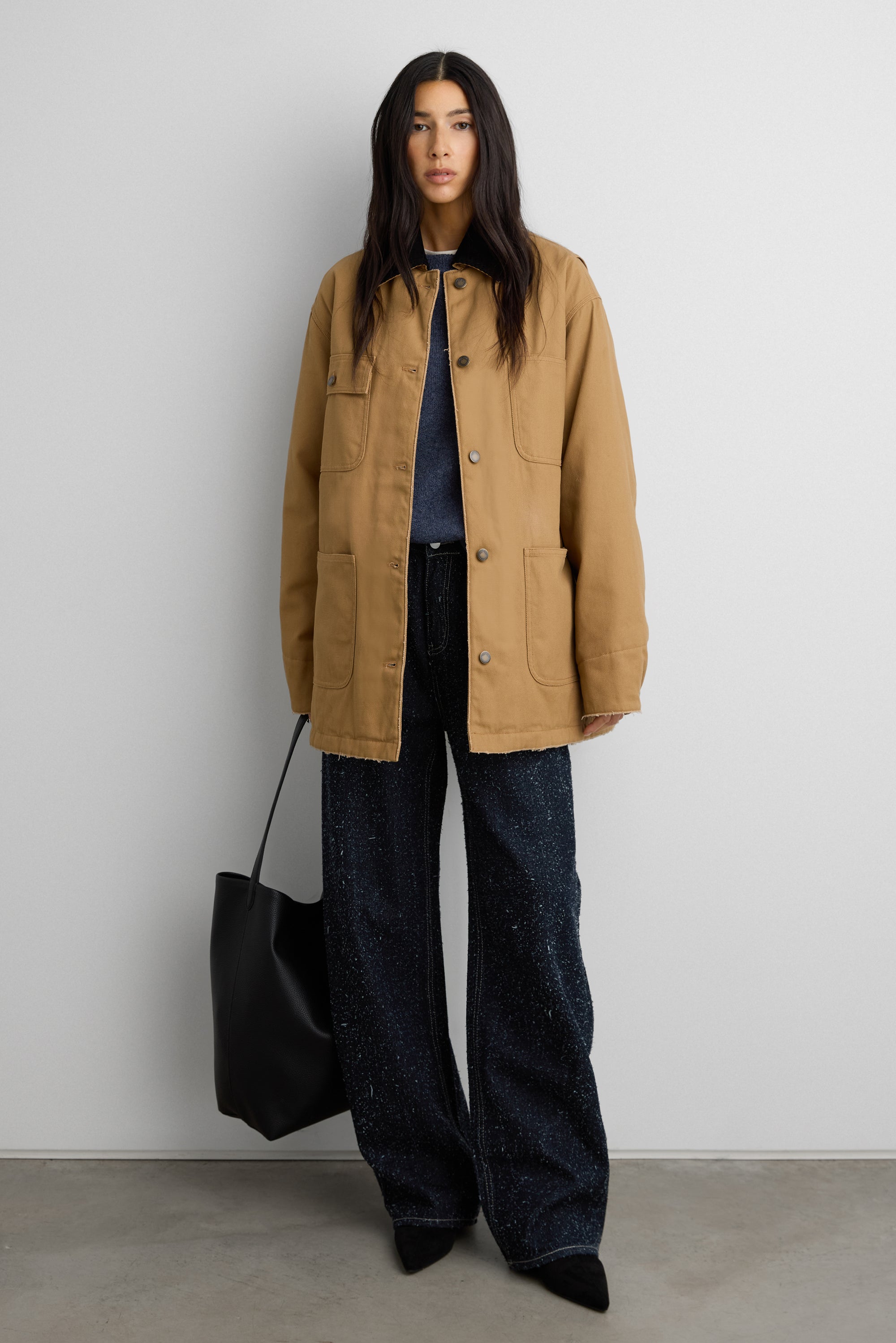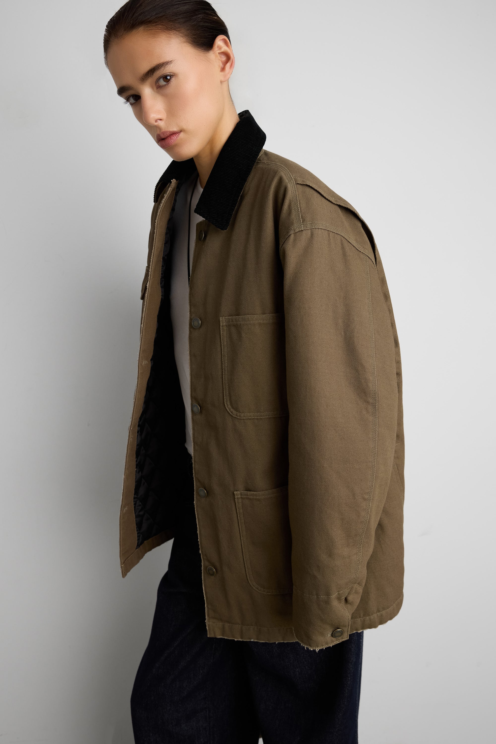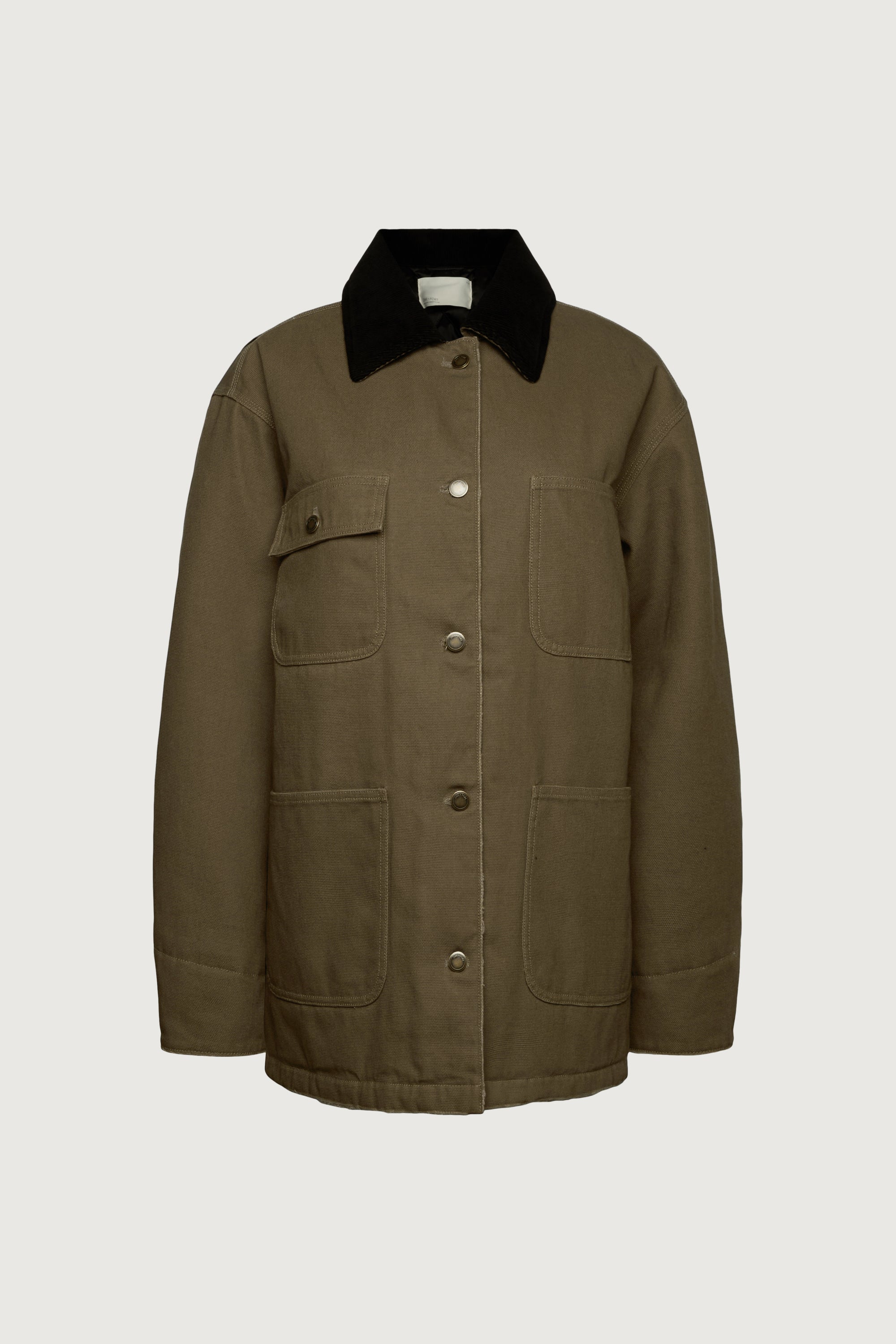 This chore jacket is made in an oversized fit and is cut from 100% cotton canvas. It's detailed with a quilted interior, four front patch pockets and has a water resistant wax finish. Add this to your weekly outerwear rotation to wear in this season and into the next.