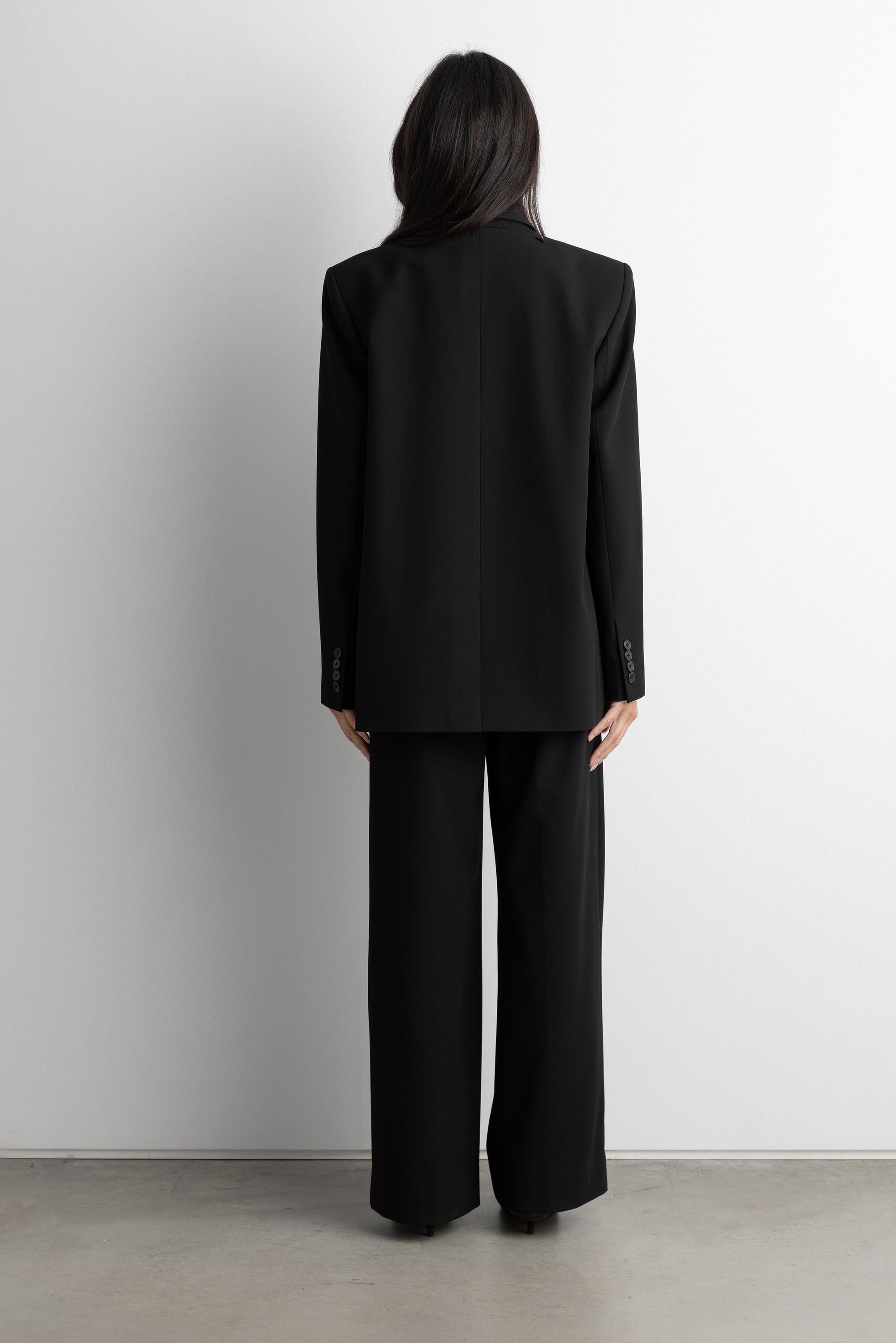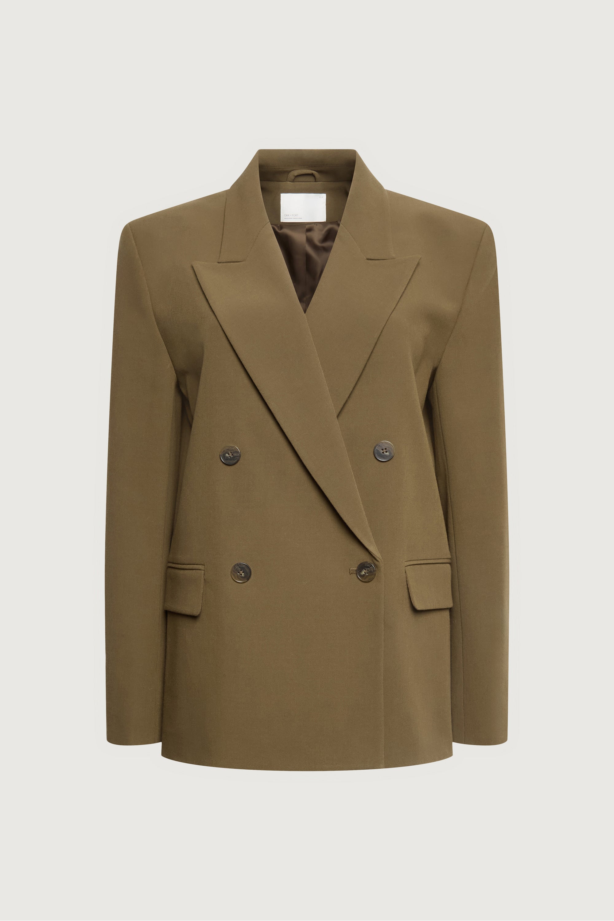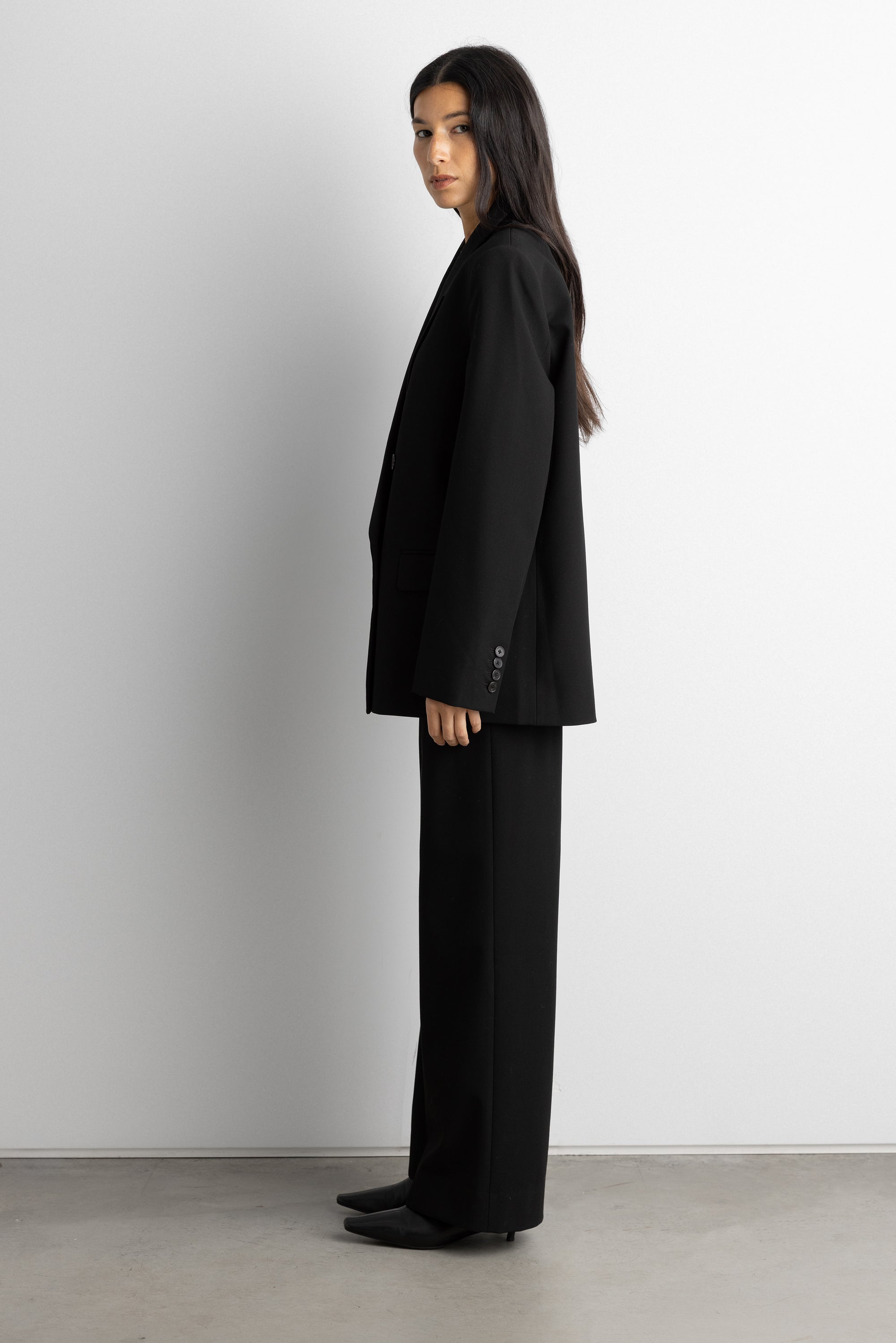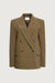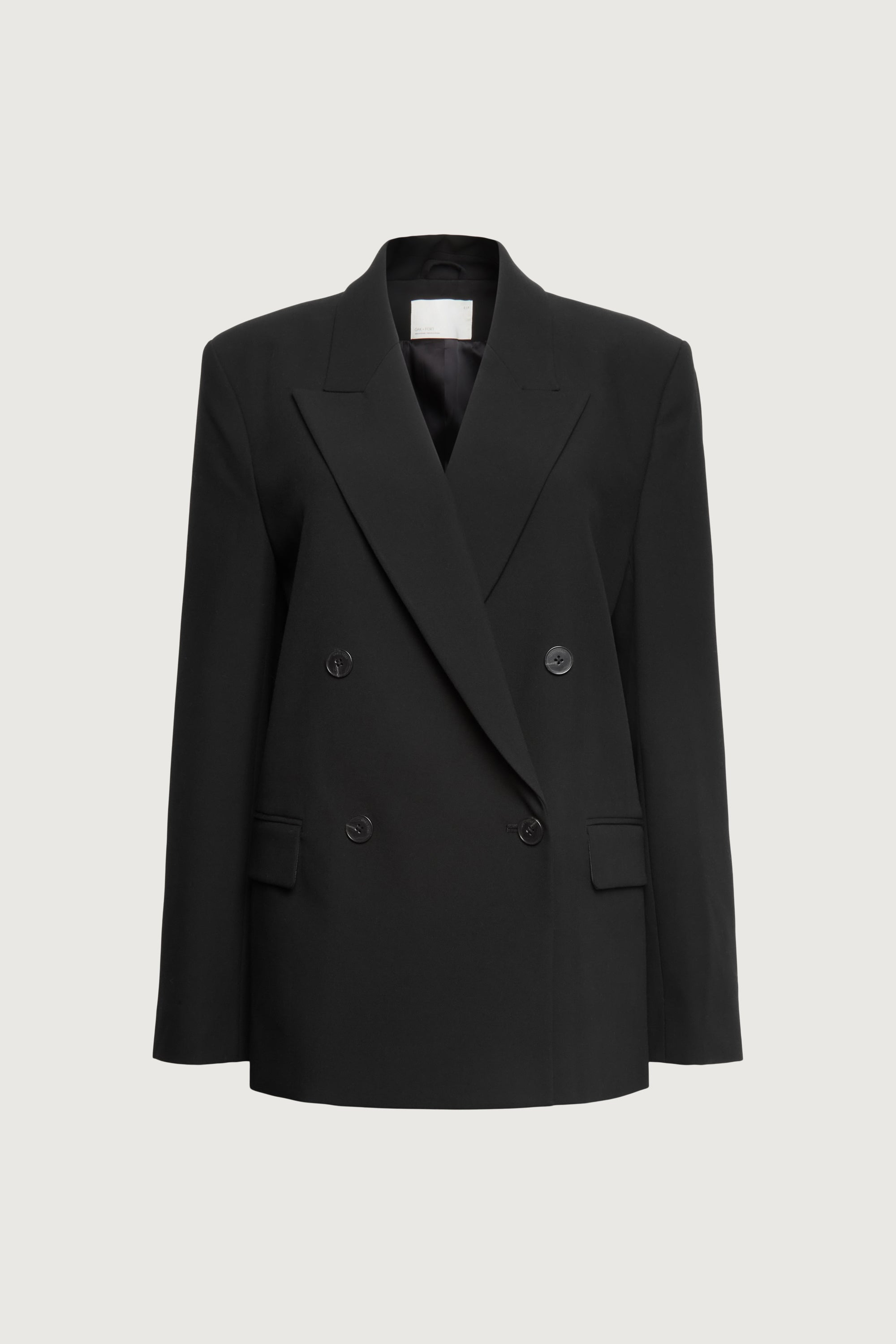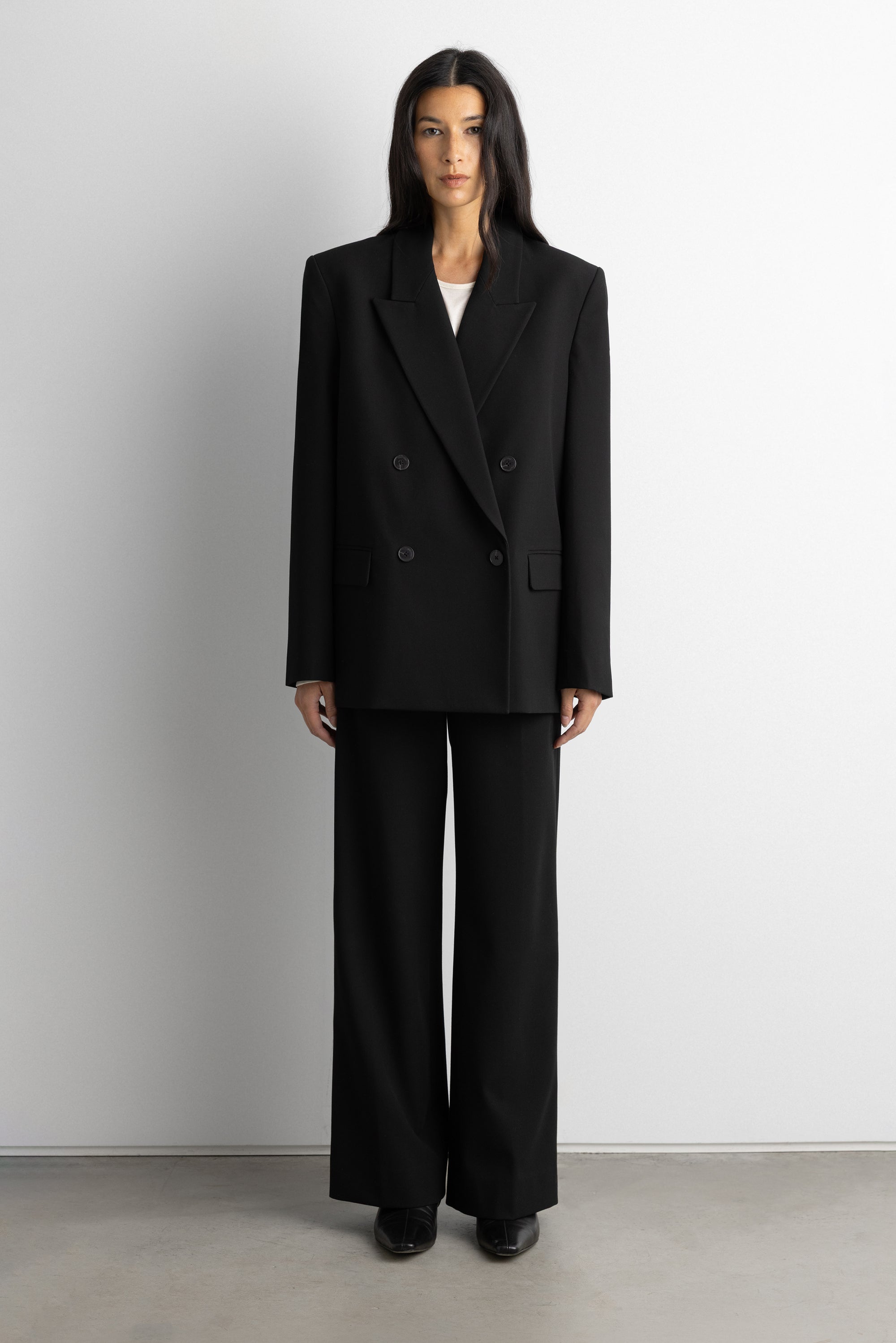 Recycled blend suiting fabric. Double-breasted front. Notched lapels. Dack vent. Padded shoulders. Satin lining.
