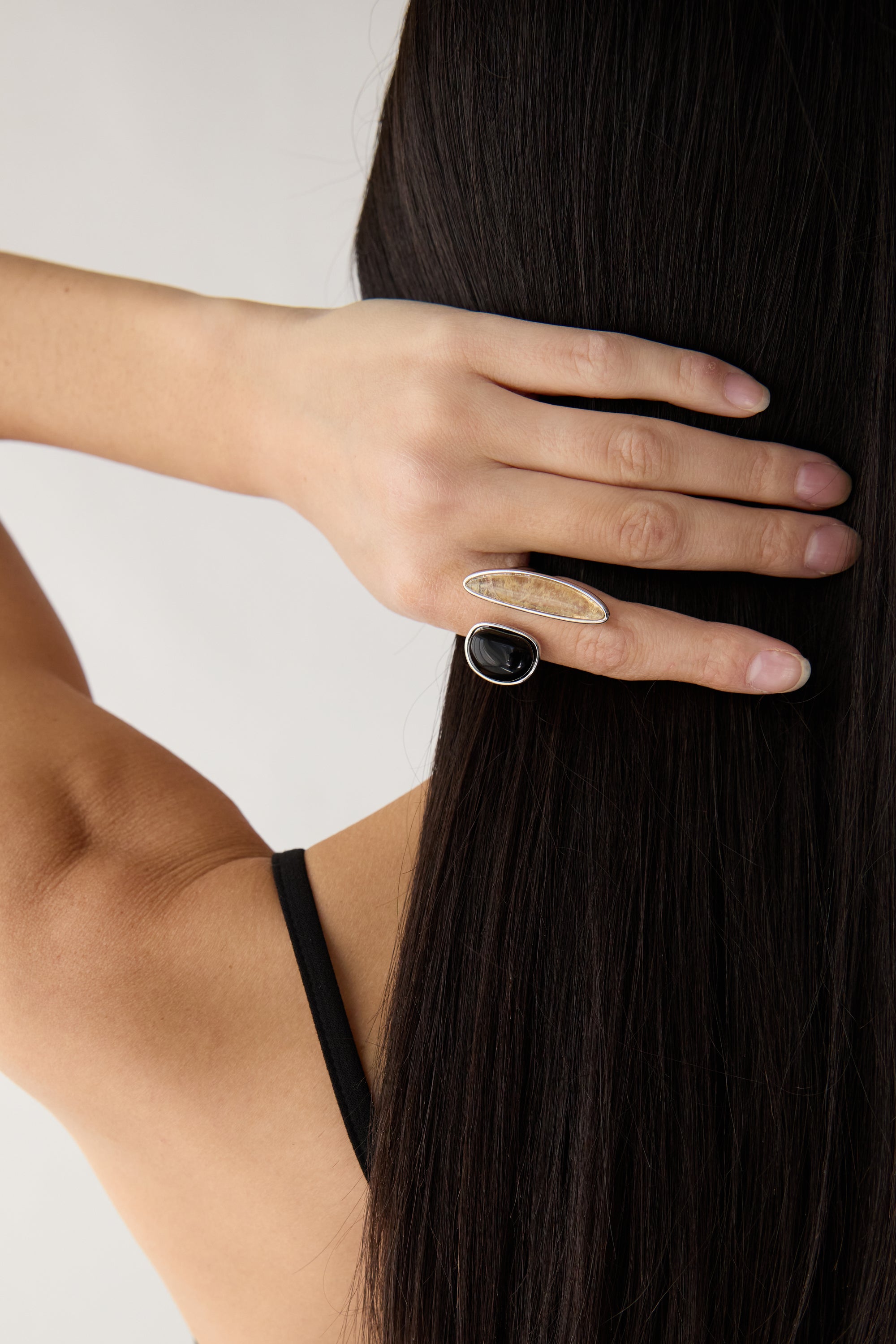 Designed with a minimalist aesthetic, this open-top ring showcases two luminous stones. —one deep black gemstone and one iridescent pearlescent accent—that sit atop the finger. Crafted for comfort and versatility, the adjustable band ensures a perfect fit for any finger. Whether worn alone for a statement or stacked with your favorite rings, this piece brings effortless detail to any outfit.