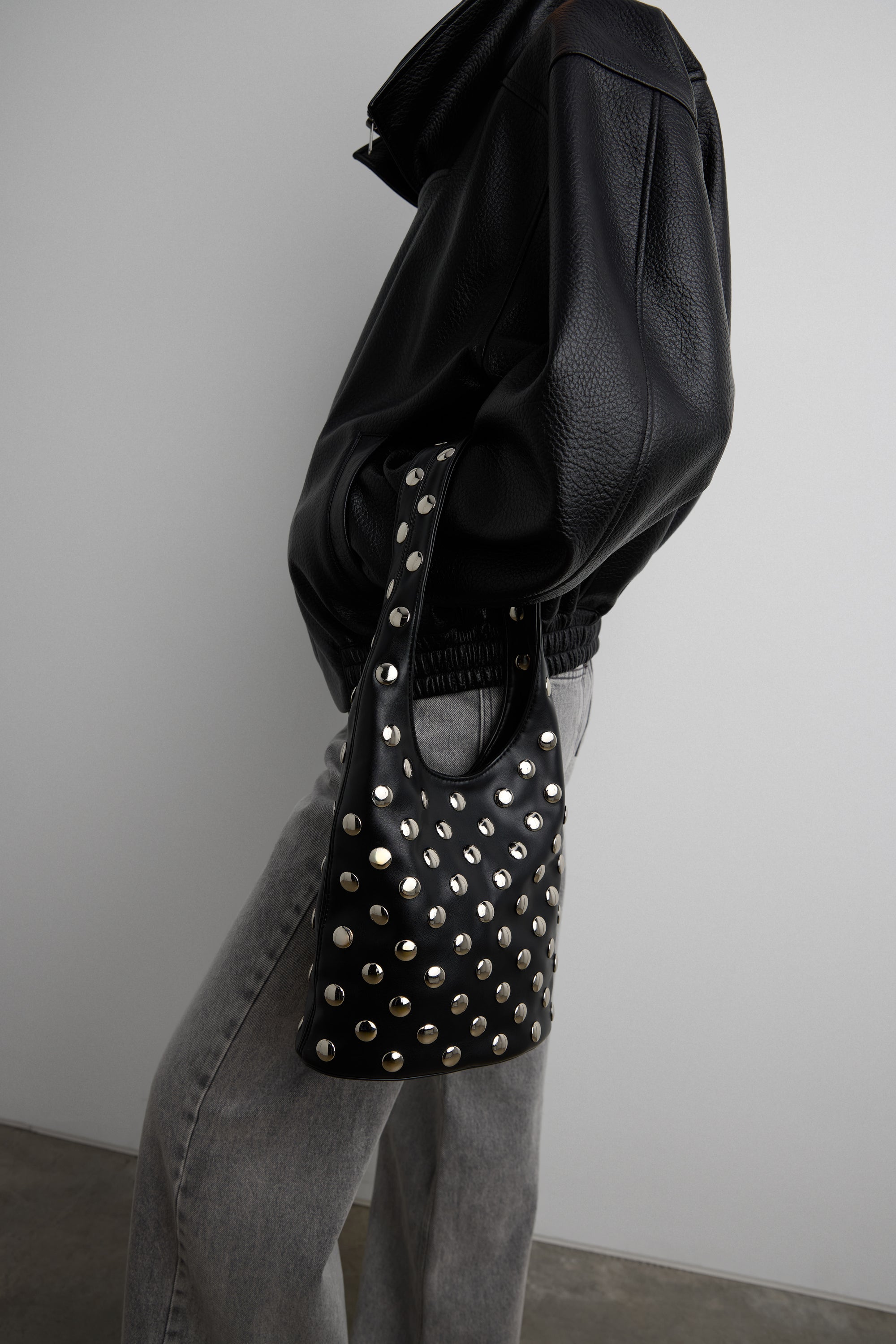 All-over stud embellishment. Slouchy silhouette. Magnetic closure.