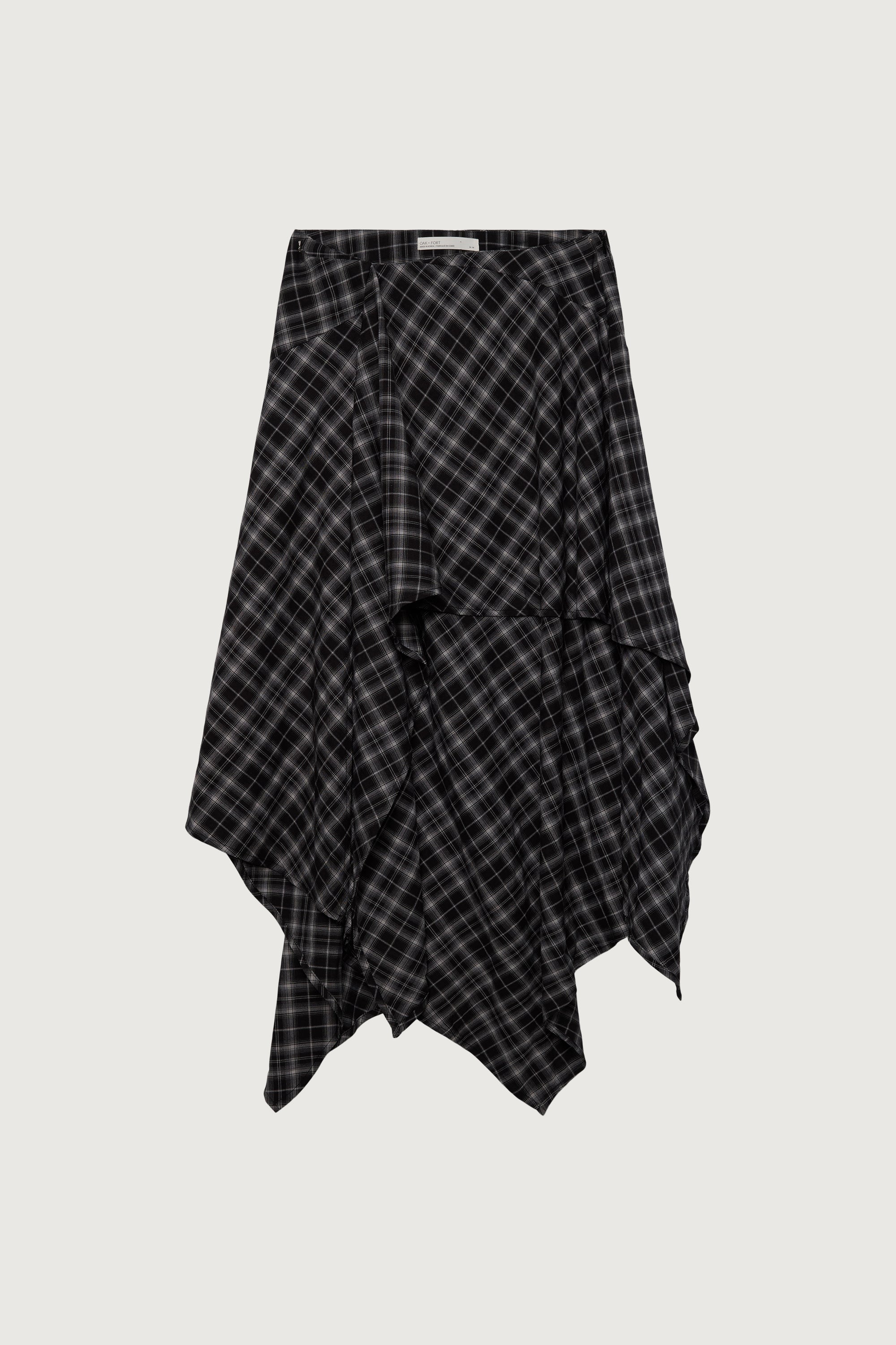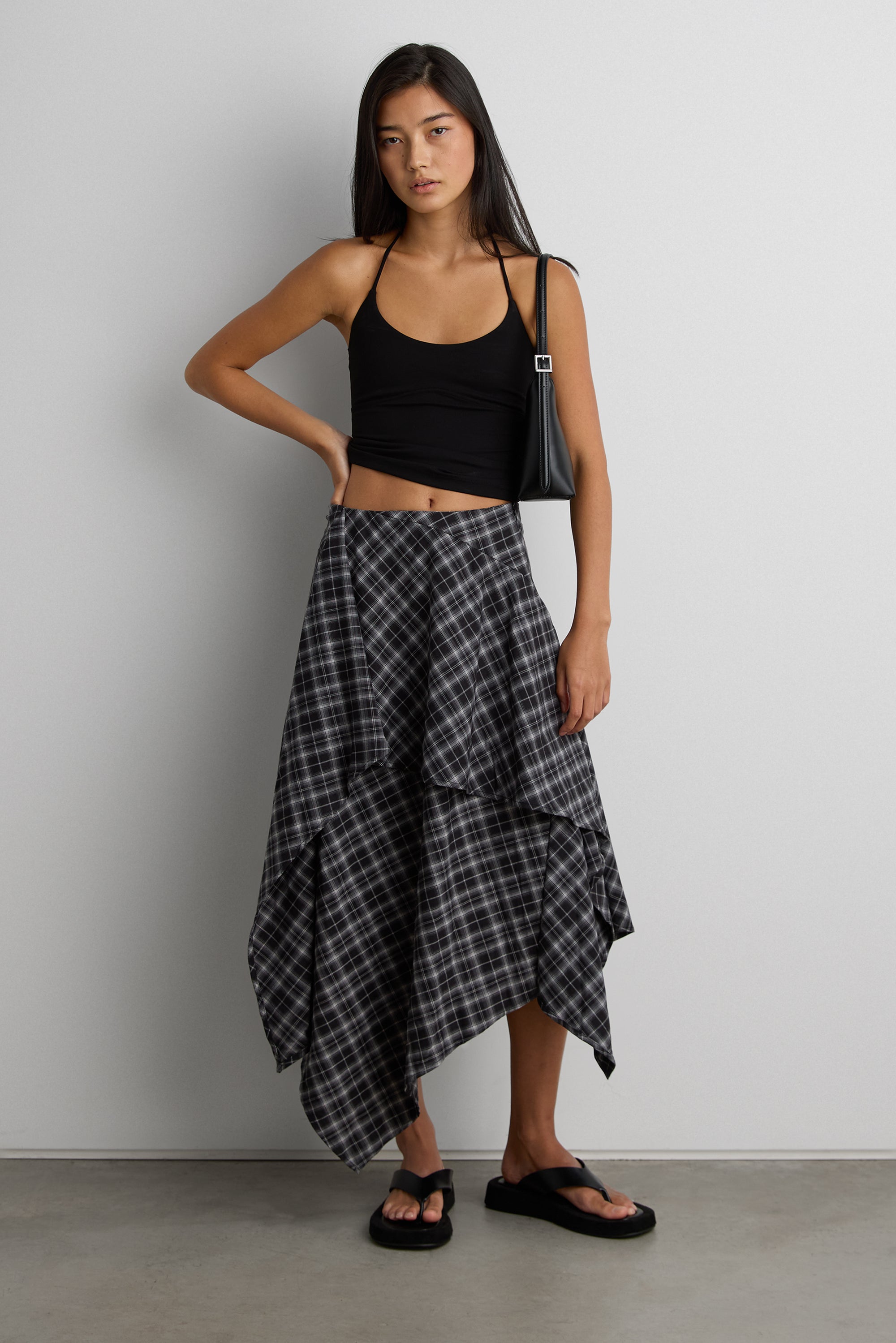 This midi skirt features an asymmetrical hem with soft draping that creates fluid movement through the silhouette. The plaid pattern adds subtle structure, while the layered design gives the piece a directional, styling-forward feel.