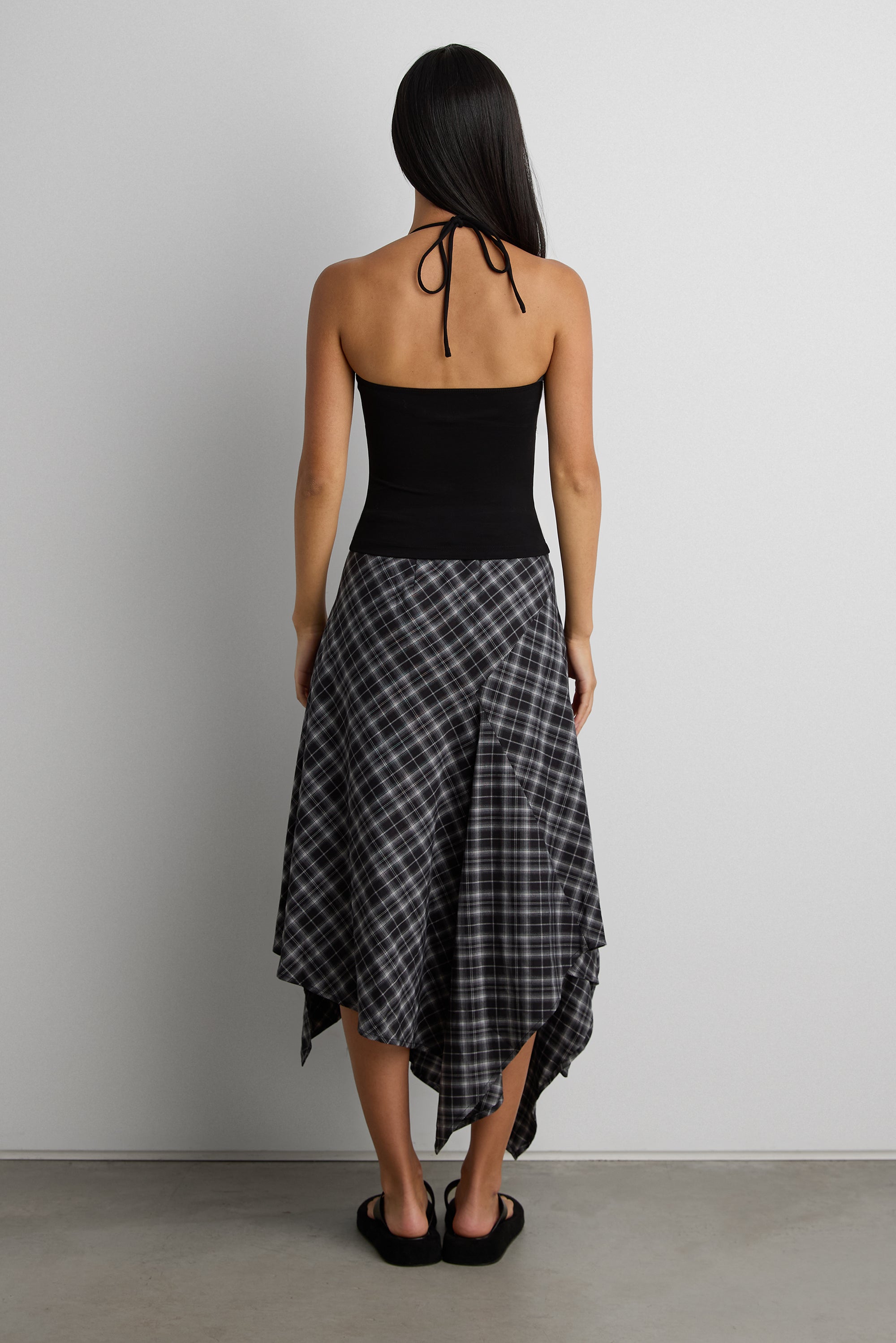 ASYMMETRICAL DRAPED PLAID MIDI SKIRT