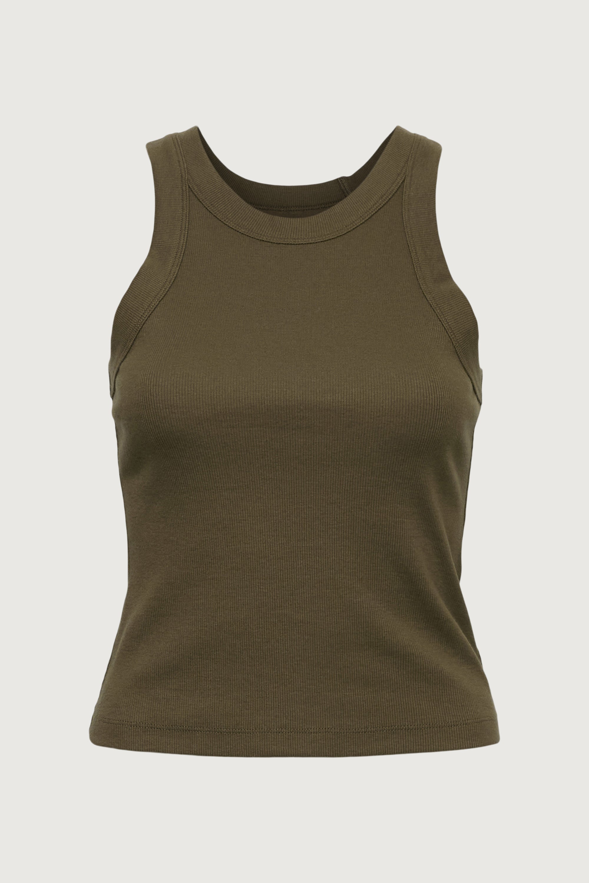 This ribbed tank top features a high neckline with thick trims. It's made in a slim fit with an ample amount of stretch. It's the perfect tank top as a base for styling outfits.