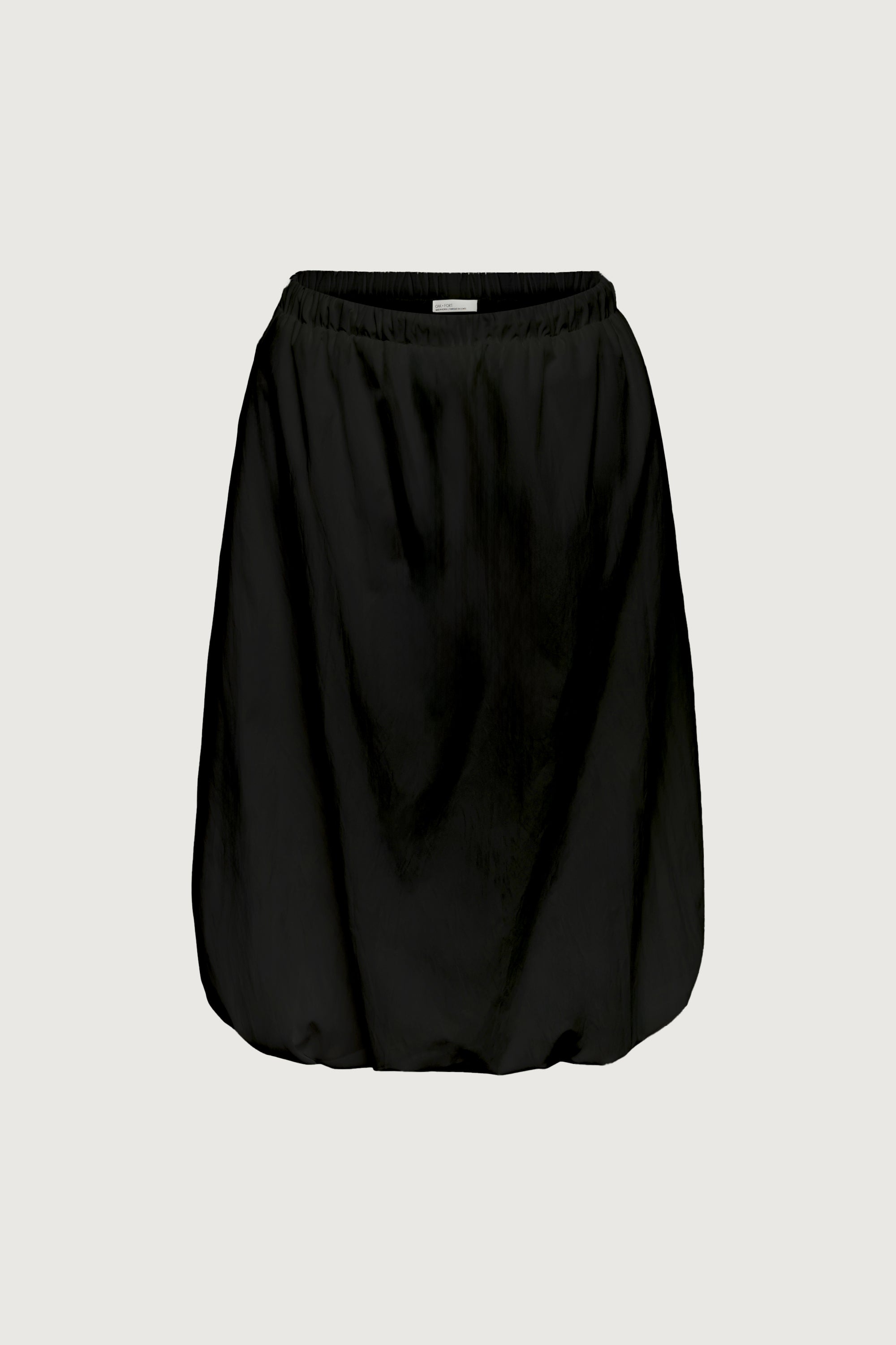 Bubble hem. Midi length. Elastic waistband. Interior drawstring. Nylon blend.
