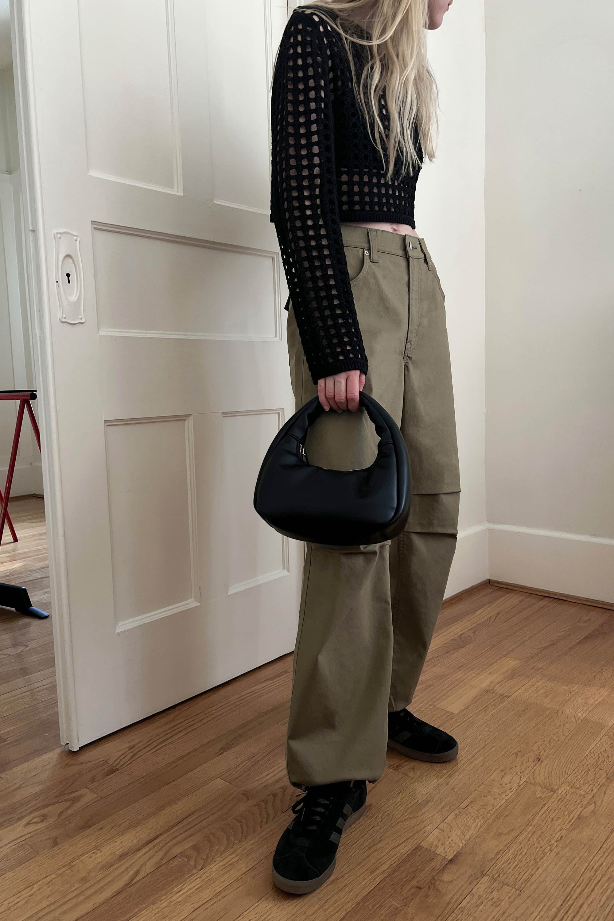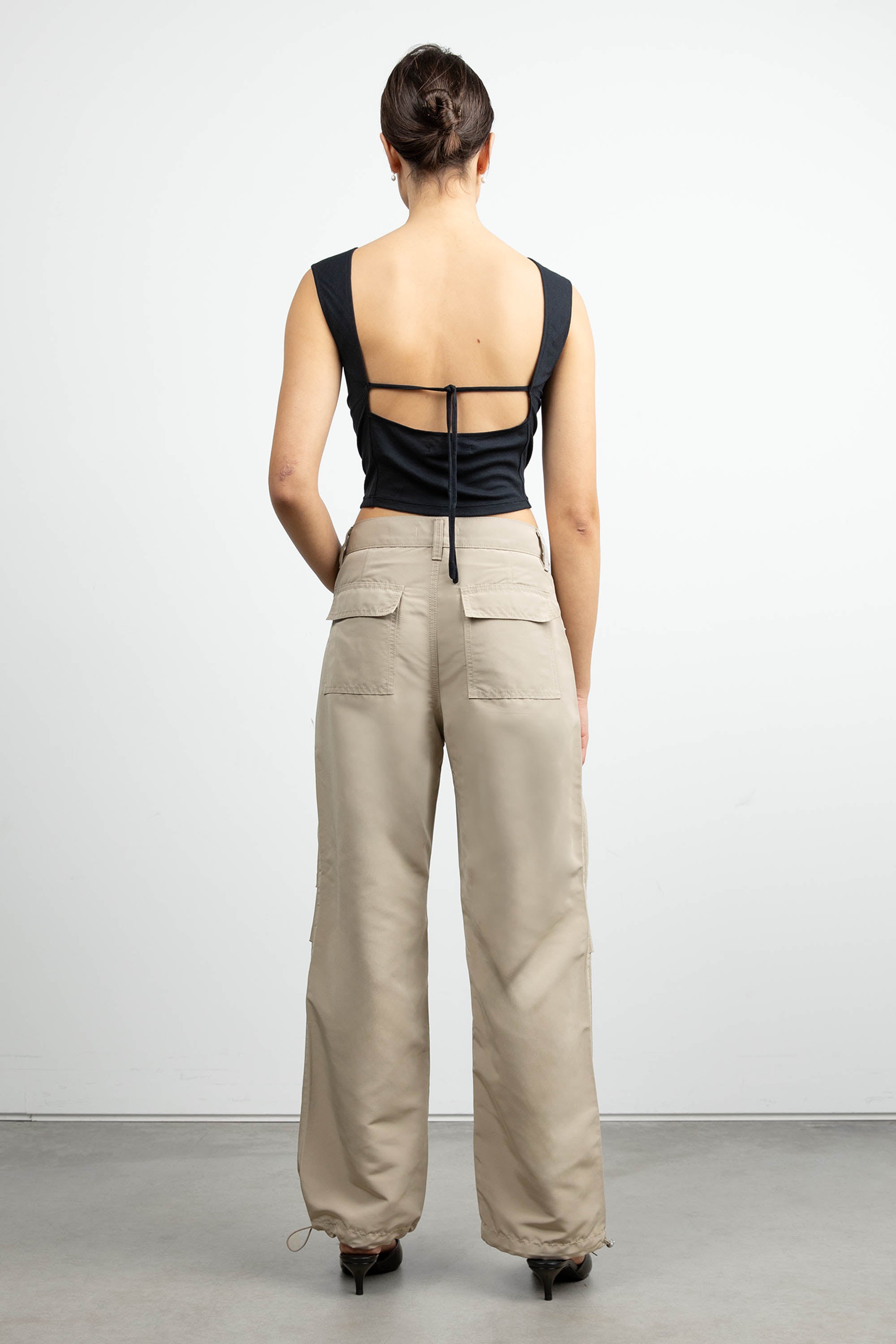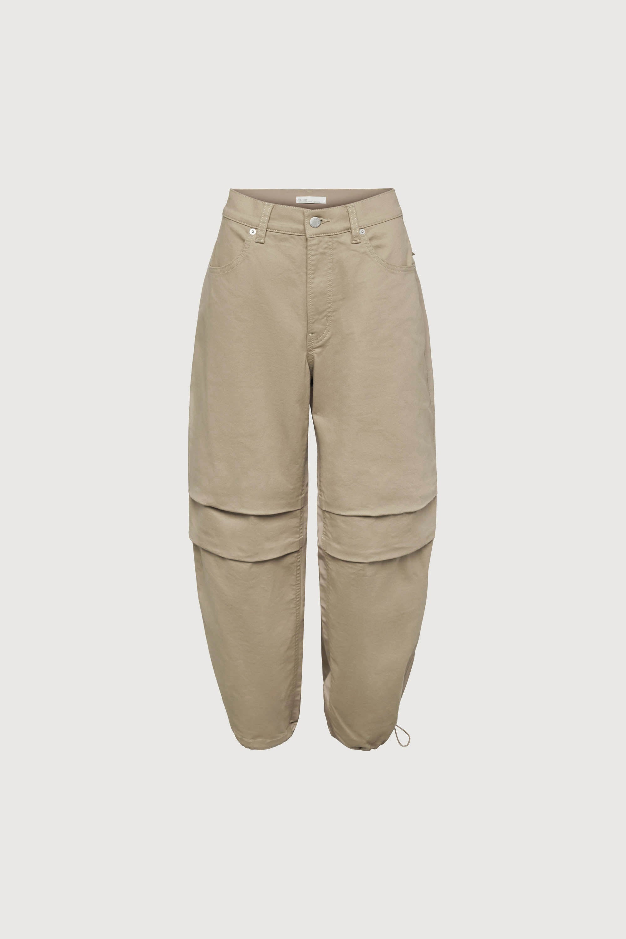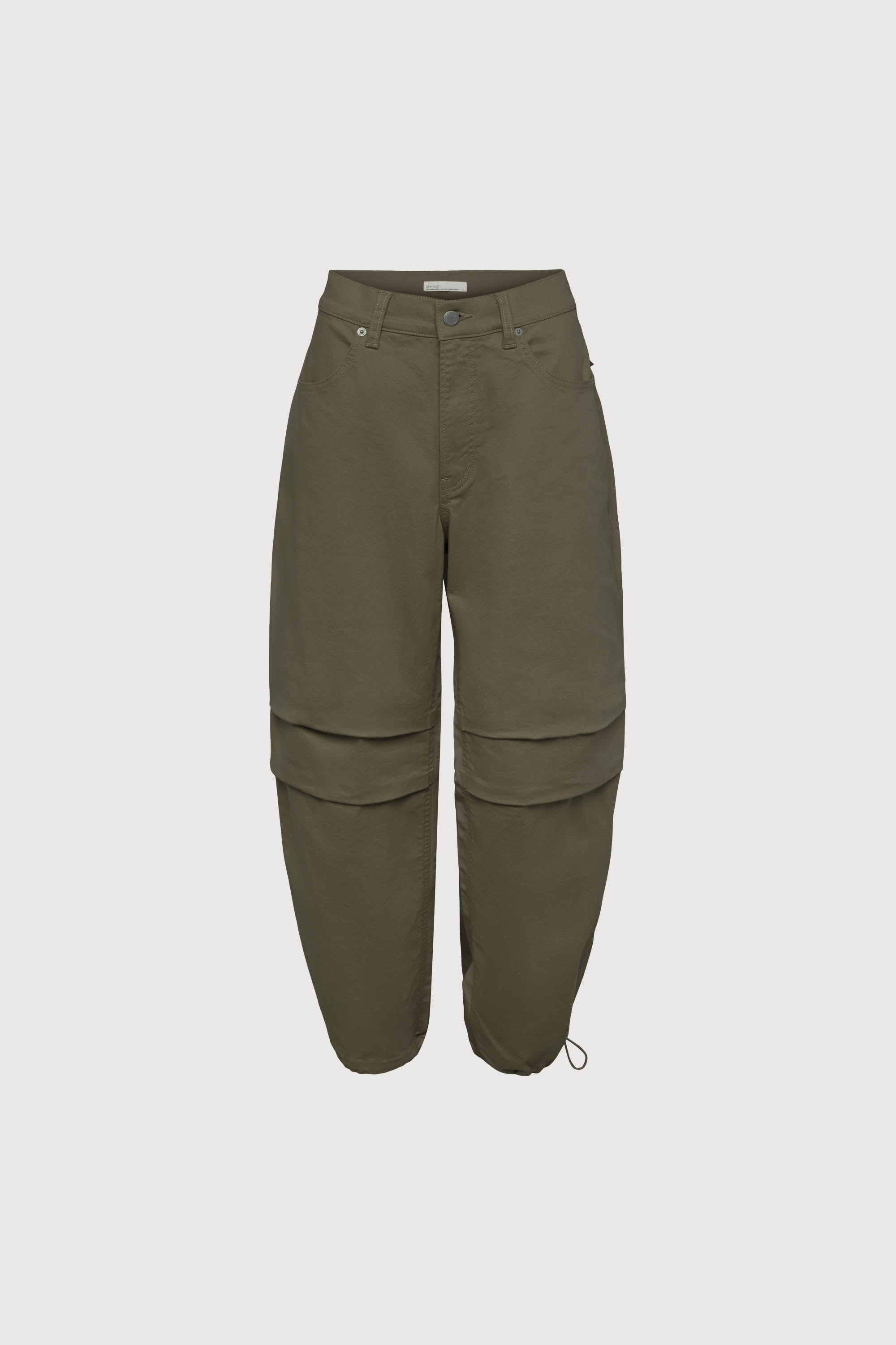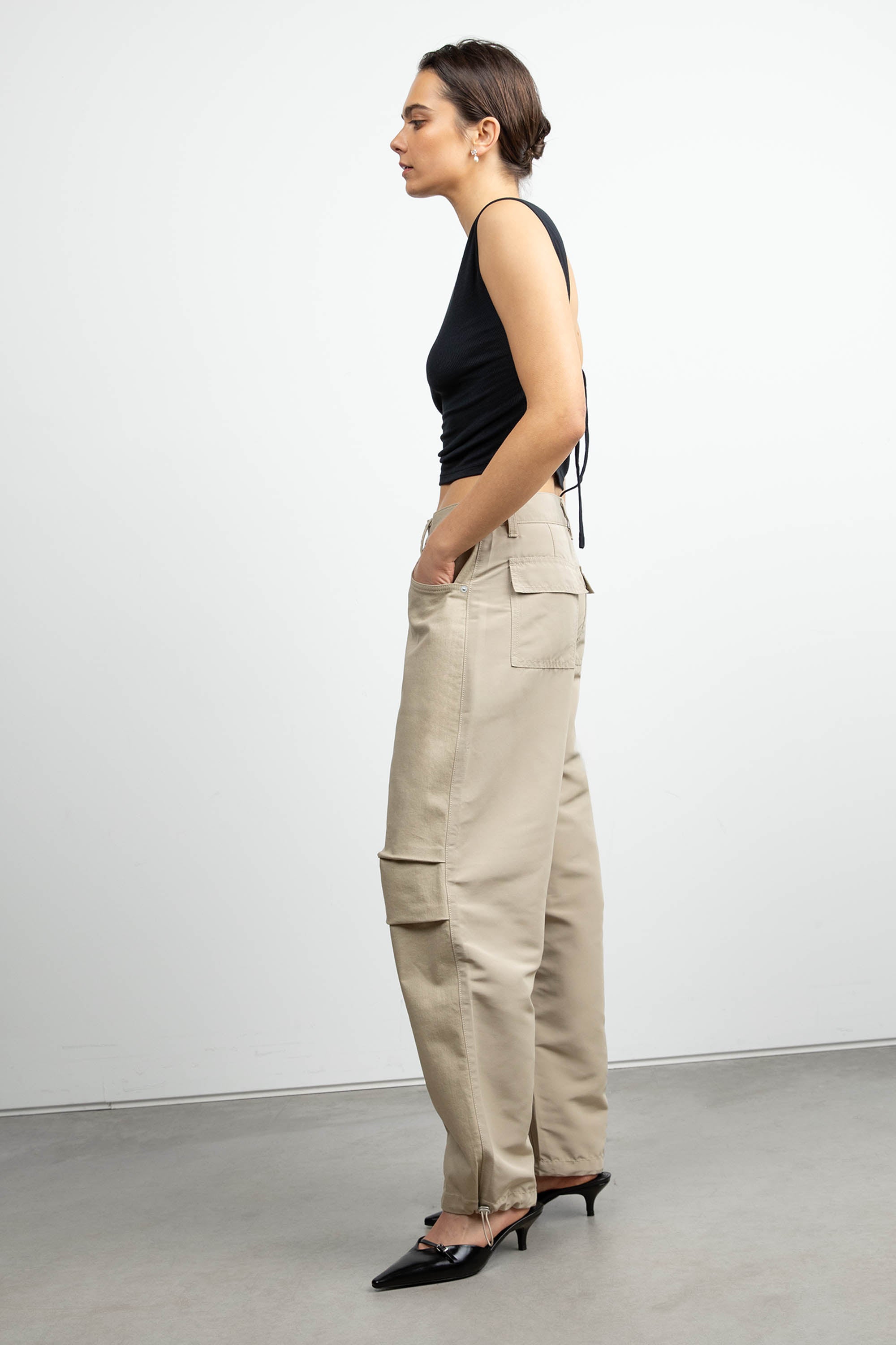 These double-faced cargo pants have a cotton twill front and a lightweight nylon-like fabric at the back. It's made in a relaxed fit with a mid-rise waist and wide leg cut. It's detailed with knee pleats and elasticated hems with shockcords.