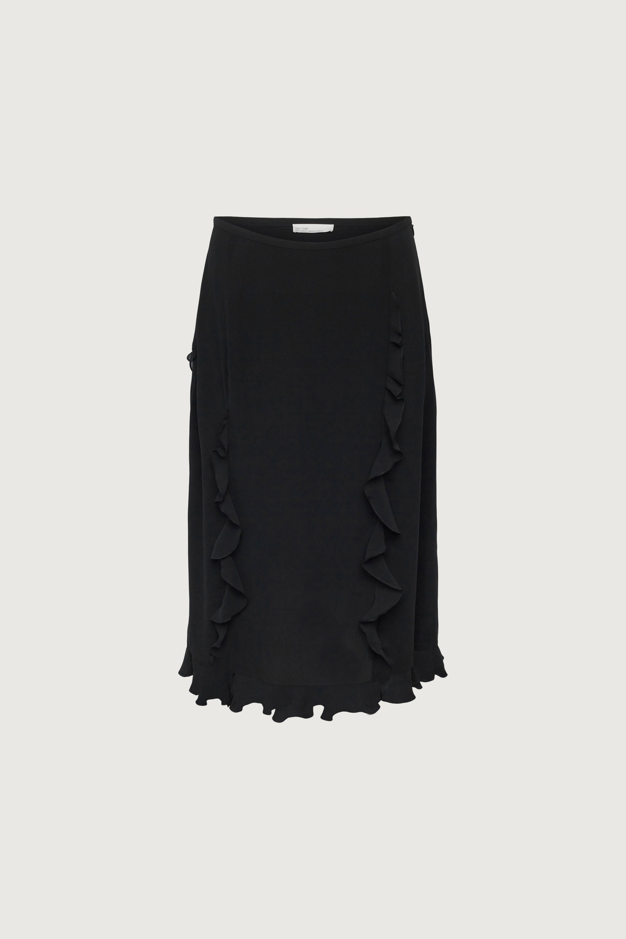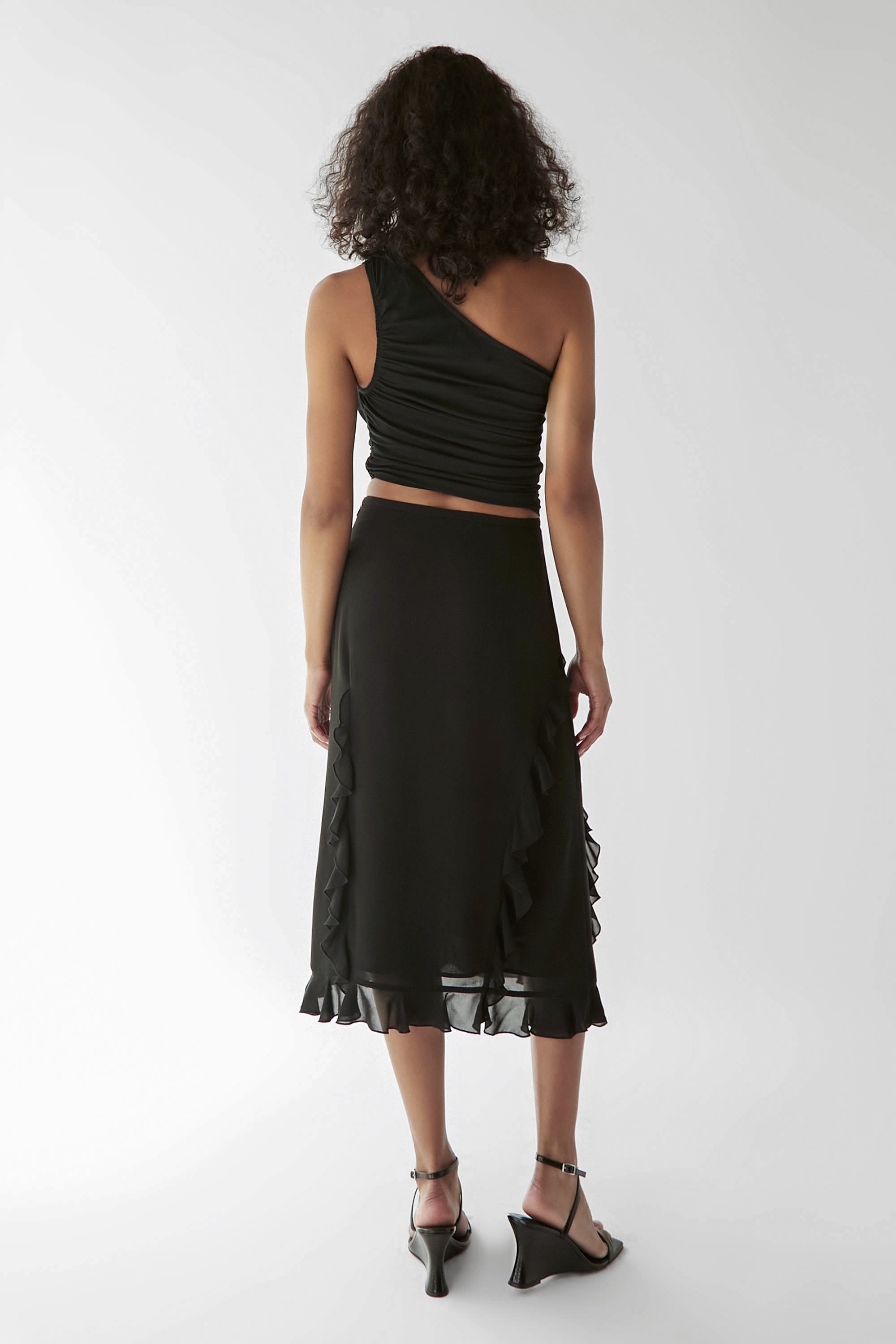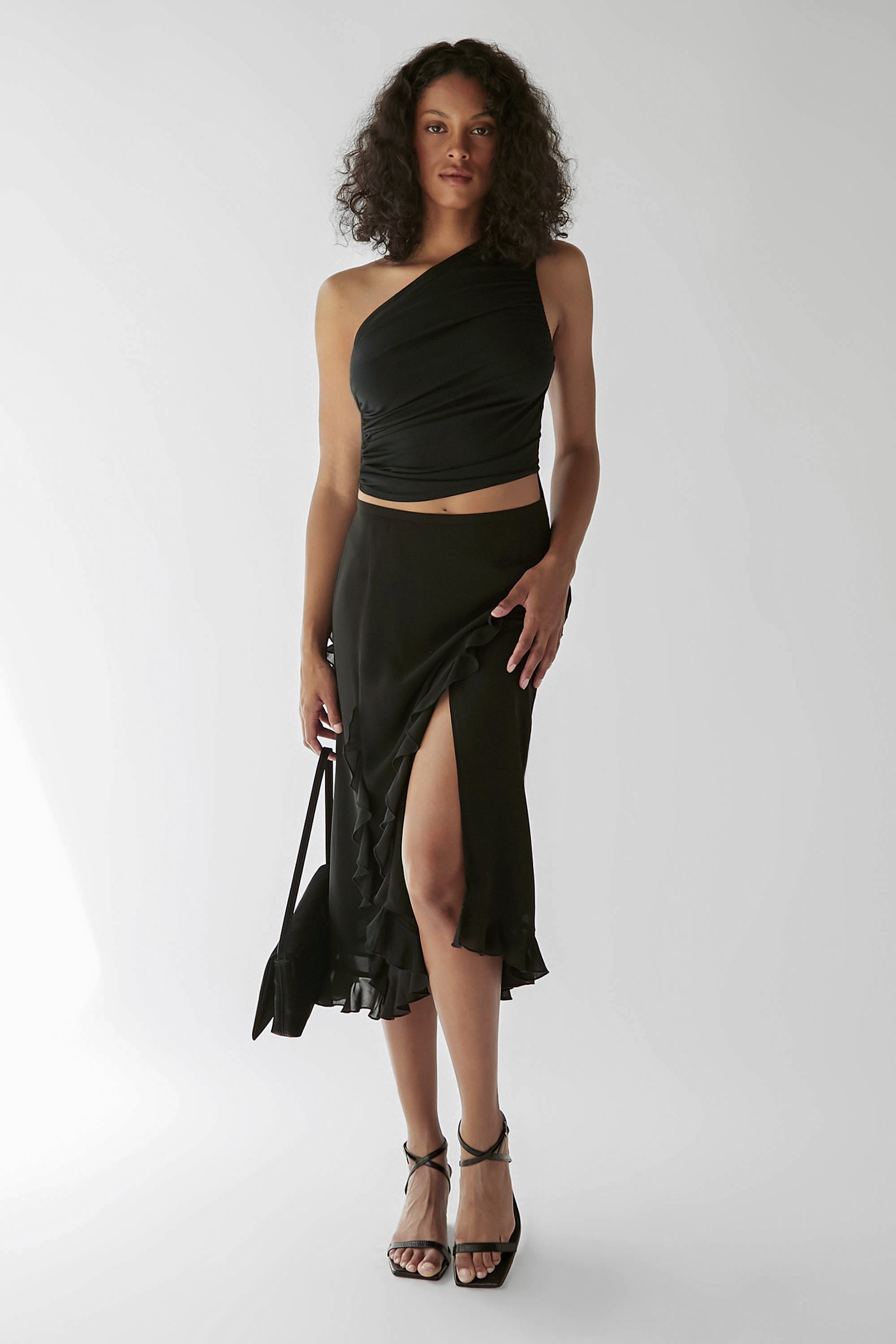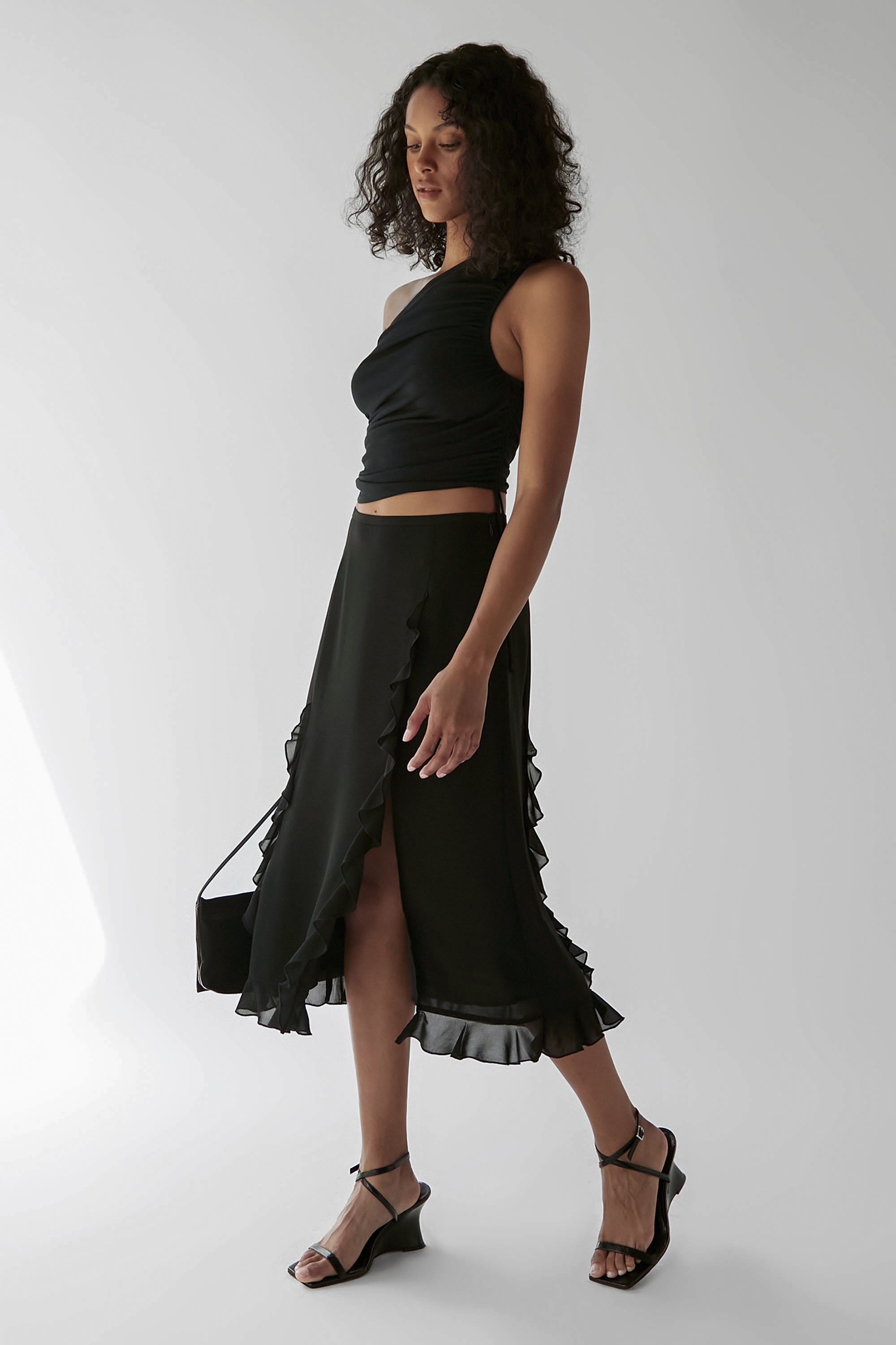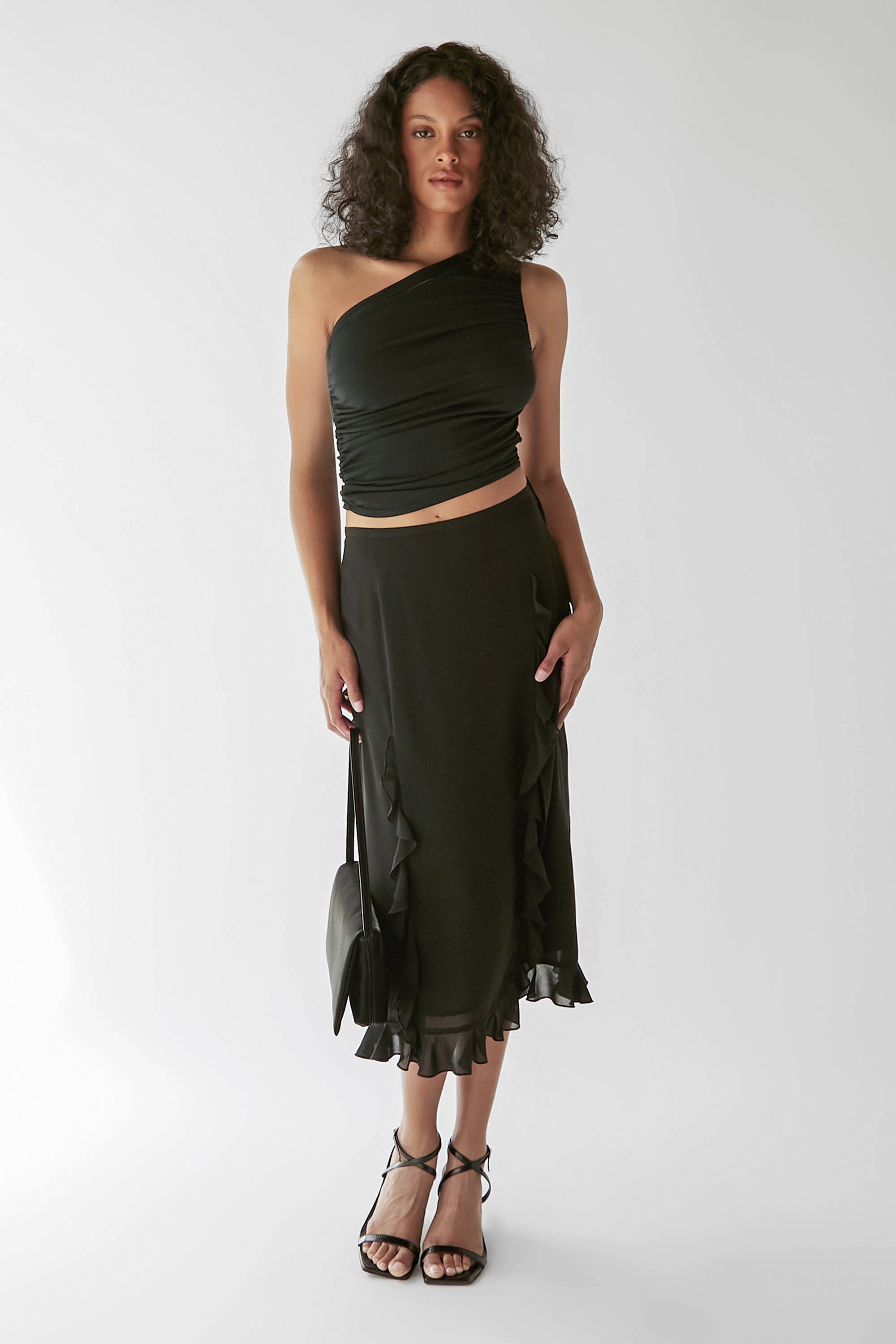 This chiffon midi skirt is detailed with ruffles down the front and along the hem. Wear yours with an off the shoulder top and kitten heels.