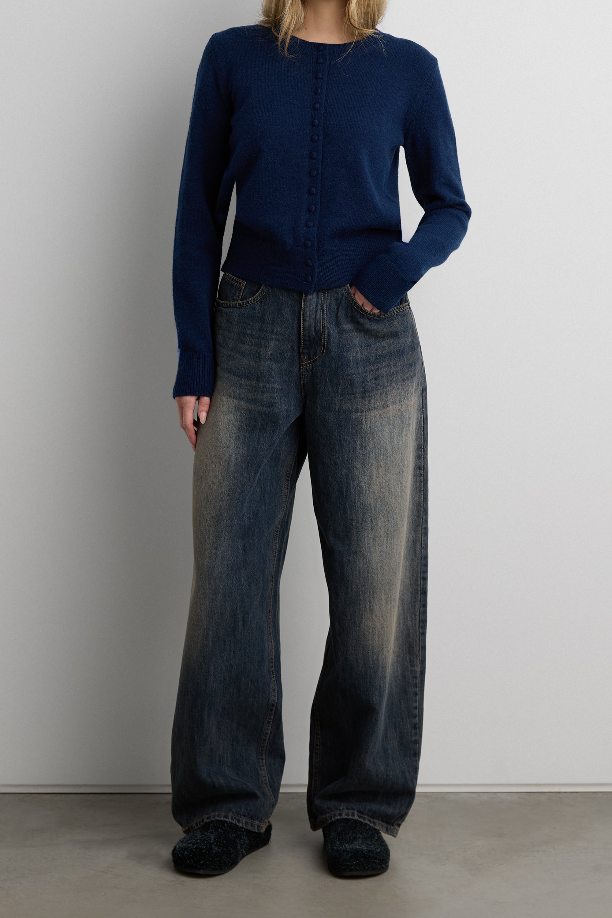 This classic fit cardigan is made with touches of wool for added warmth and softness. It features ribbed trims and covered buttons for a tonal look.