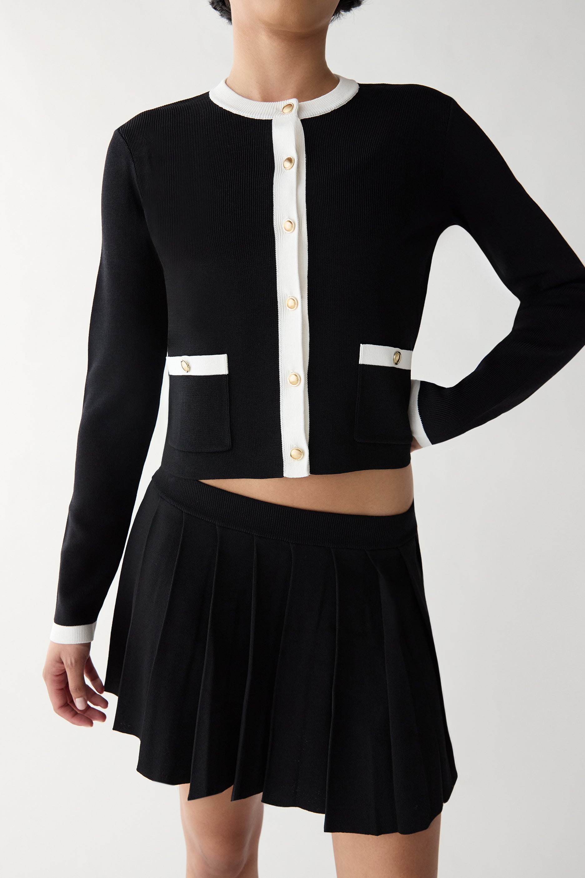 This button front cardigan is made from a drapey knit fabric in a classic fit. It's detailed with gold buttons, front patch pockets and contrast trims along the trims. Wear yours as a set with the matching mini skirt.