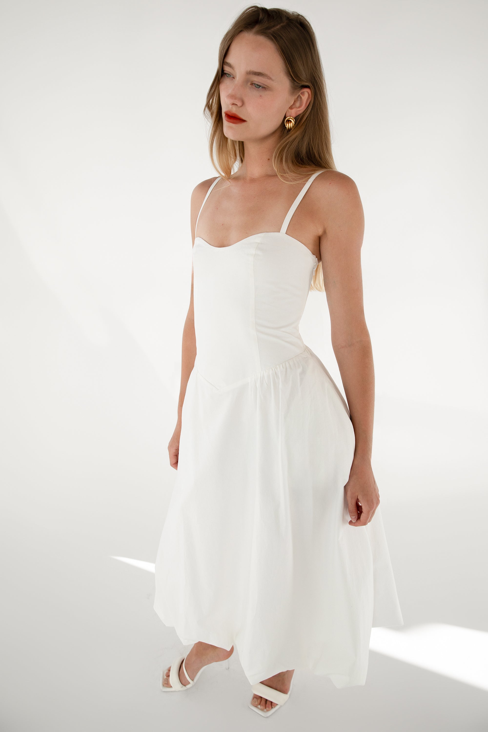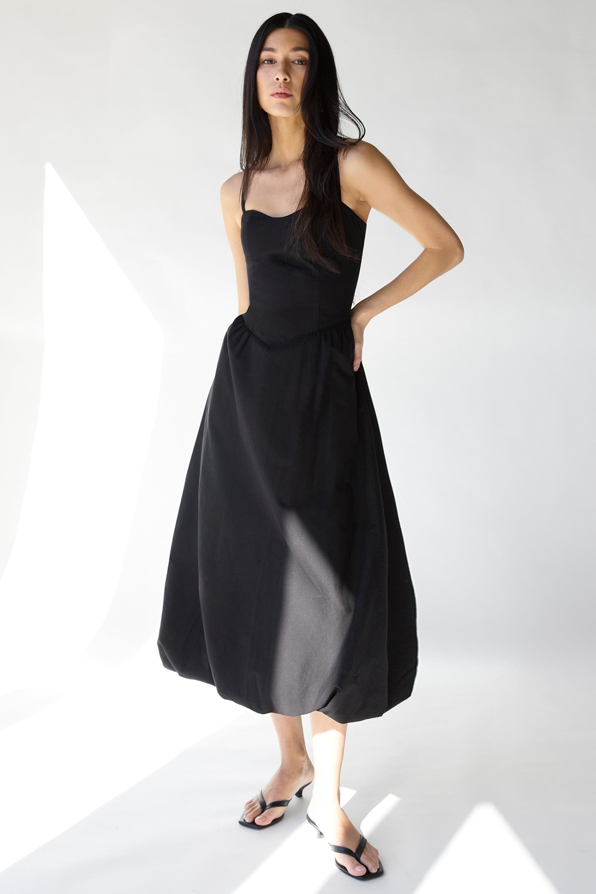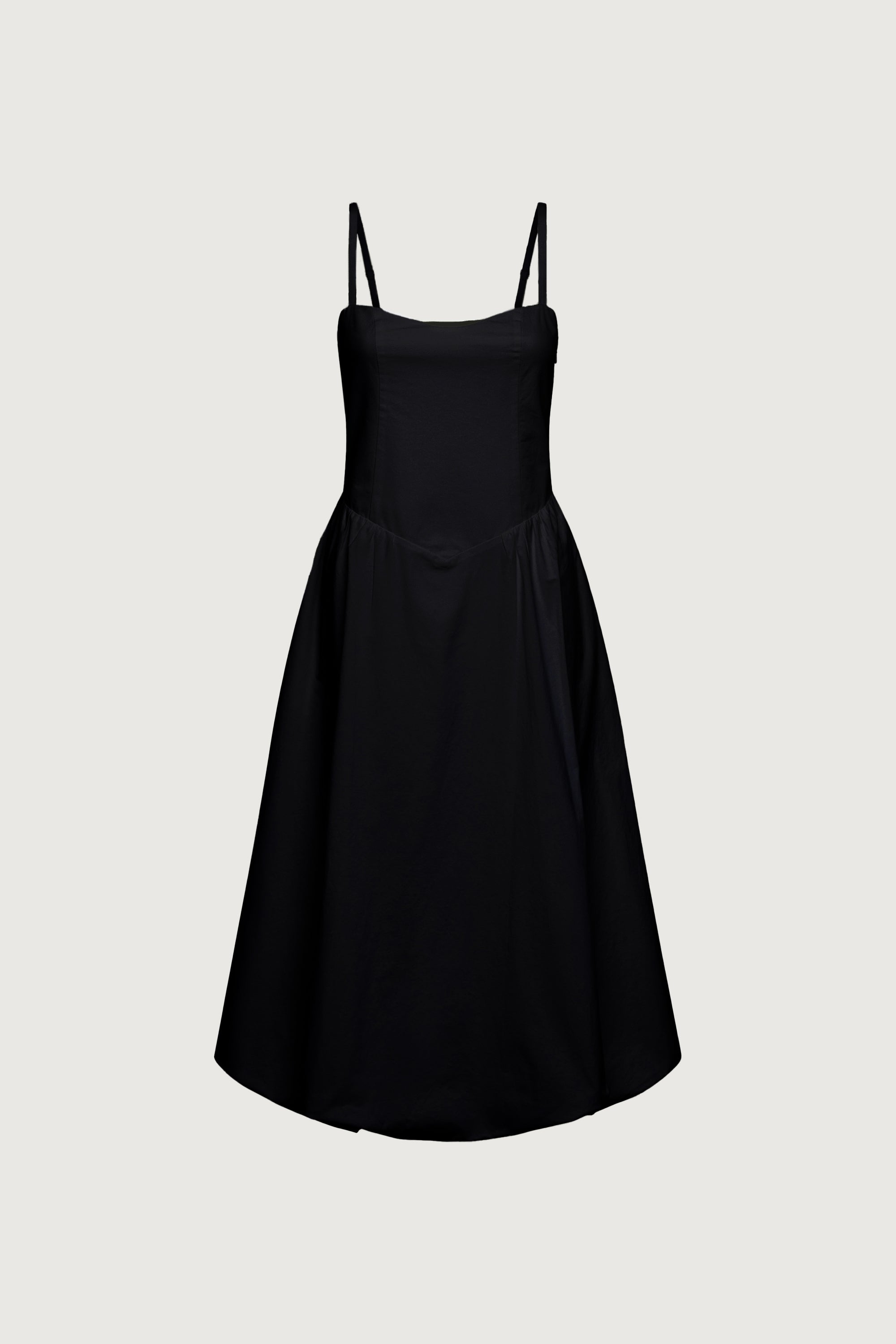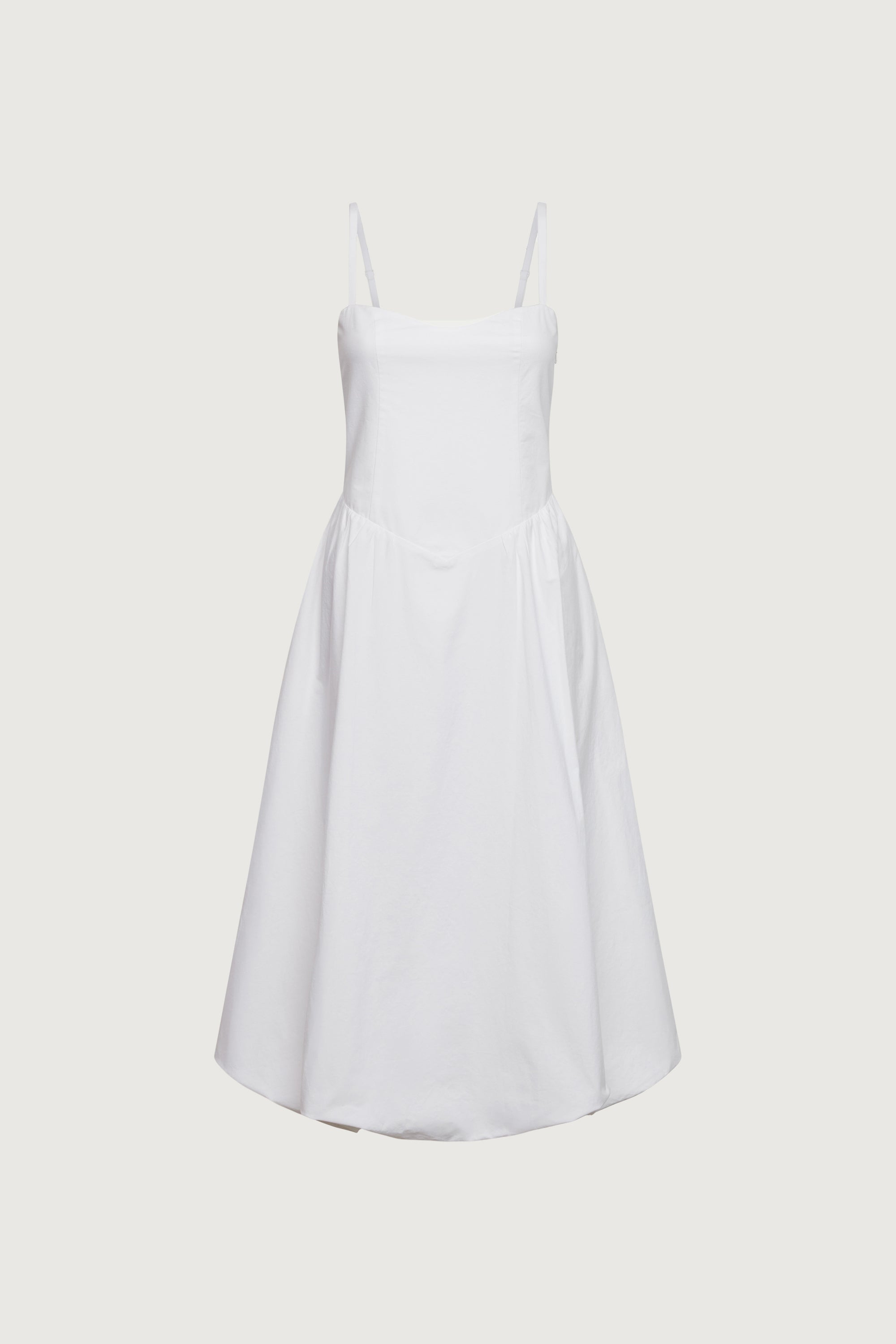 COTTON POPLIN V-WAIST BUBBLE HEM MIDI DRESS