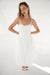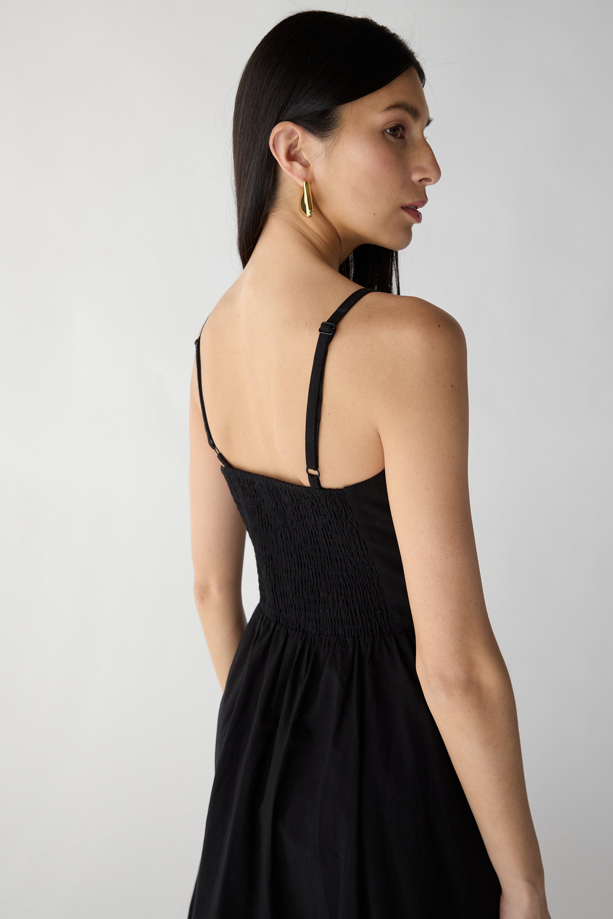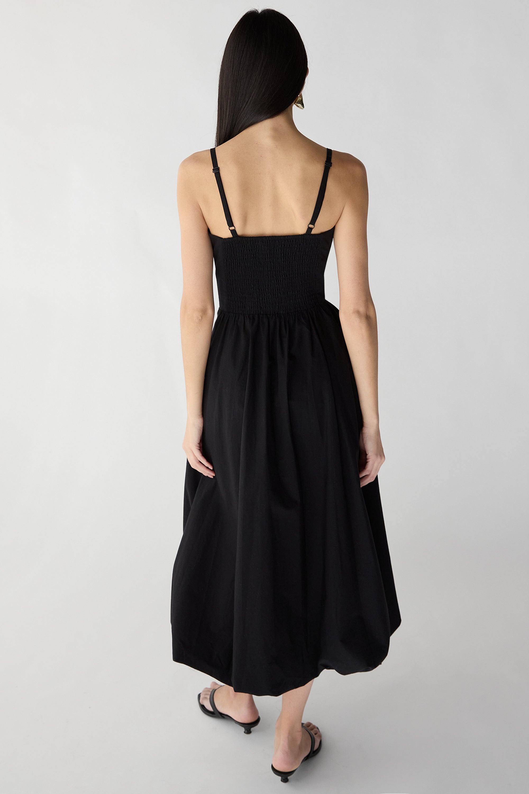 Cotton poplin. Sweetheart neckline. Adjustable straps. Smocked back with side zipper. V-waist with gathering. Bubble hem.