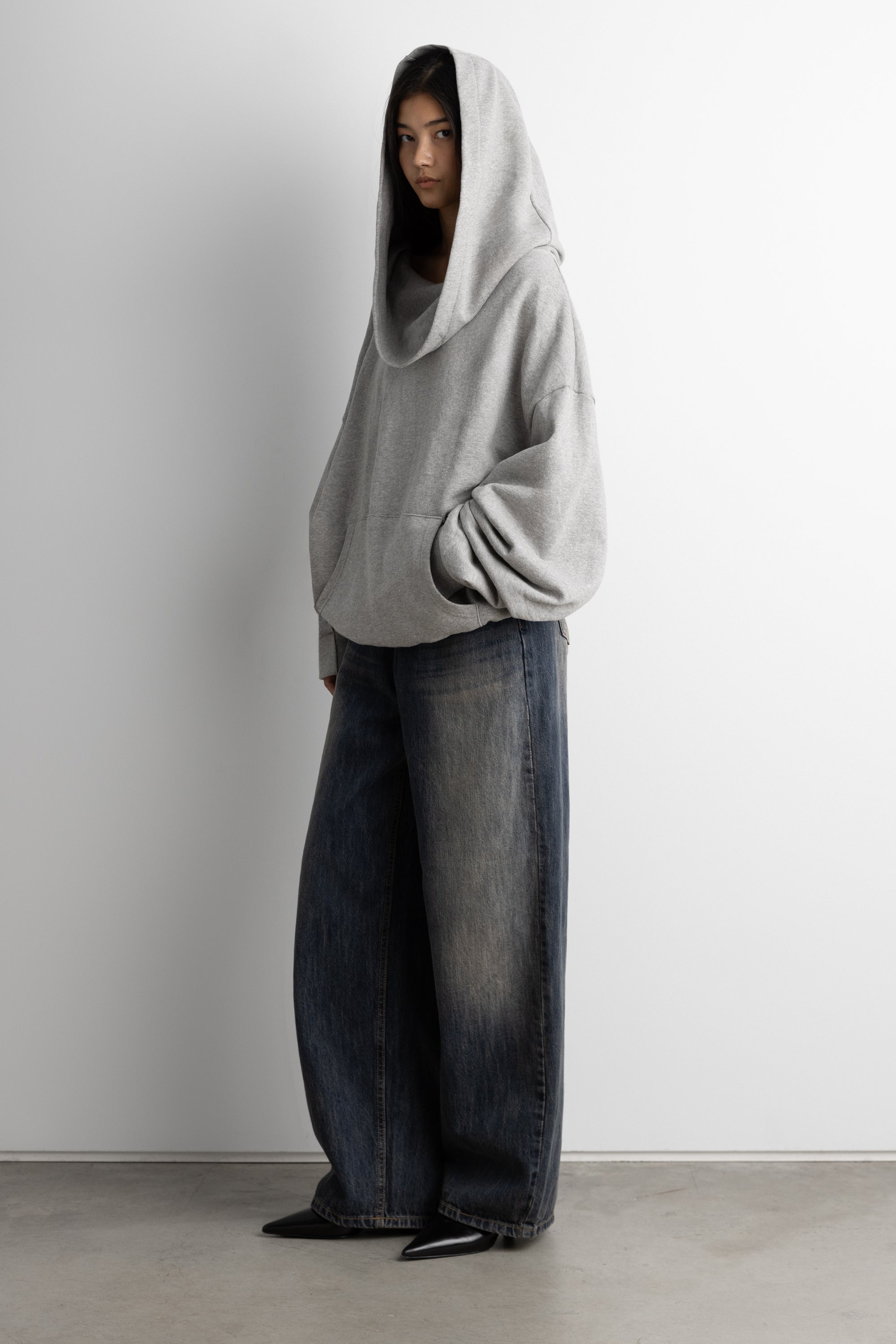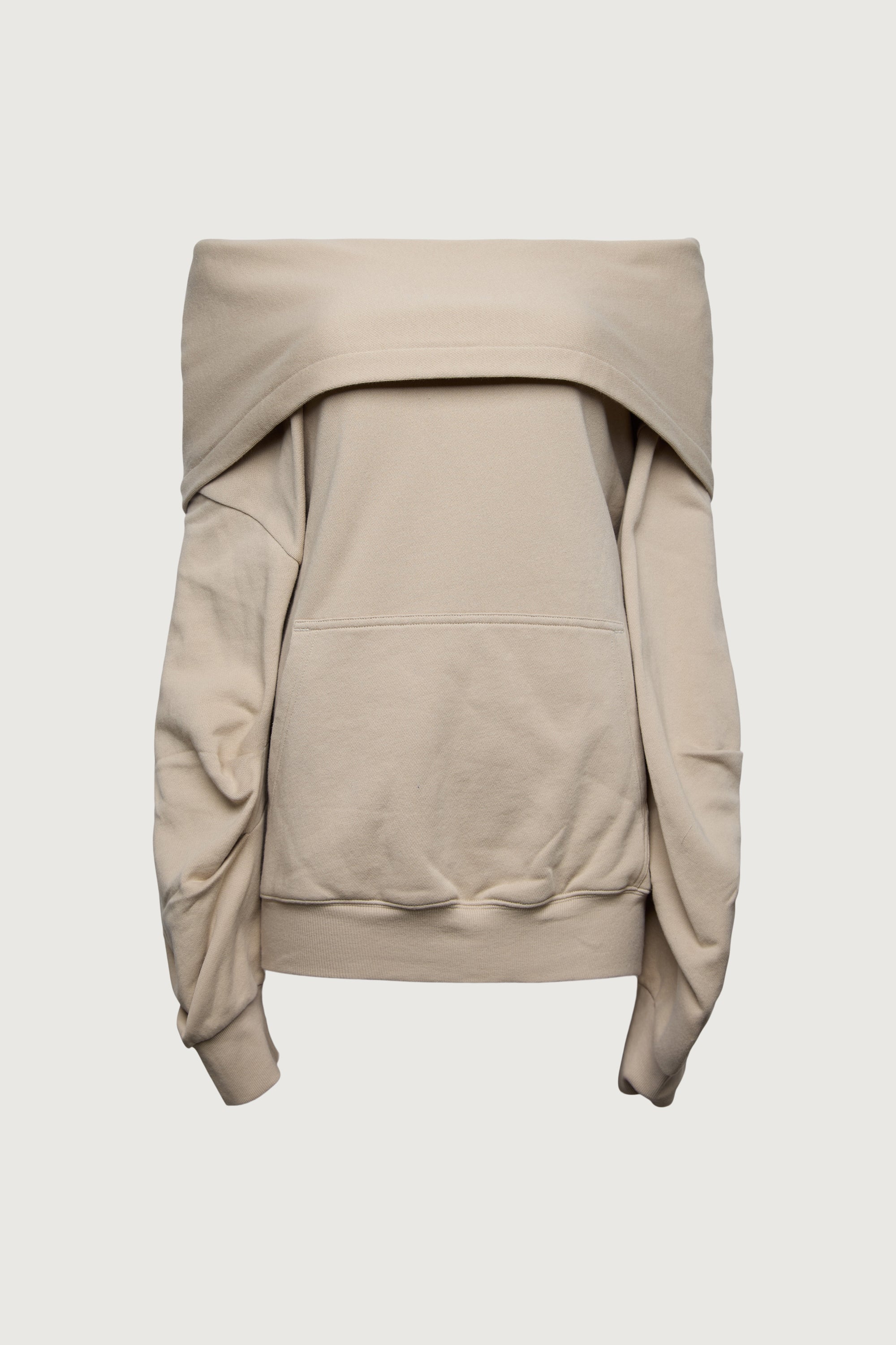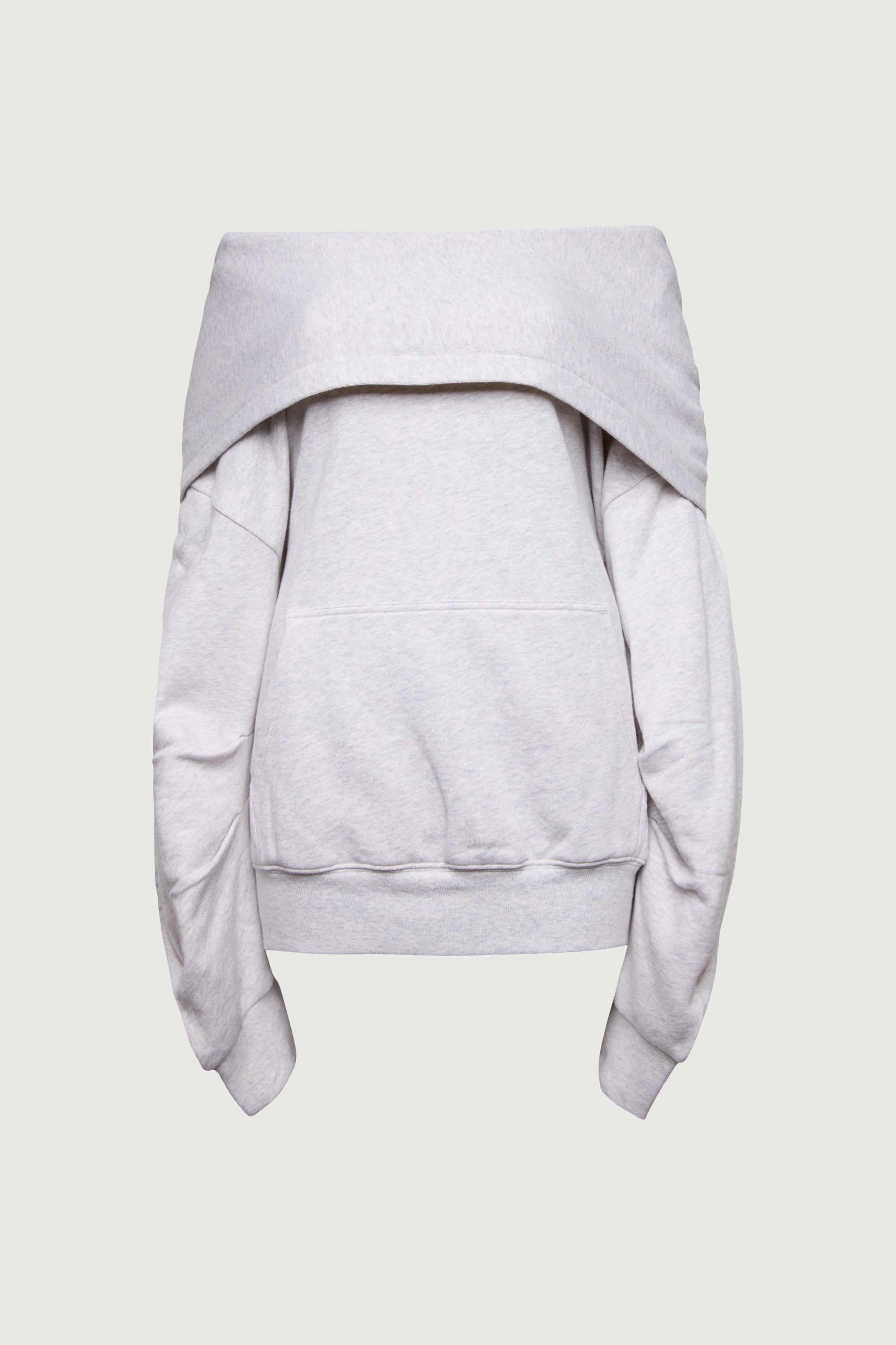 Soft mid-weight cotton terry. Roomy hood. Folded off the shoulder design. Kangaroo pockets. Ribbed trims.