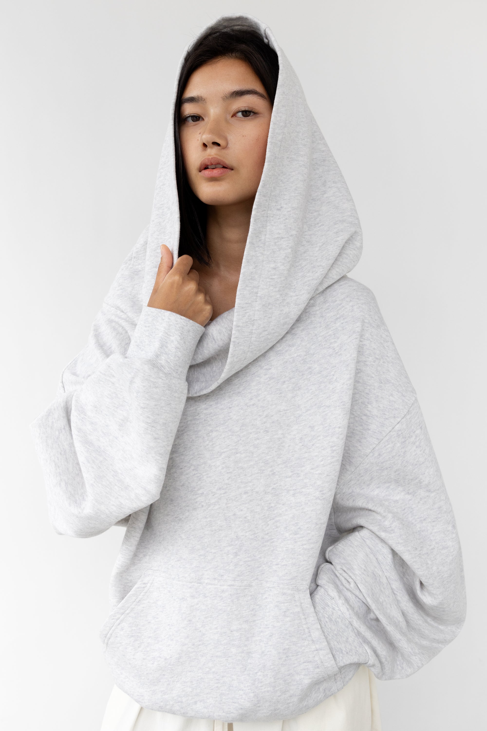 Our best selling oversized slouchy shoulder hoodie is updated with a soft mid-weight cotton terry in an oversized fit. It's a perfect staple to carry you through season to season. It has a folded off the shoulder design offers more draping, a roomy hood and a front kangaroo pocket. A new essential to add to your wardrobe, wear yours for lounging at home or out running errands with your fave sweatpants.