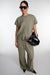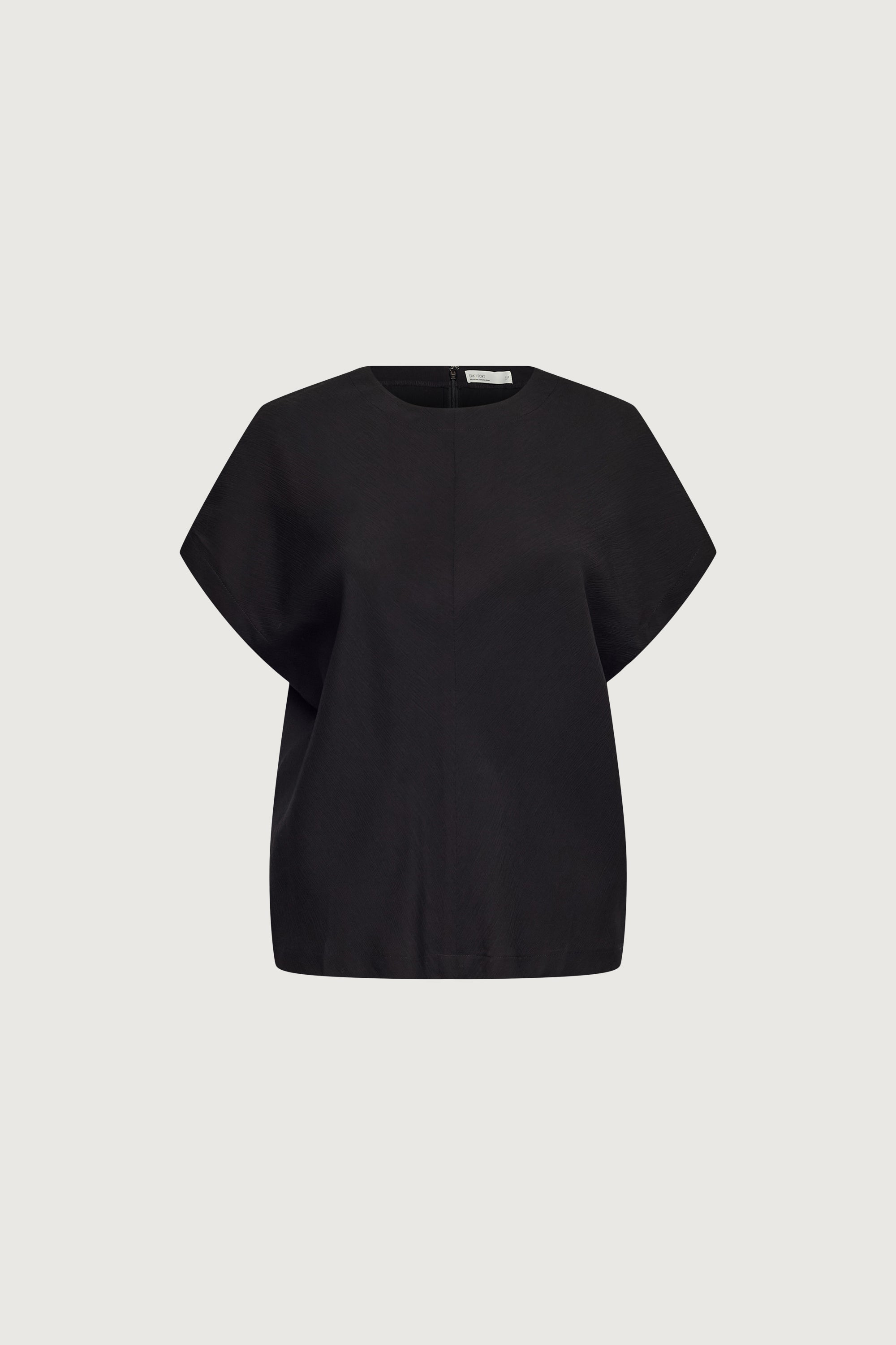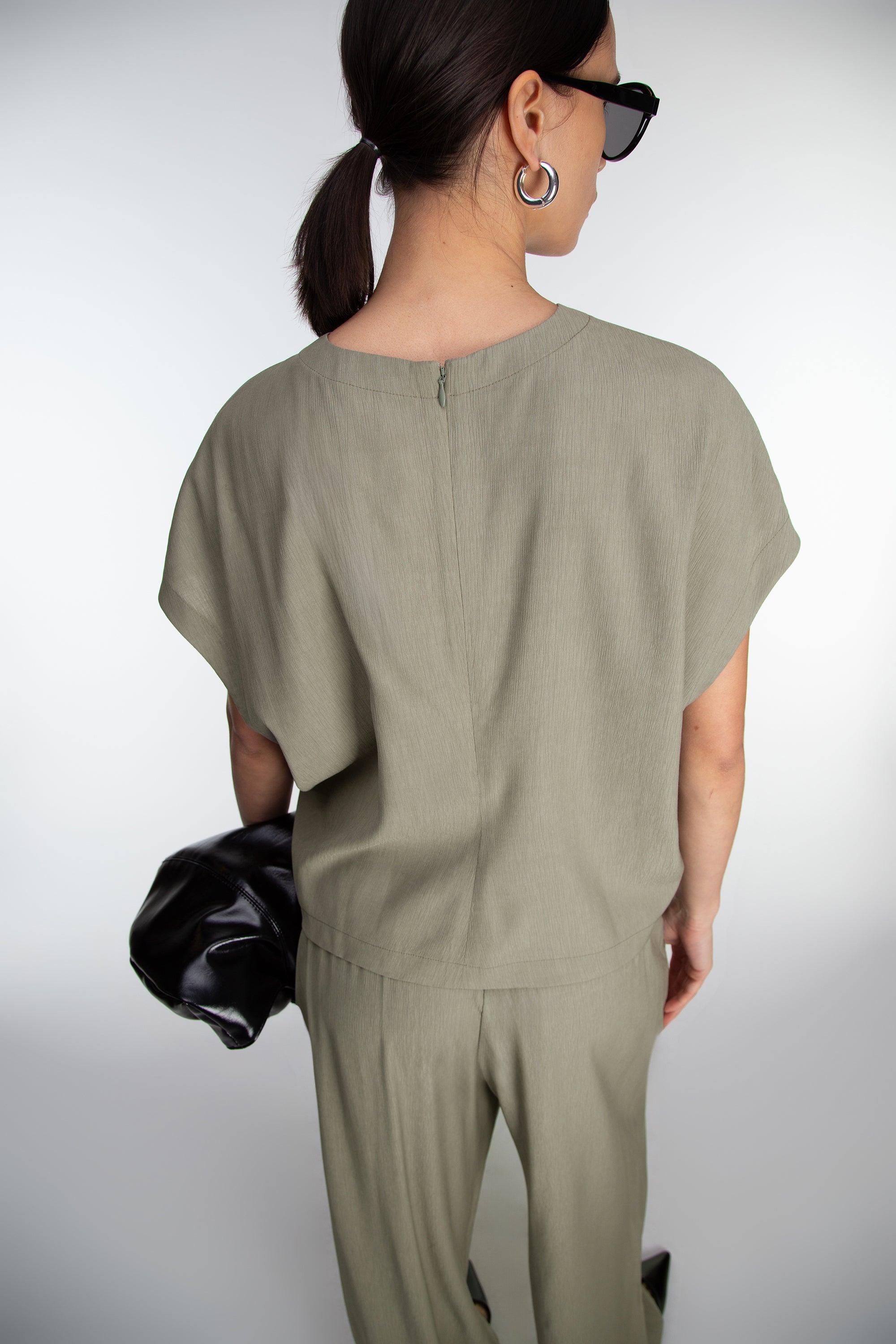 This short sleeve top is made from a crinkled rayon blend in a slouchy, relaxed fit that is perfect for the warmer days ahead. It's lightweight and airy and has dolman cap sleeves and a zipper at the back. Wear yours as a set with the matching pants.