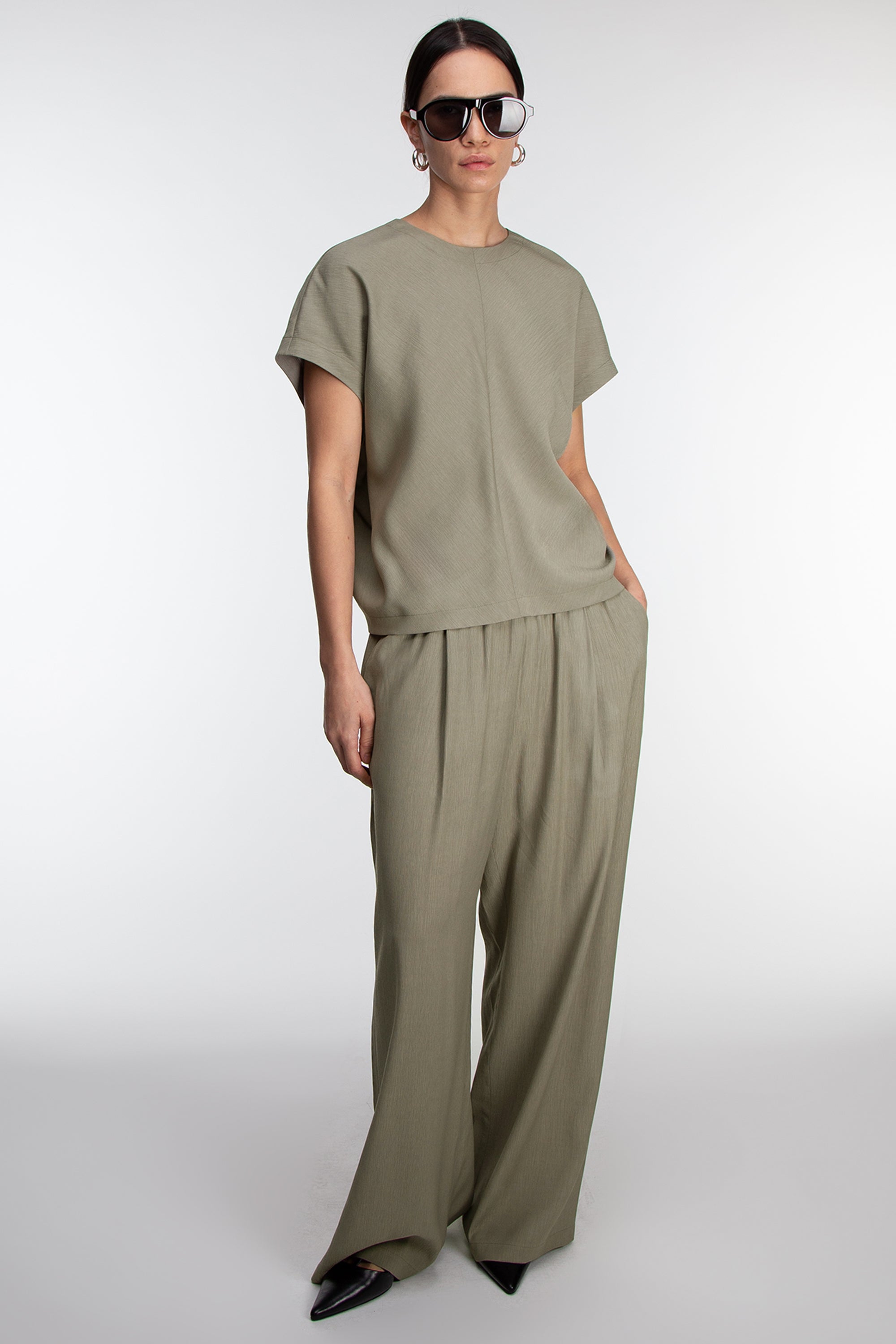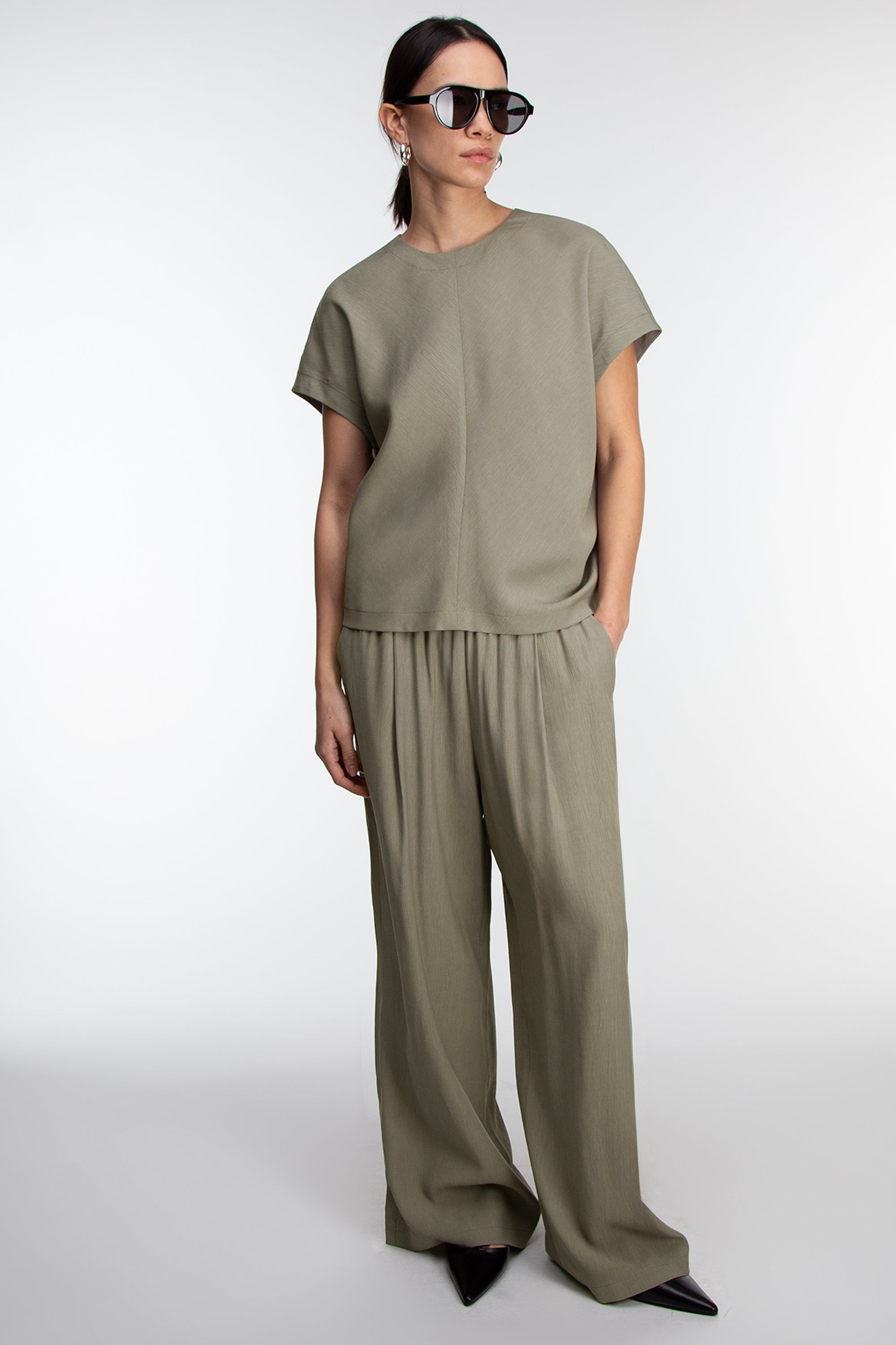 Crinkled rayon elastic waist pant in vetiver — main imageCRINKLED RAYON ELASTIC WAIST PANT in Vetiver — alternate angle