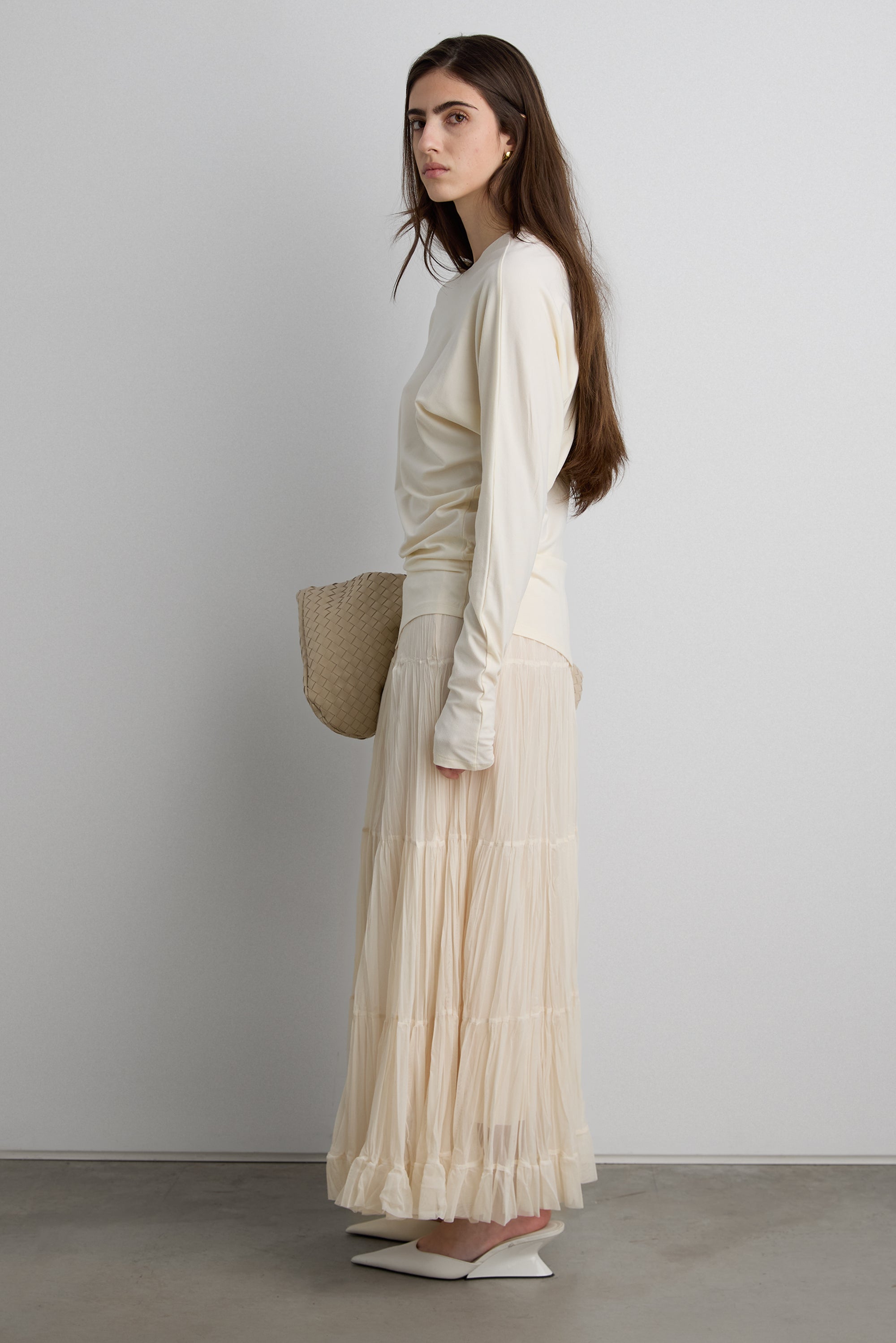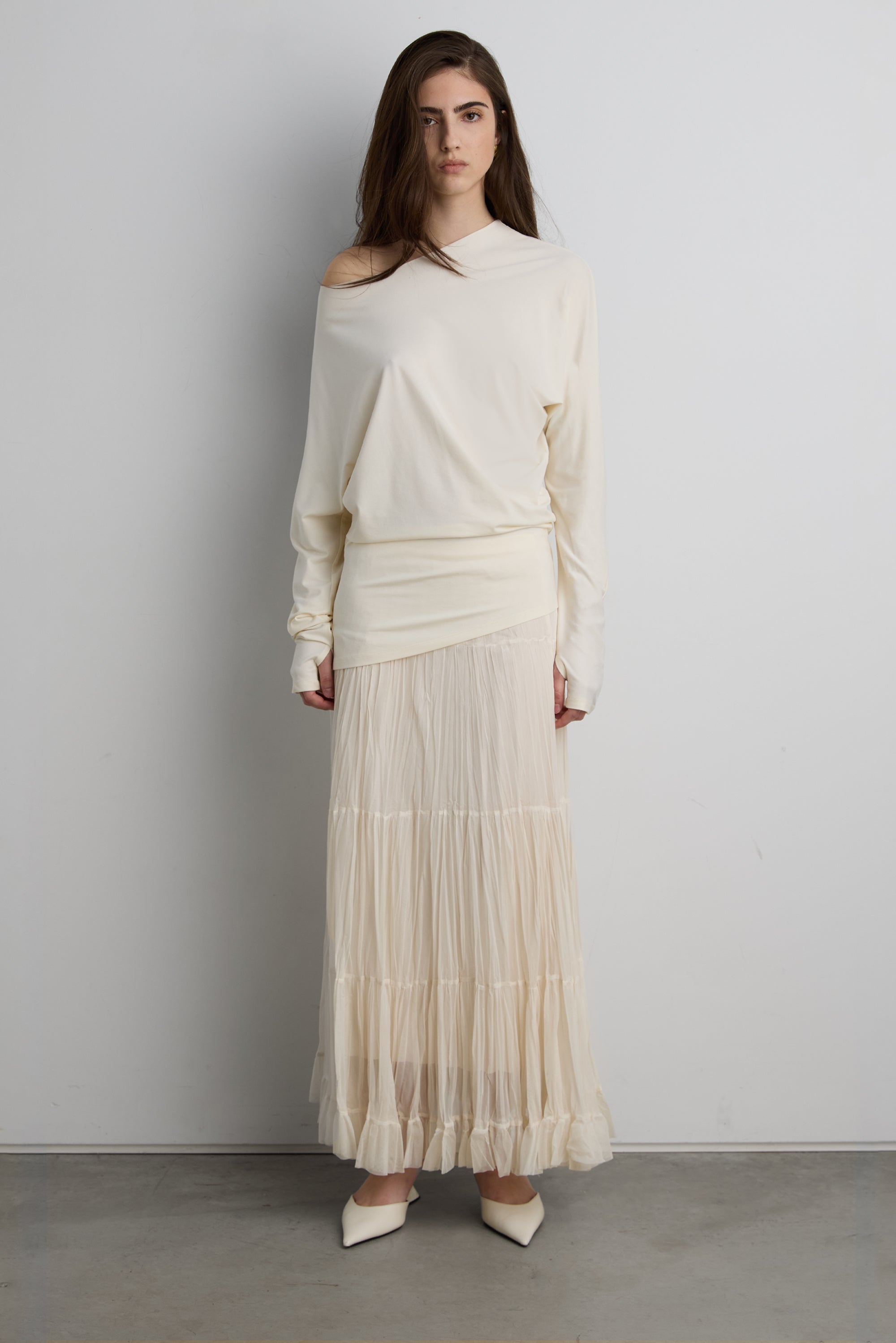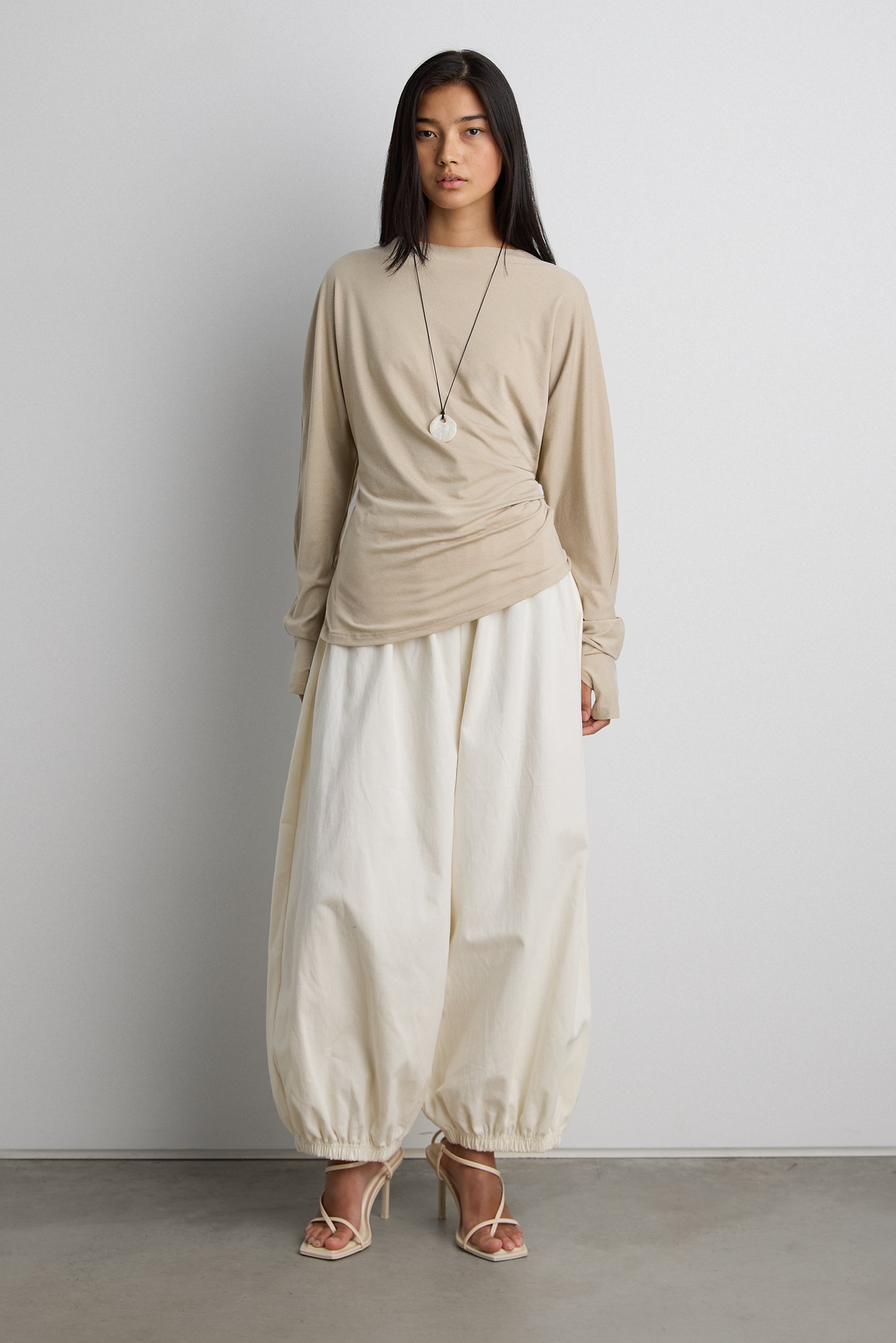 Draped silhouette. Long sleeves. Thumb holes.