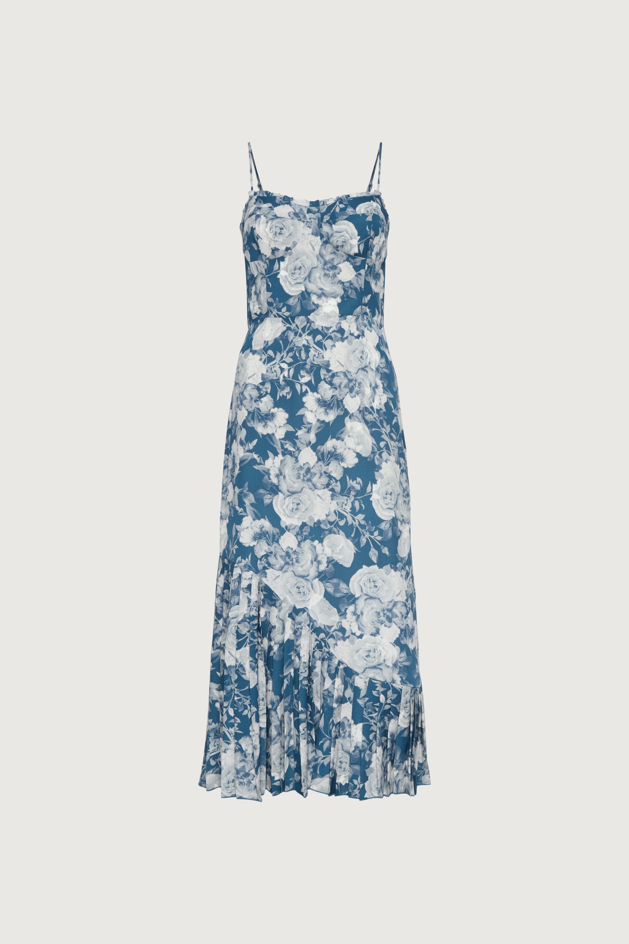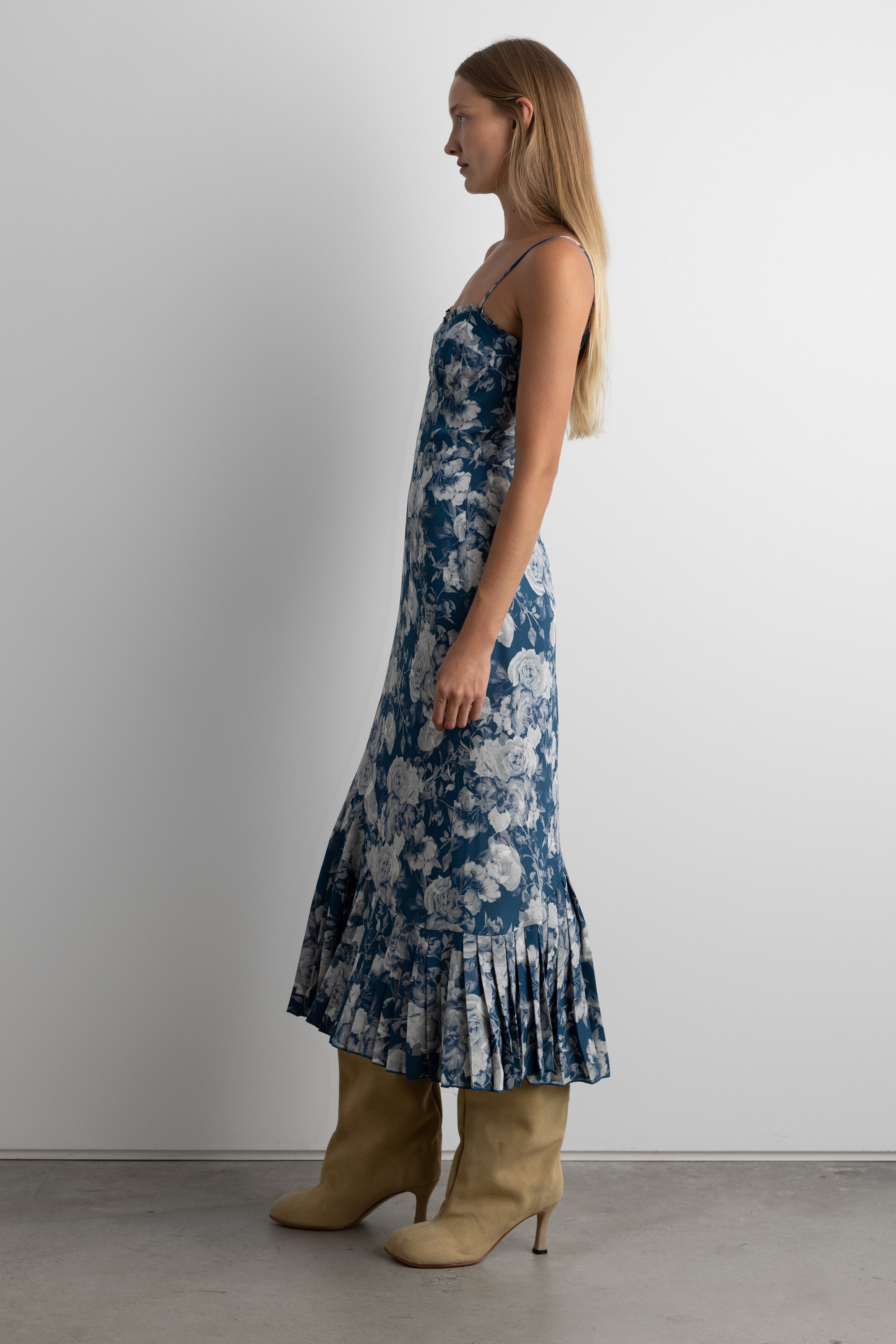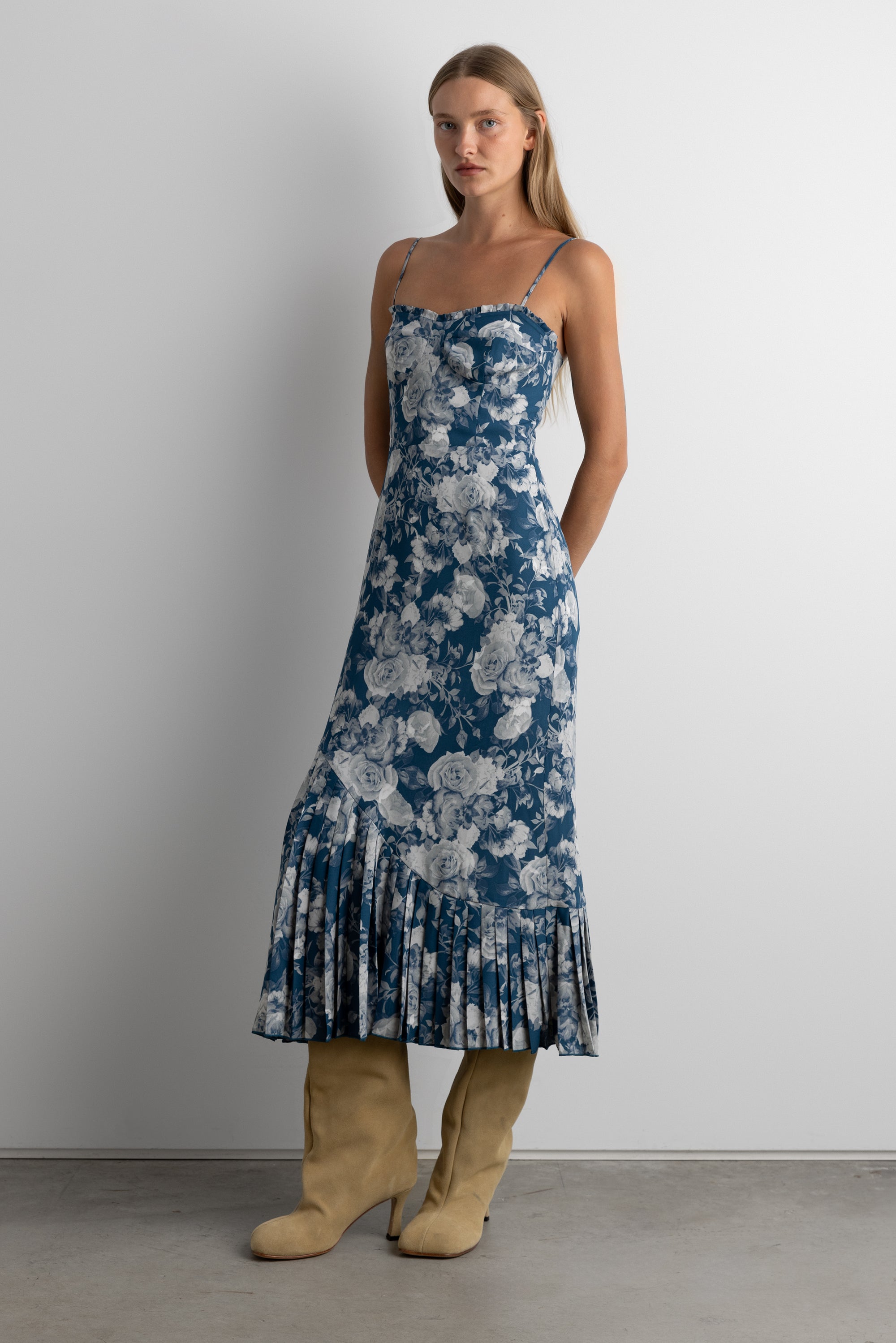 Floral print georgette fabric. Sweetheart neckline with pleats. Adjustable shoulder straps. Smocked back with zipper. Asymmetrical pleated hem. Lined.
