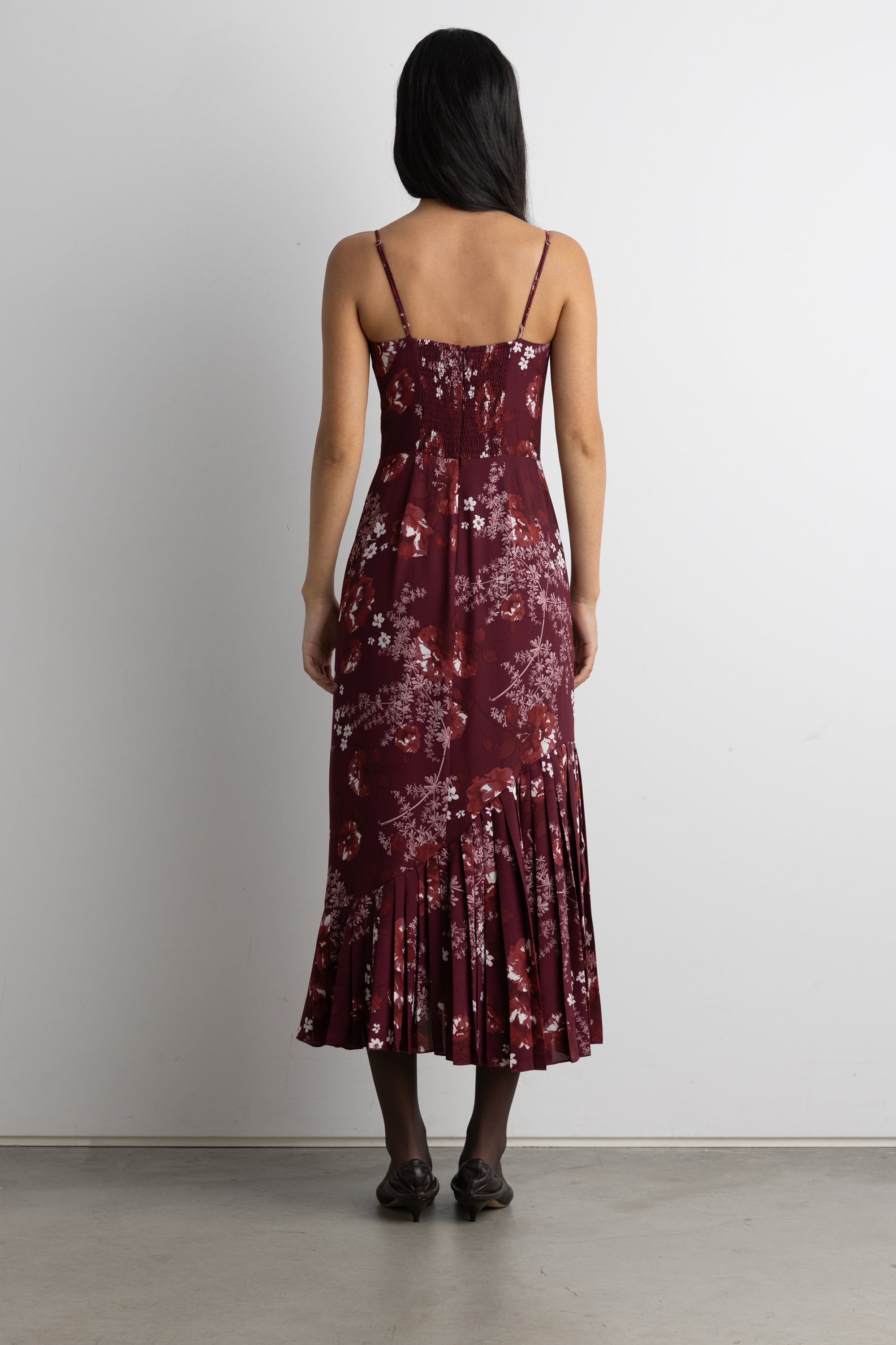 This floral print midi dress is cut from a lightweight georgette in a slim fit. It features a corset style bodice, a pleated trim sweetheart neckline, a smocked back with a zipper closure and an asymmetrical pleated hem for added movement. A new dress to add to your rotation this season, wear it with mini heels and statement jewelry.