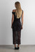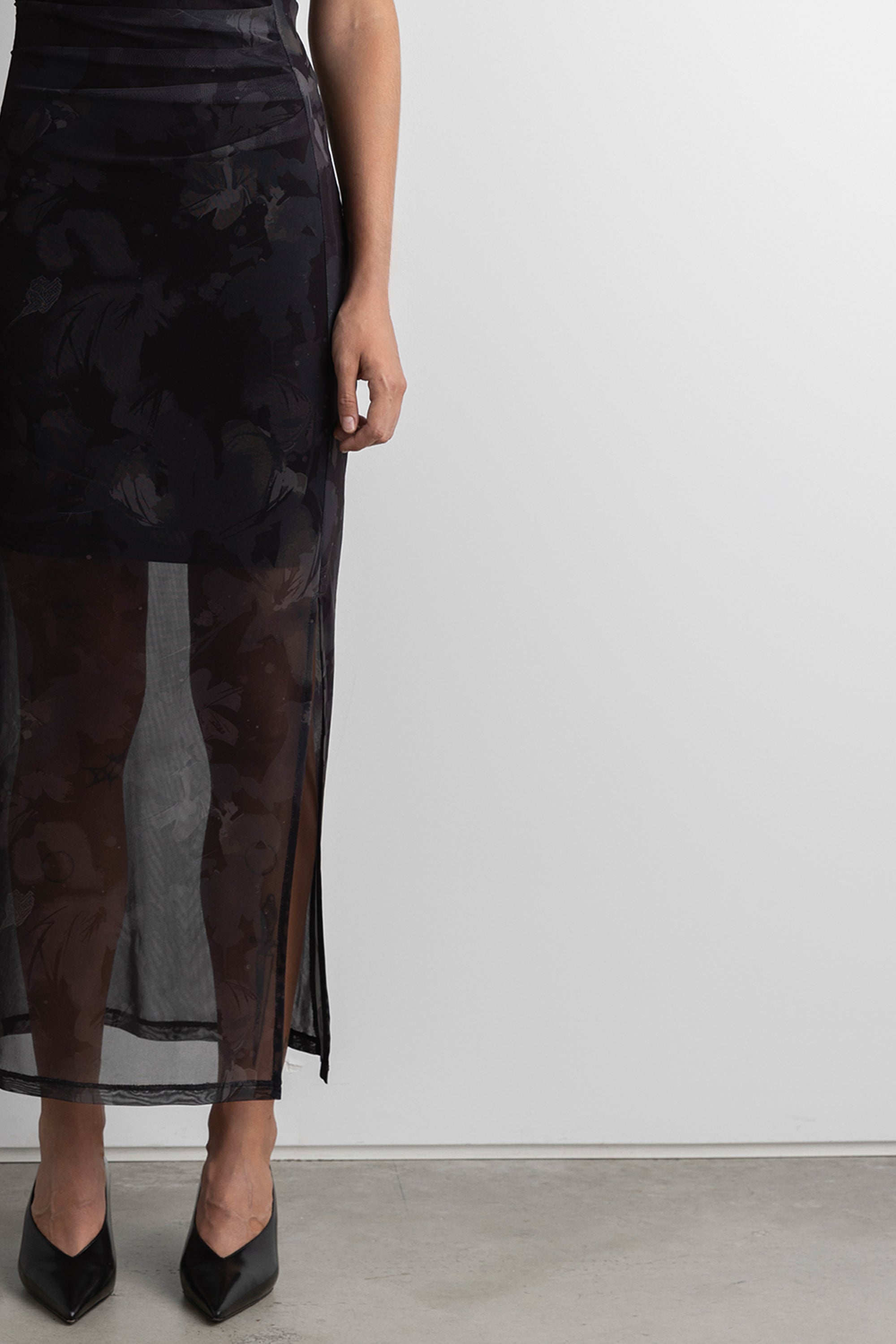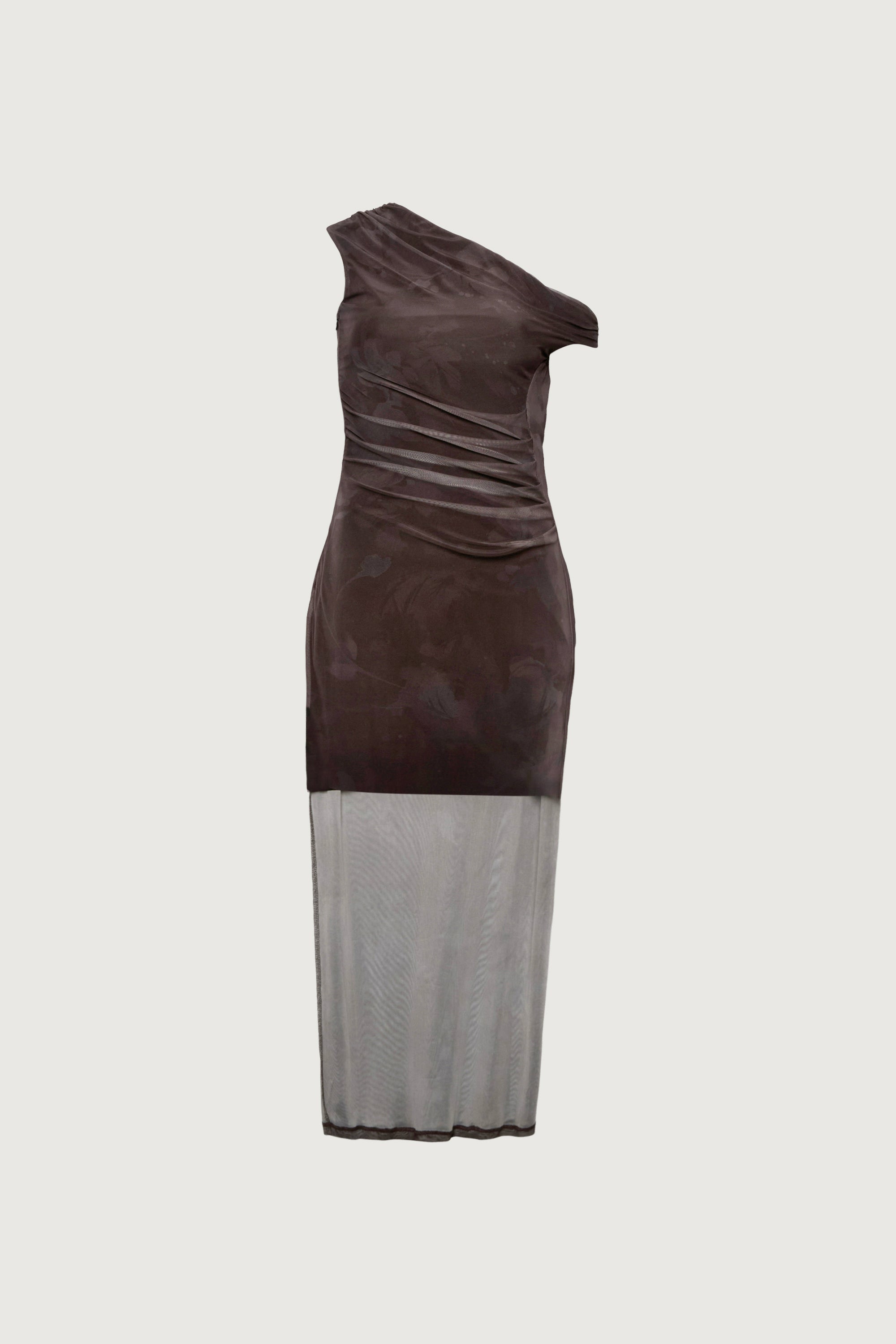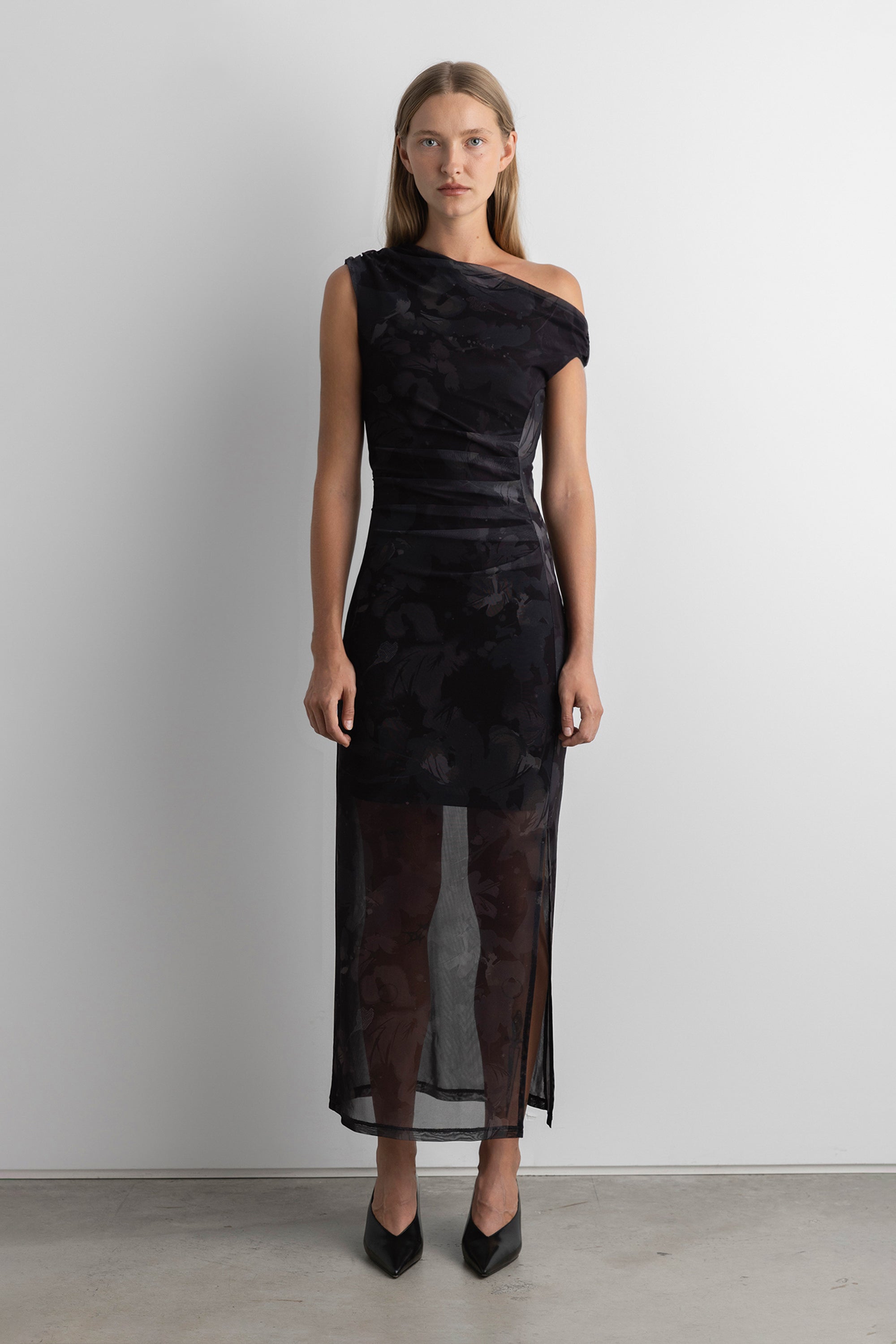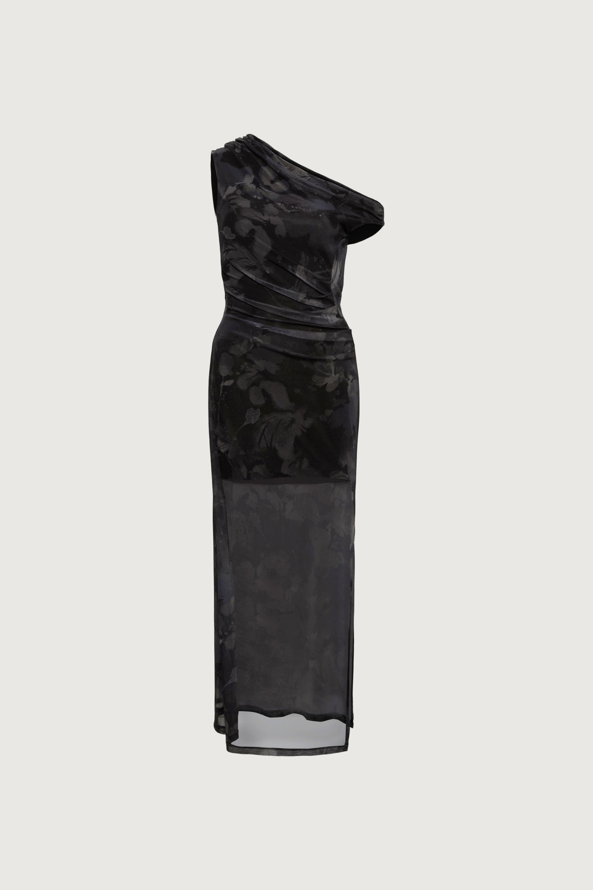 Floral mesh fabric. Asymmetrical neckline. Ruching at shoulders and waist. Front slit.