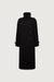 Double breasted front. Shoulder lapels. Funnel neck design with belt detail. Waist belt. Side pockets.