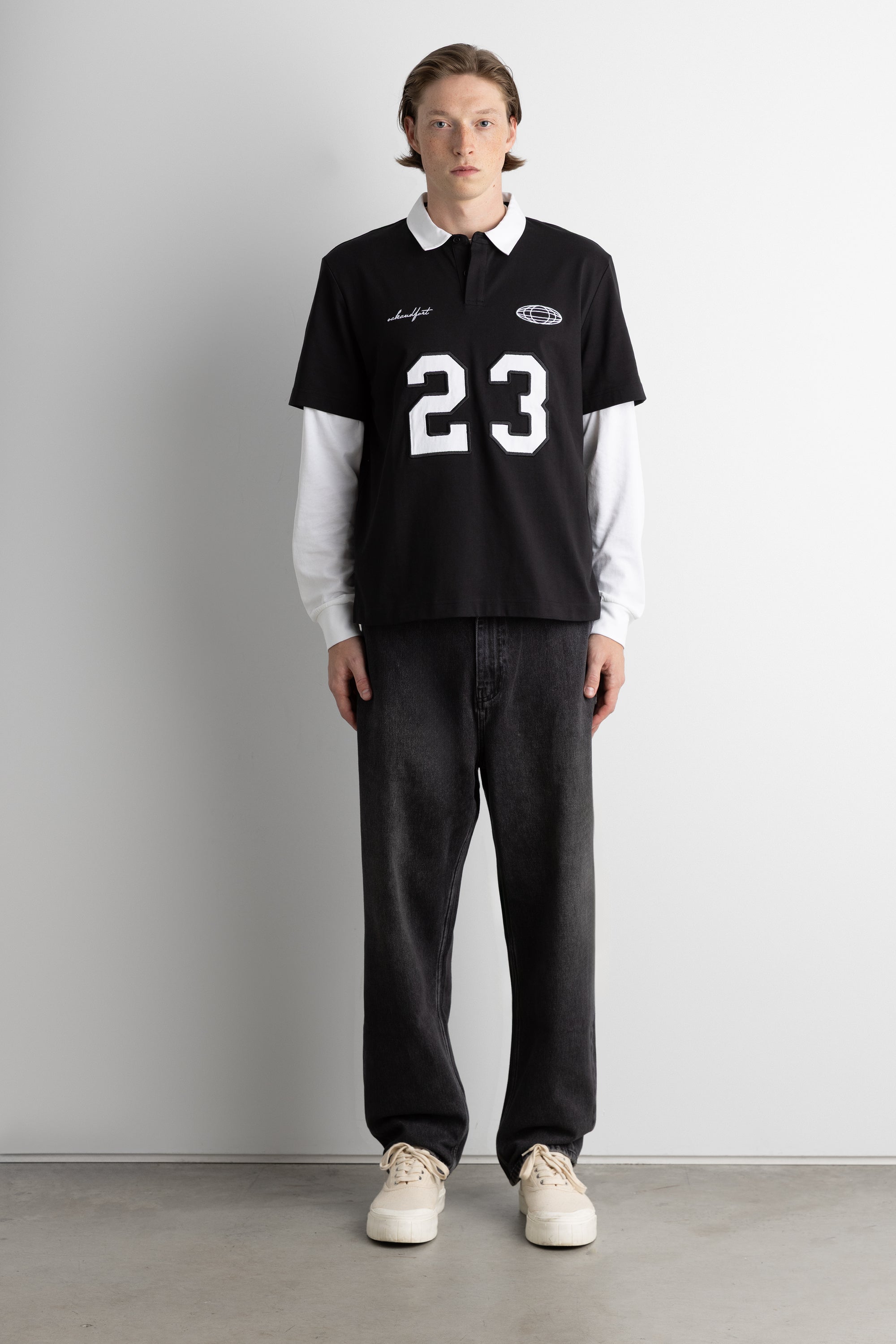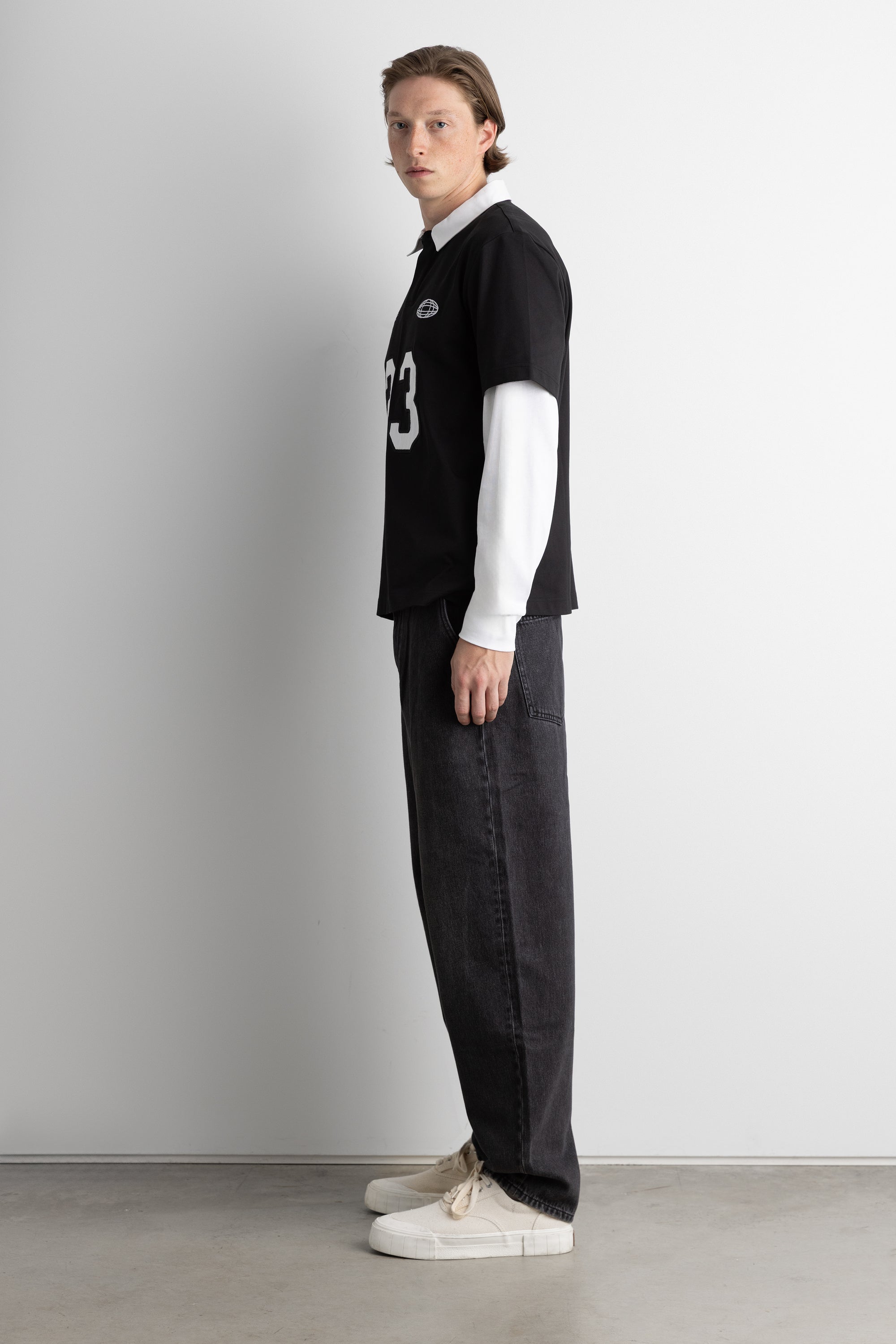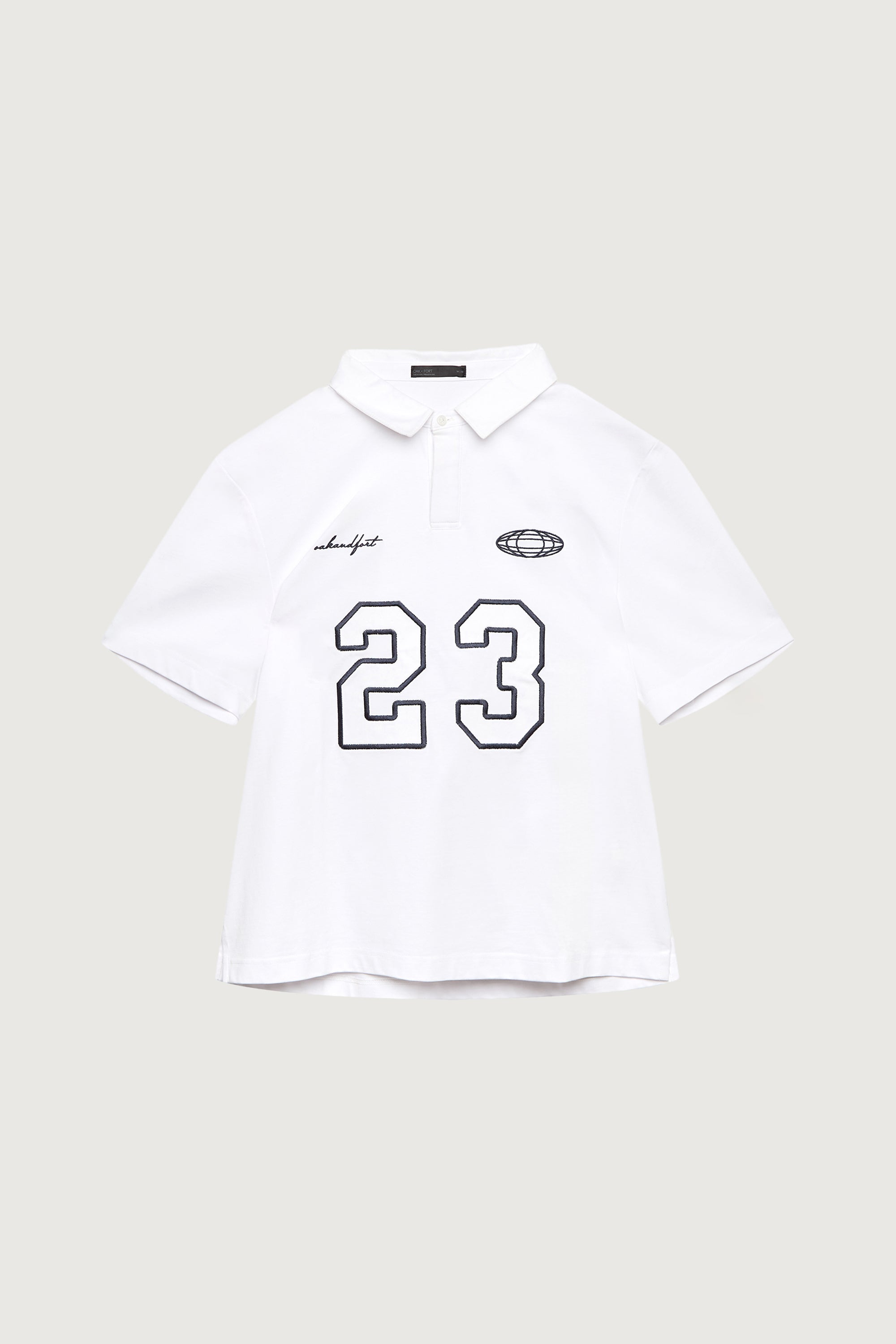 Relaxed fit. Cotton blend fabric. Polo button up collar. Woven patch graphic. Embroidered. 28" length based on size M.