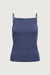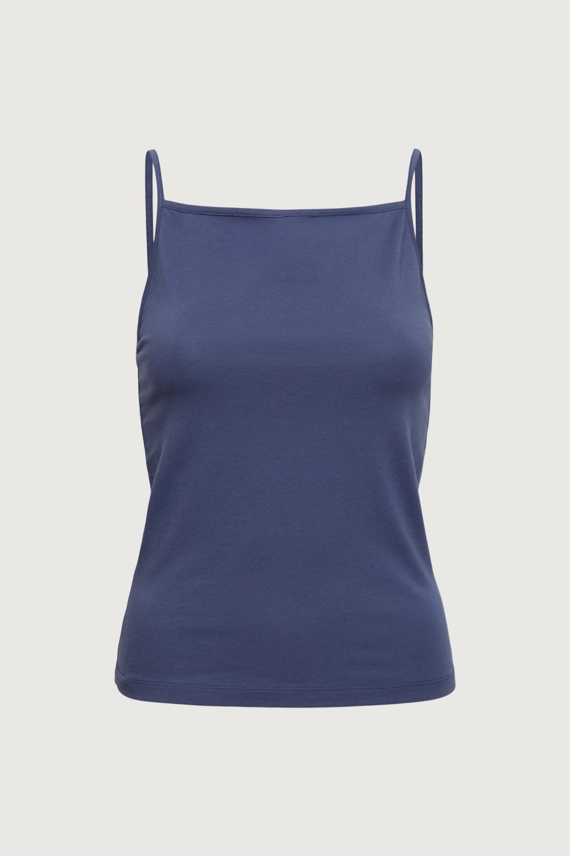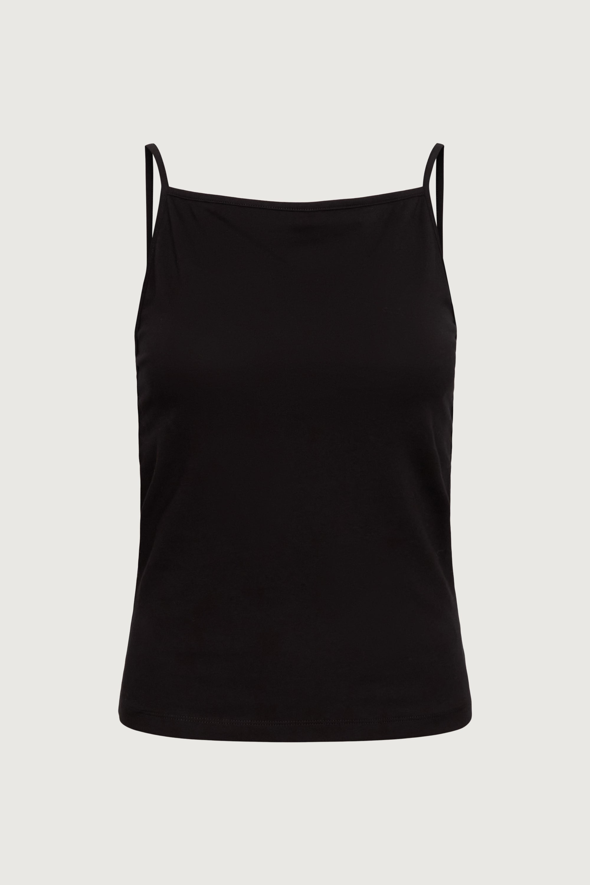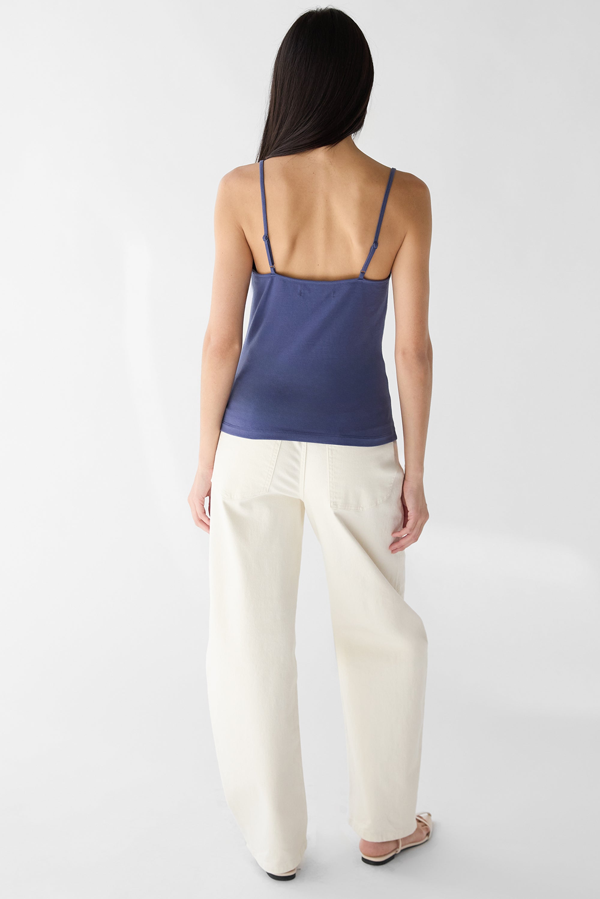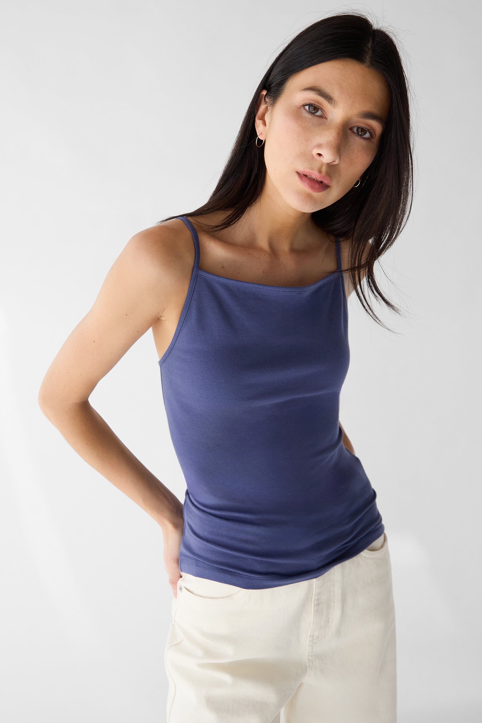 Mid-weight cotton jersey. High neckline. Low back design. Adjustable shoulder straps.