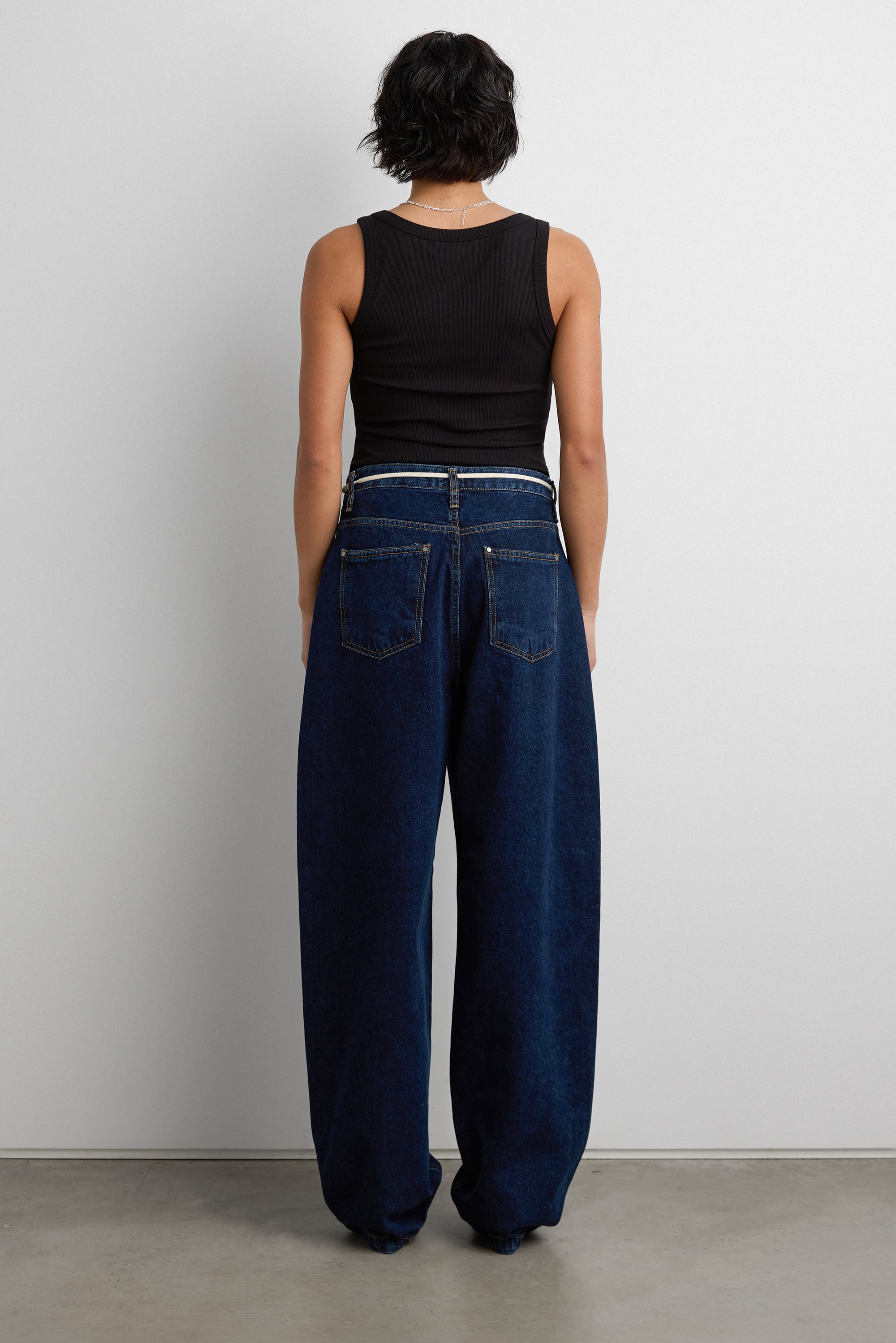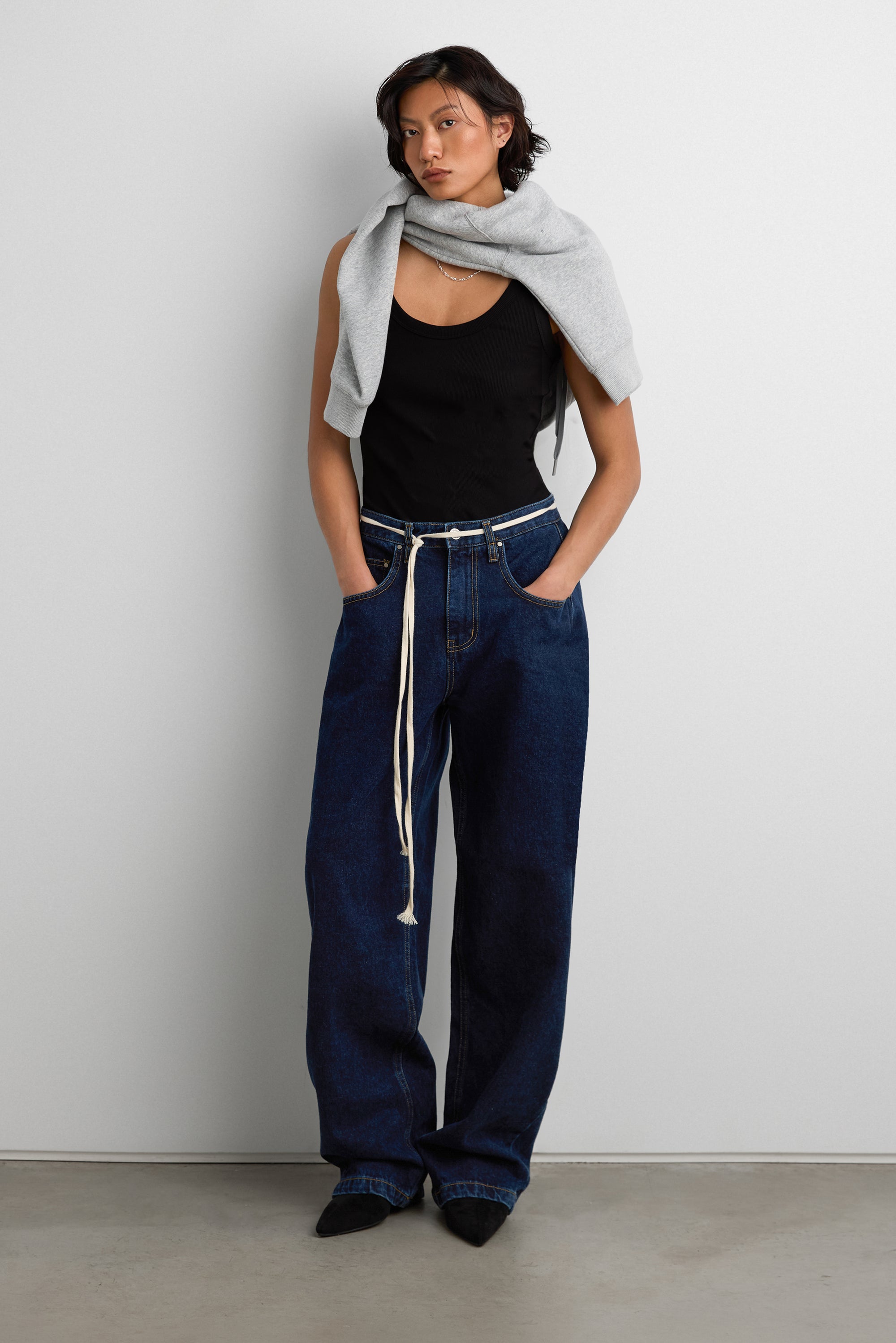 These classic jeans are made in a relaxed fit in a dark denim wash. It feature a high-rise waist with a shoelace belt, a barrel leg cut and a 5-pocket design.