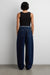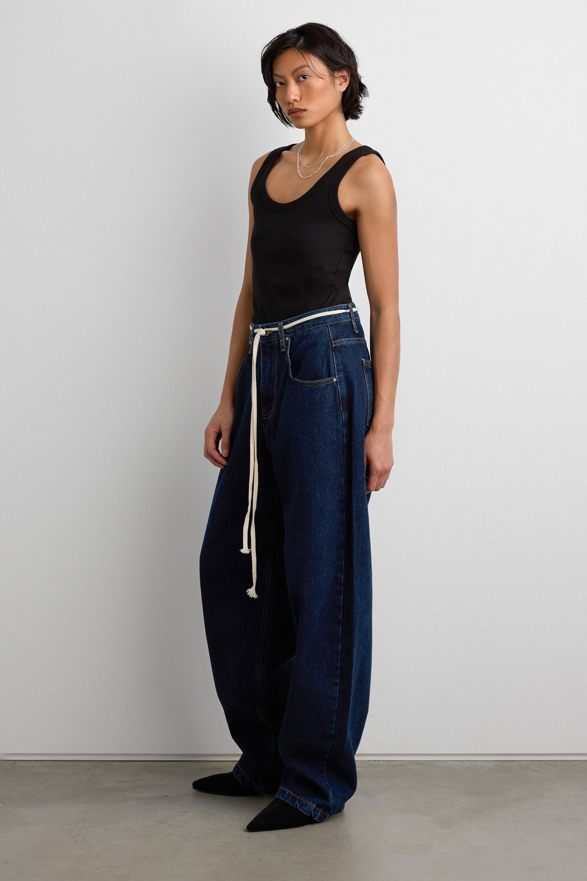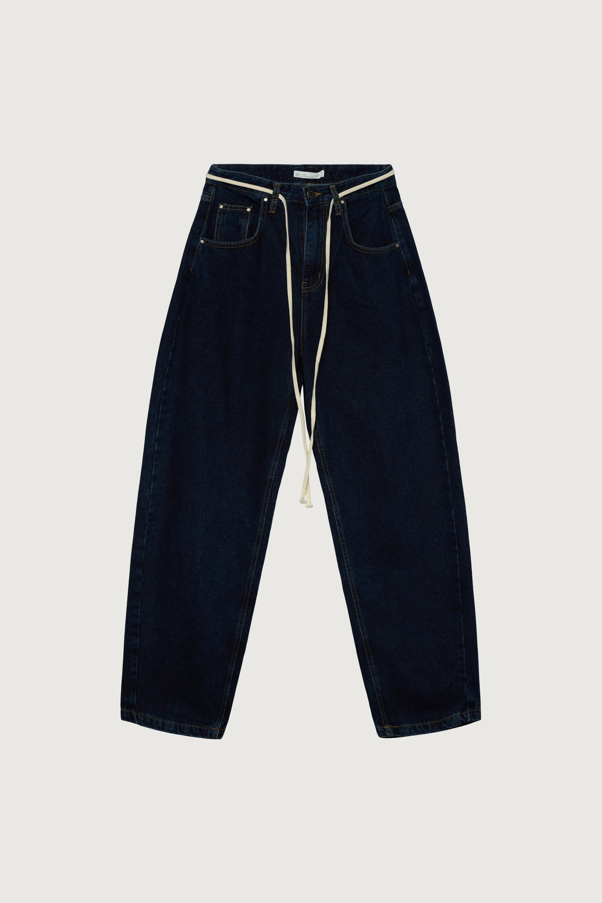 Dark wash, mid-weight denim. High-rise. Shoelace belt. 5-pocket design.