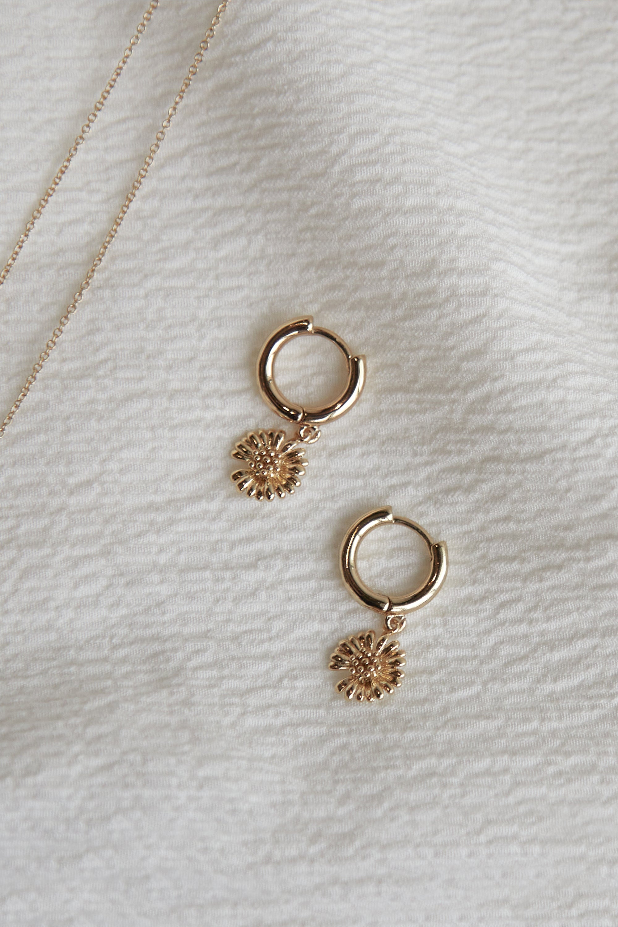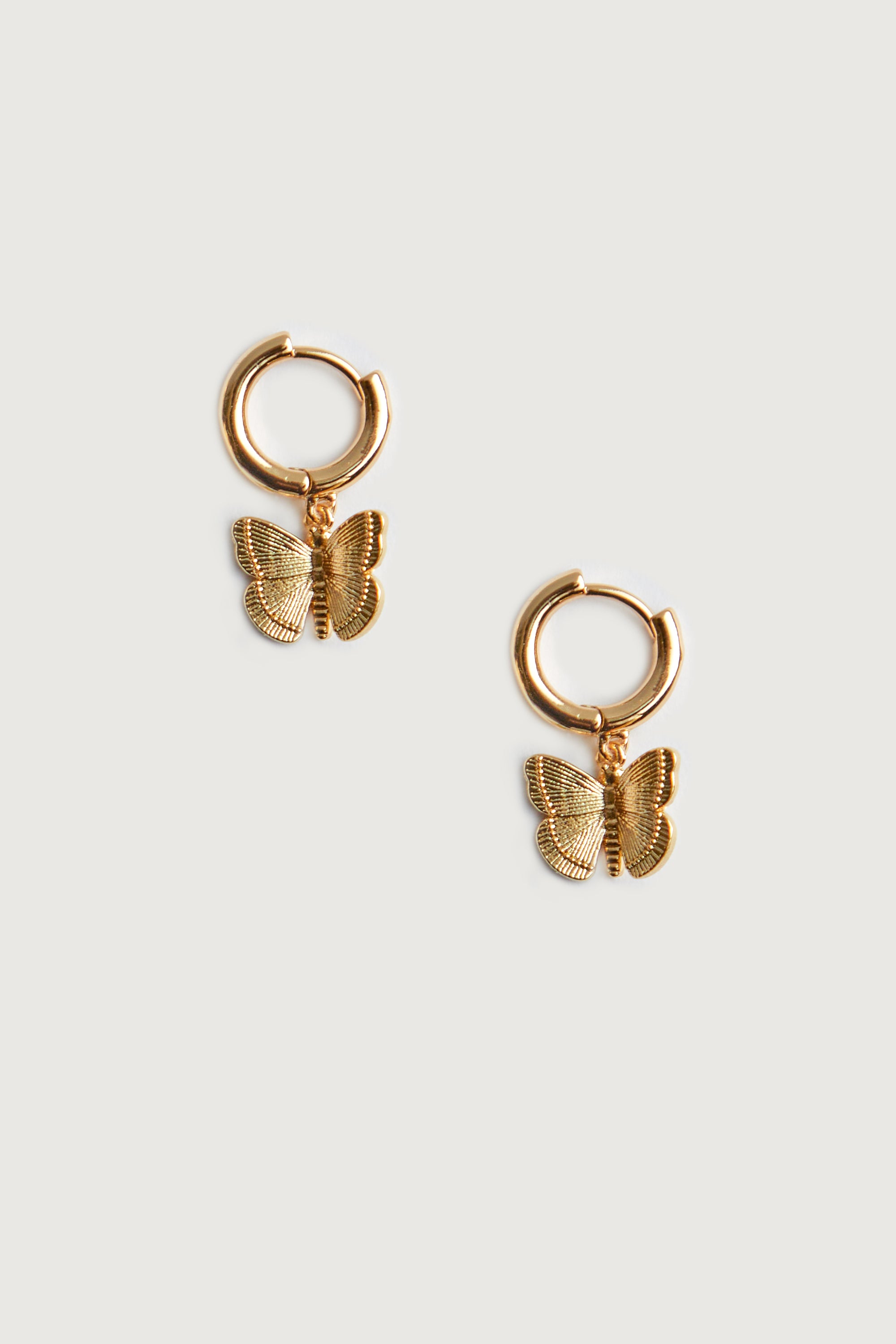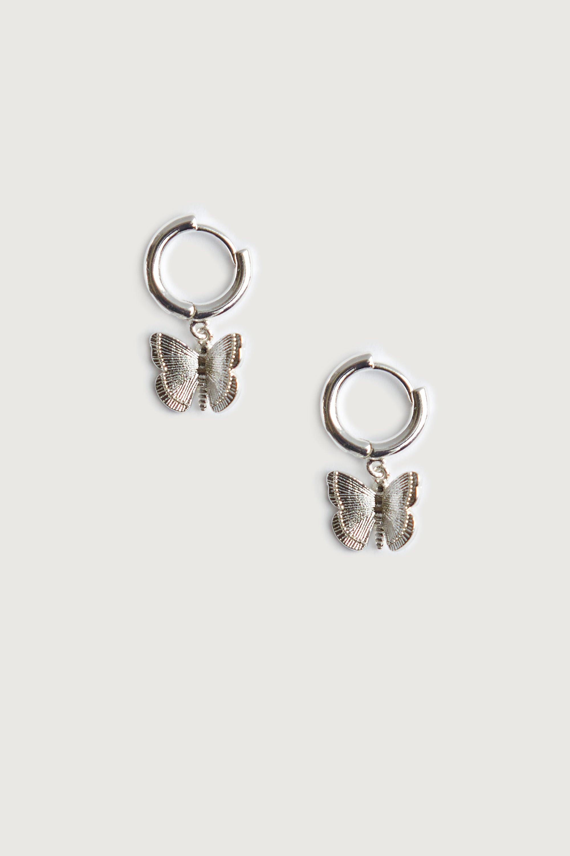 These huggie hoops feature either a flower or butterfly charm. Pair it with the matching chain necklace with identical charm pendants (NK-10557-W).
