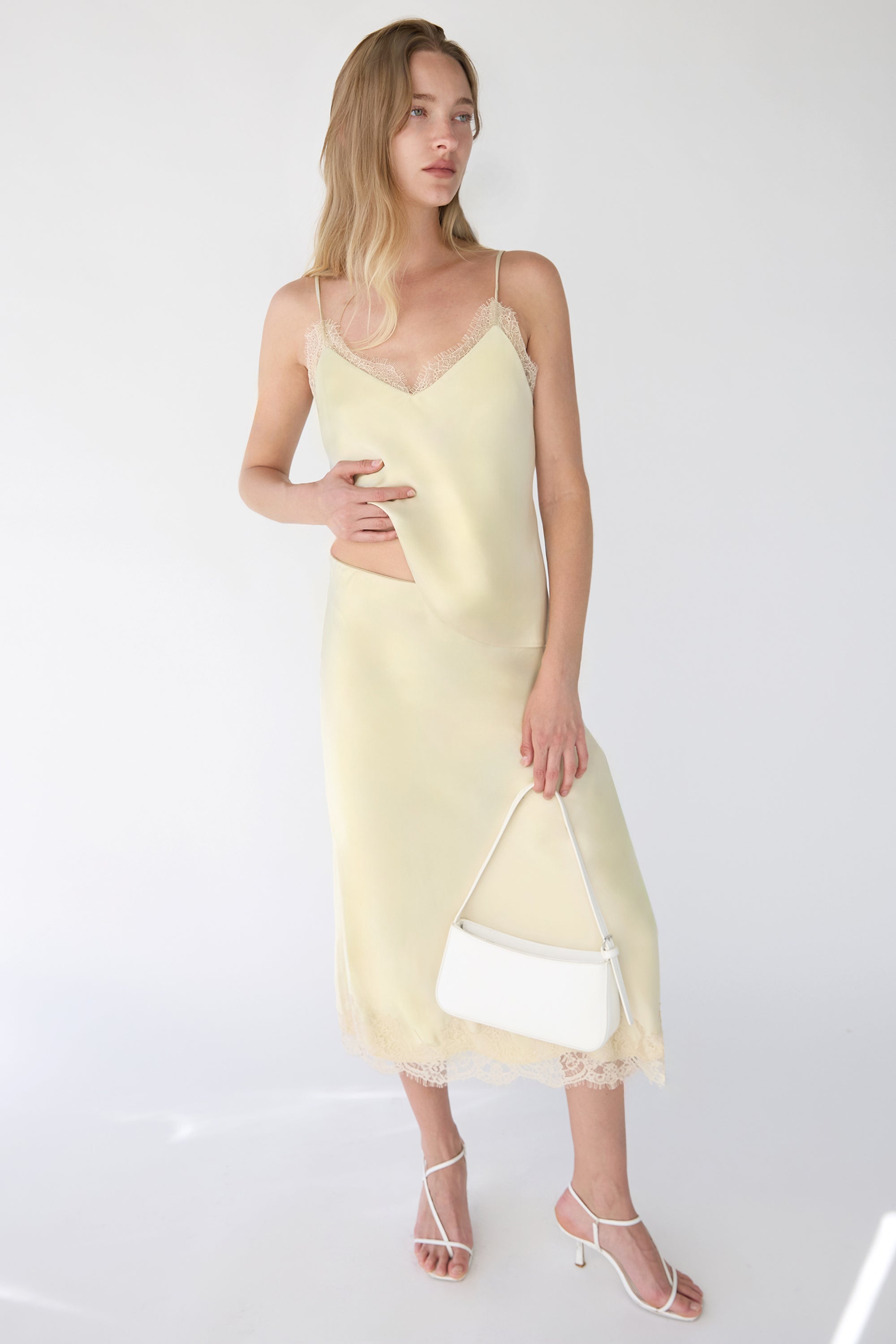 This lace trim satin midi skirt is made in a classic fit from a lustrous satin fabric and is finished with a romantic lace trim at the hem. A versatile silhouette to wear this season and into the next. Wear yours as a set with the matching tank top and complete your look with an oversized blazer.