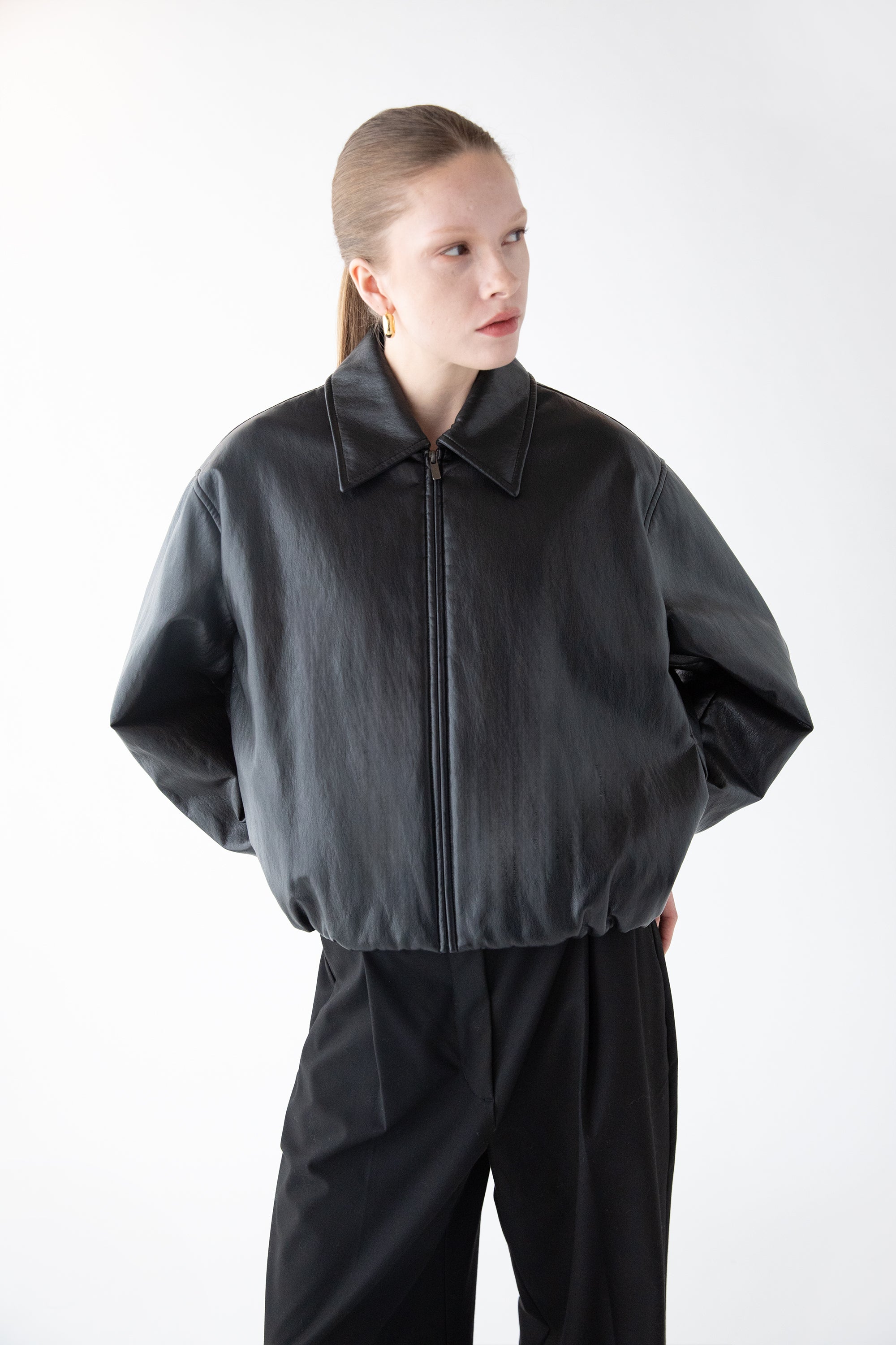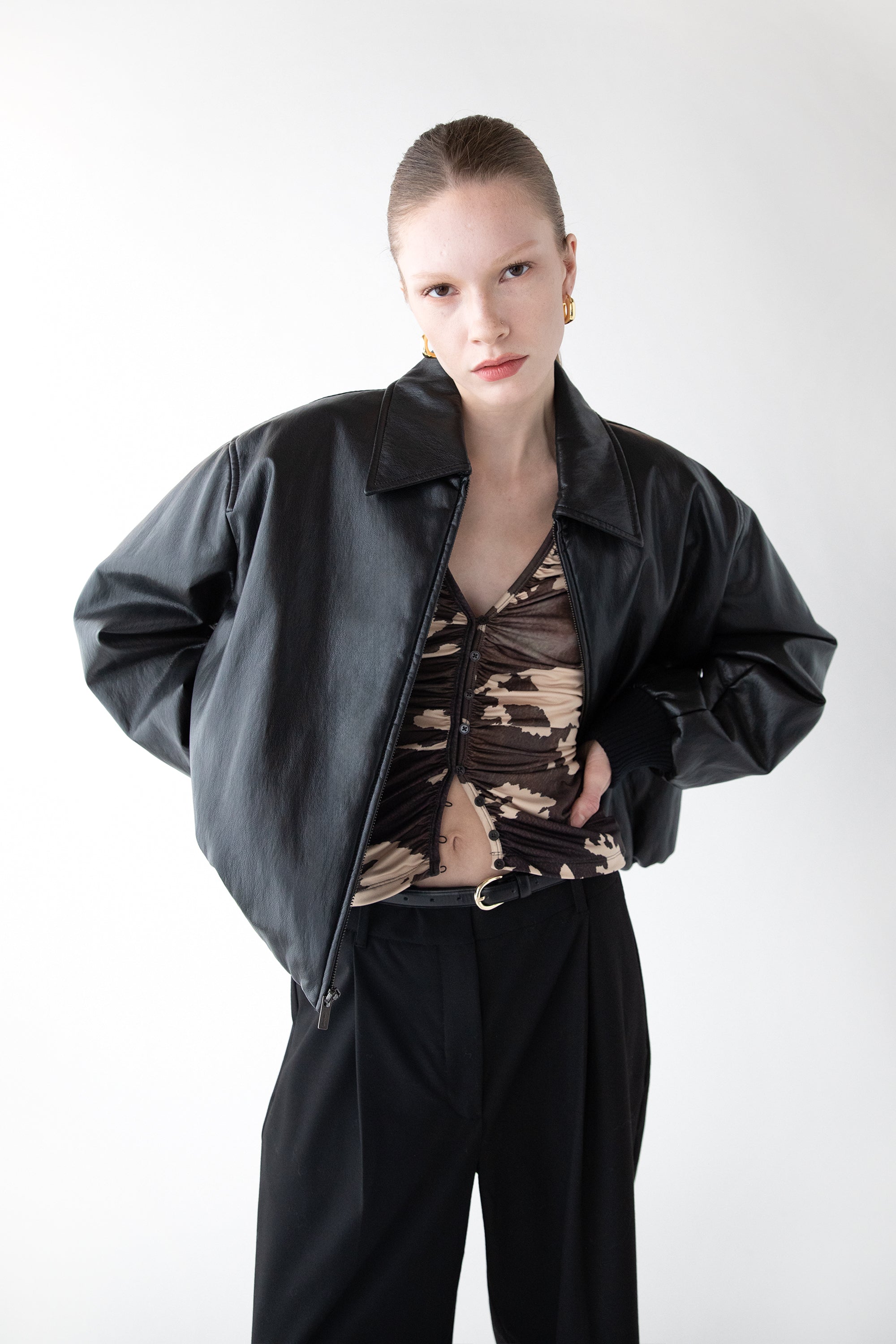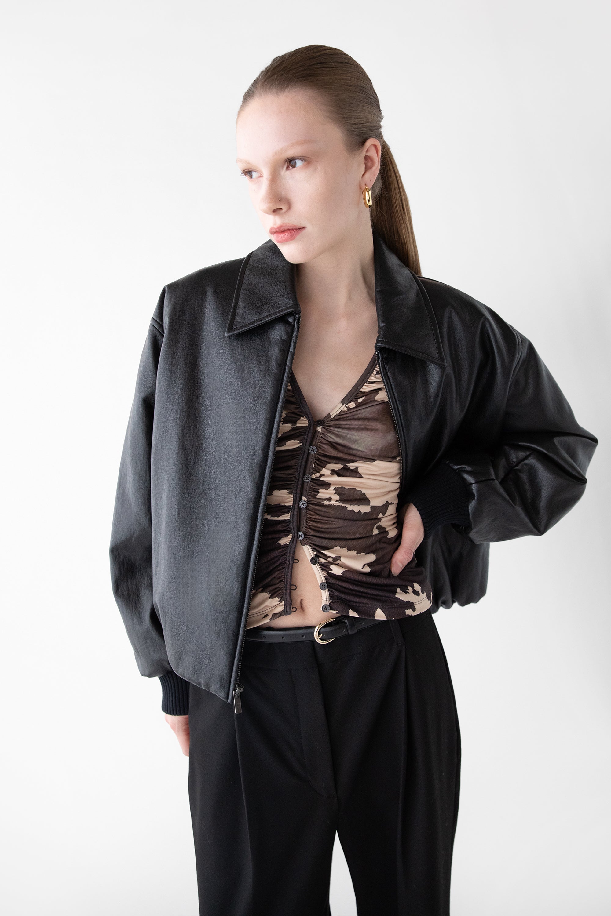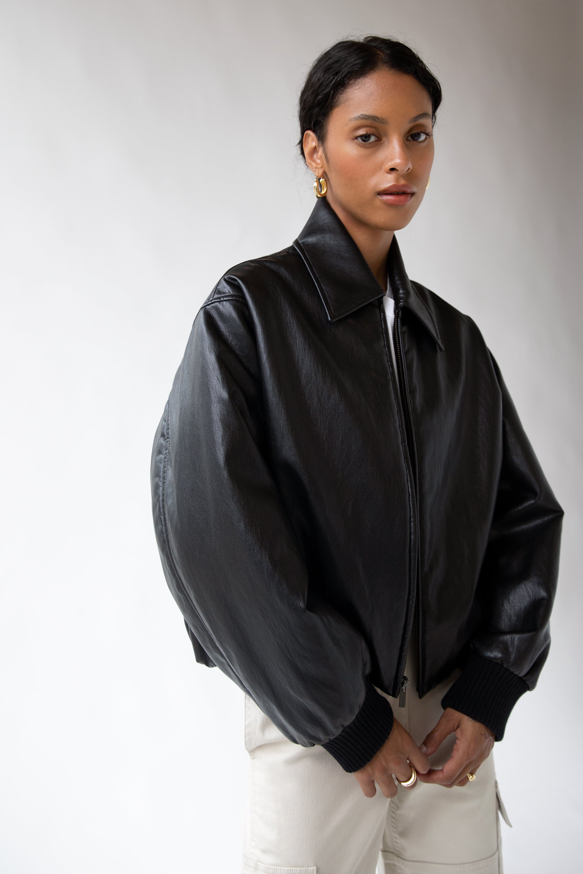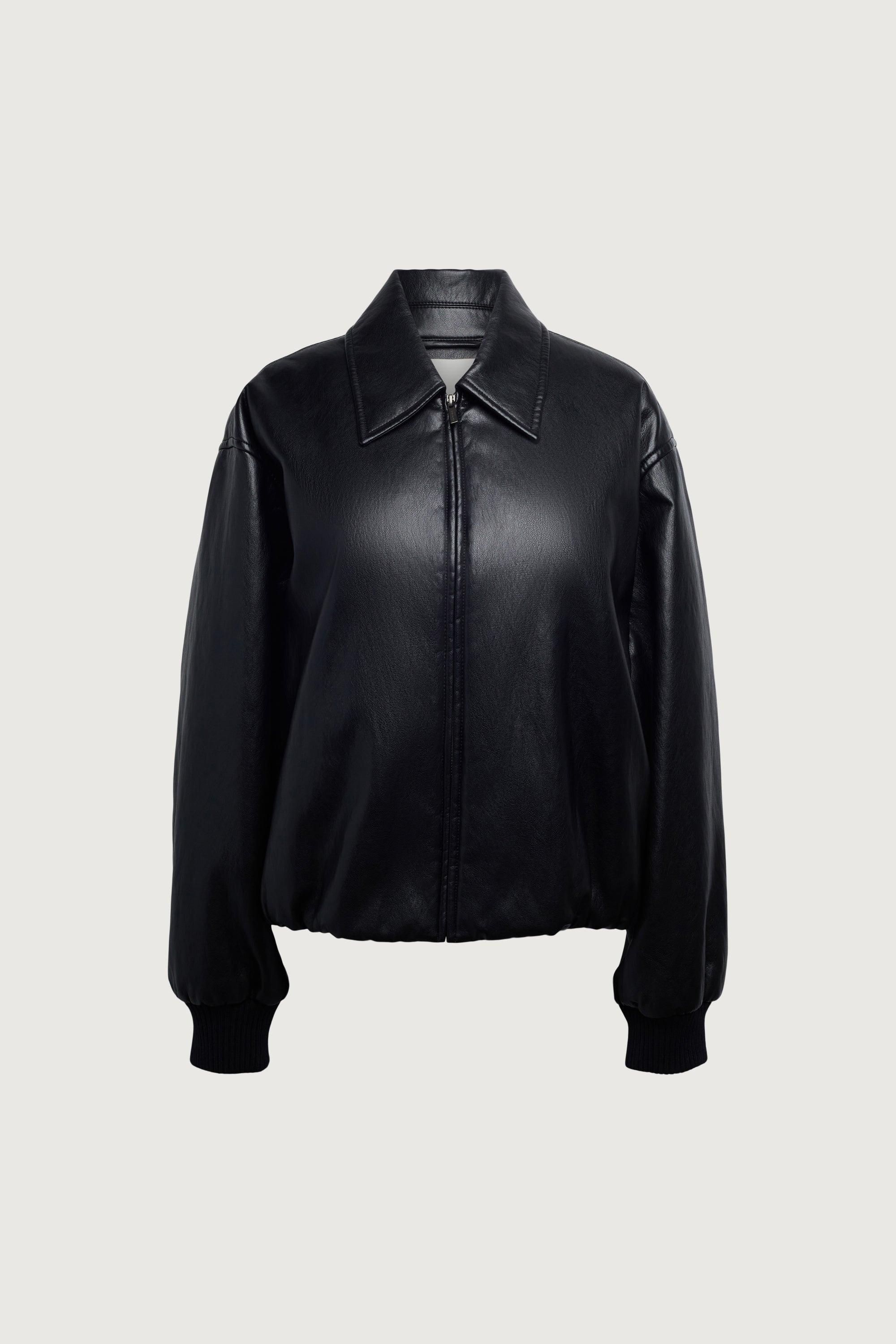 VEGAN LEATHER BUBBLE HEM BOMBER JACKET