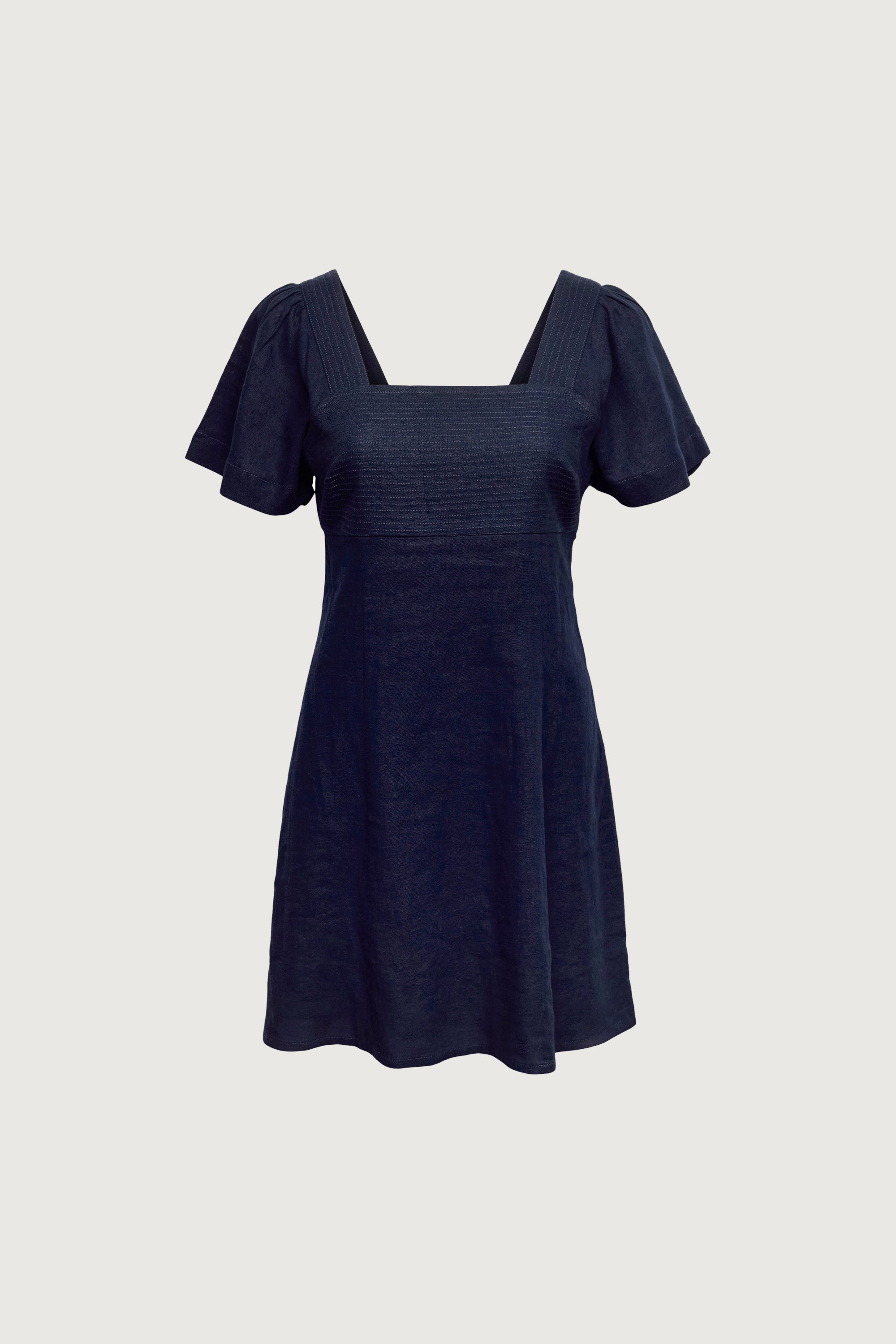 This short sleeve mini dress is cut from a linen rayon blend in a classic fit. It has a square neckline, a bust panel detailed with decorative top stitching and a smocked back for a comfortable fit. Pair yours with a mini bag and sandals.