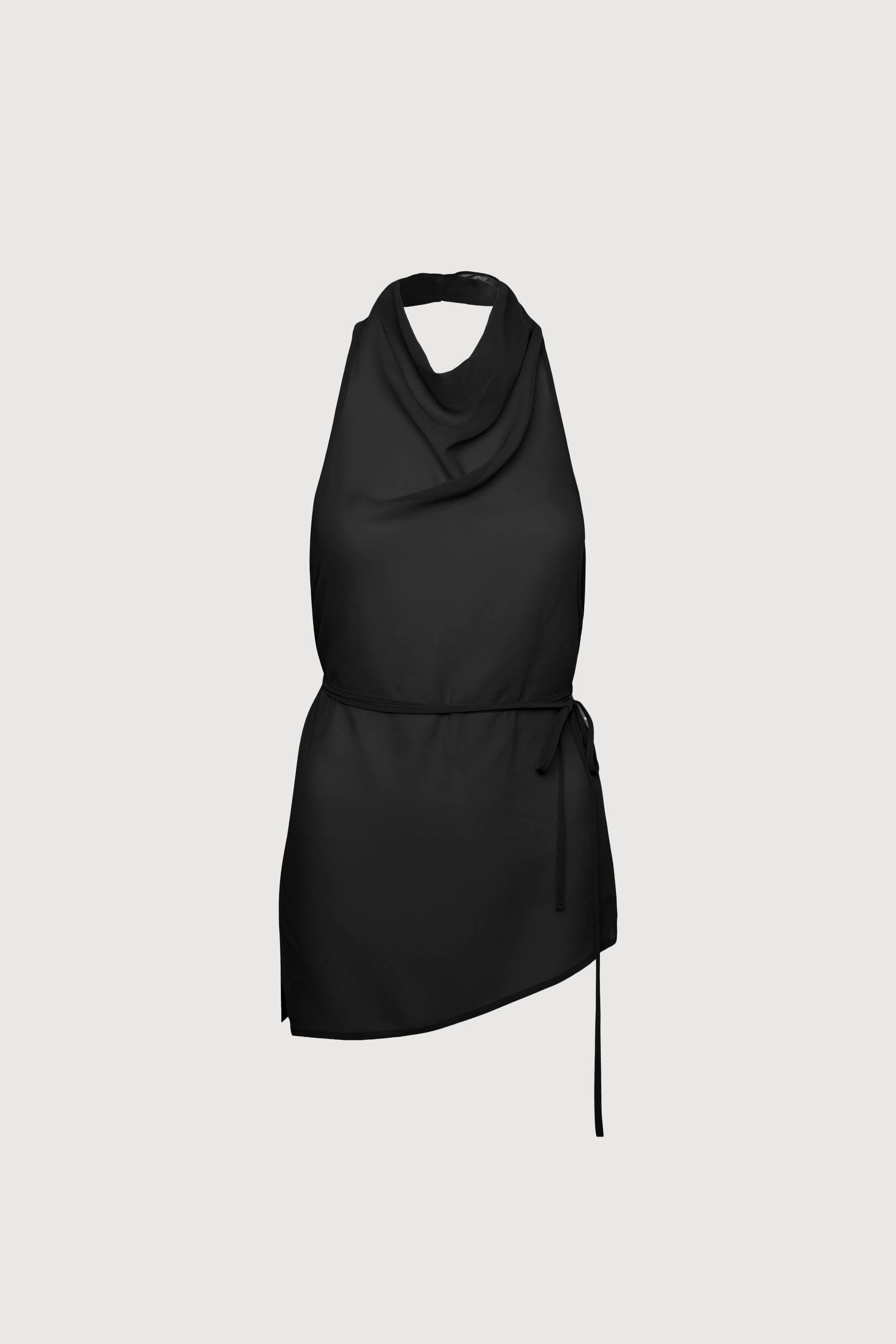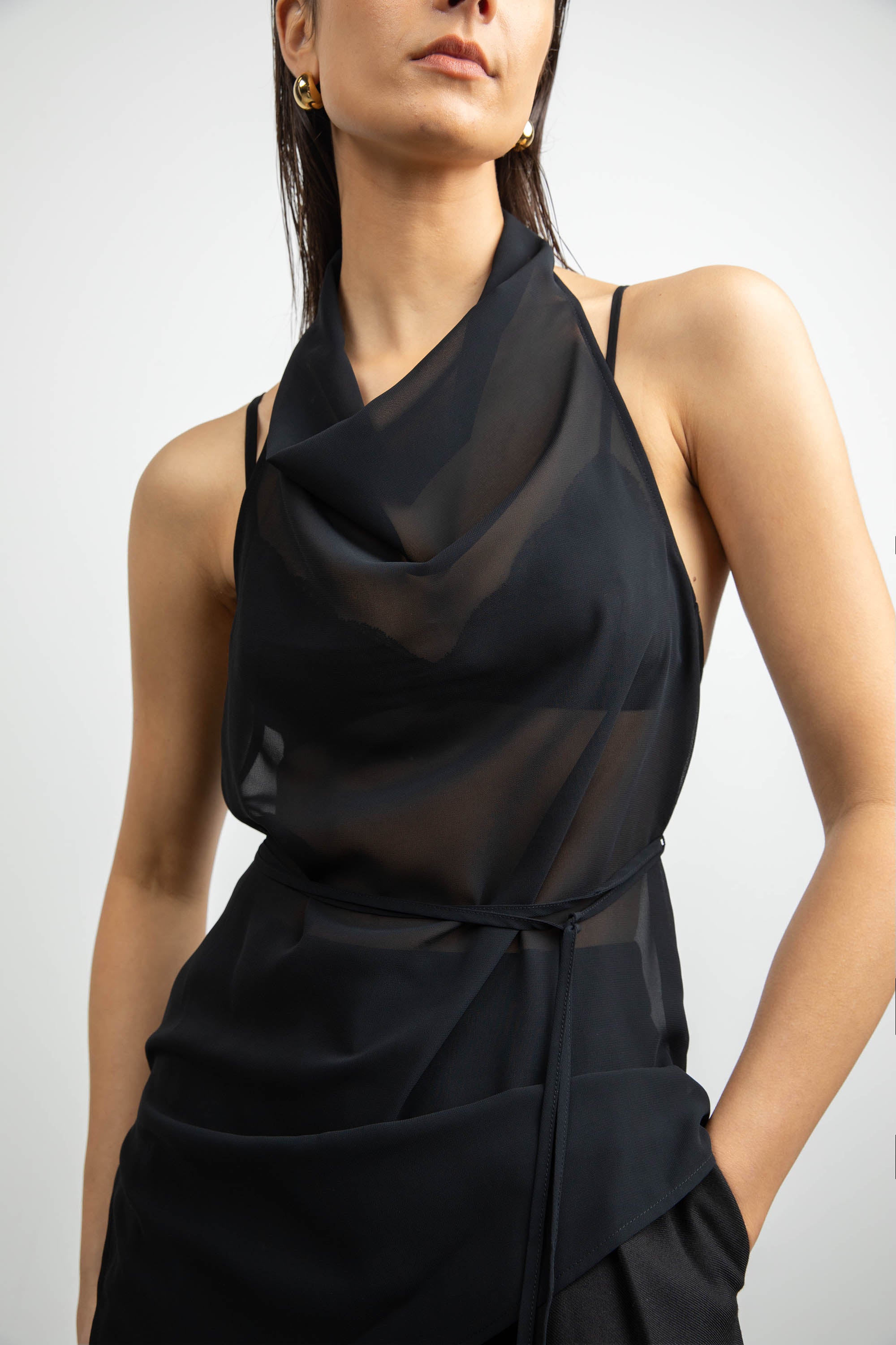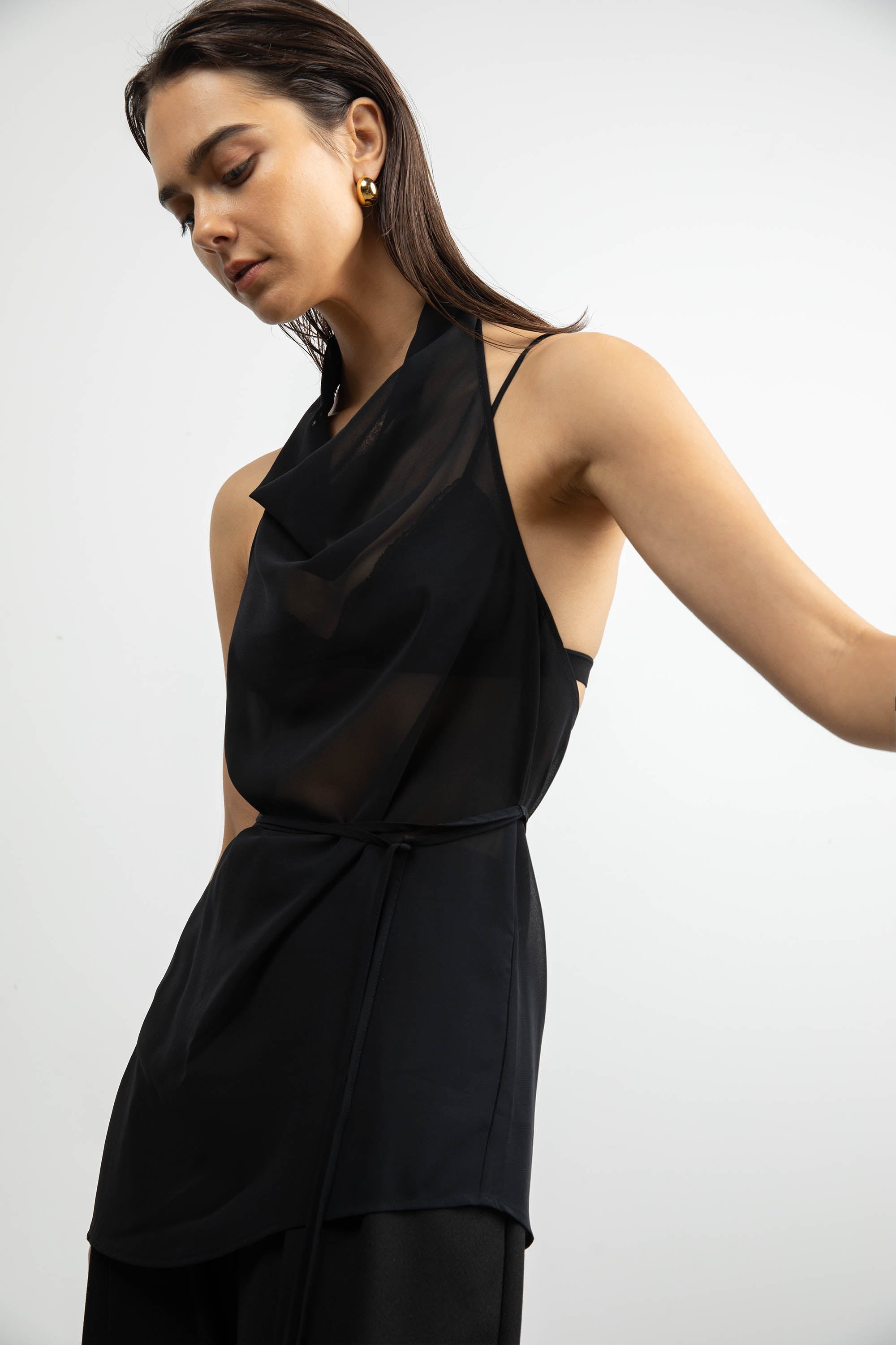This halter top is cut from a sheer fabric and has a mock neckline, a waist tie and an asymmetric hem. A must-have top you can wear with any bottoms from mini skirts to wide leg trousers.
