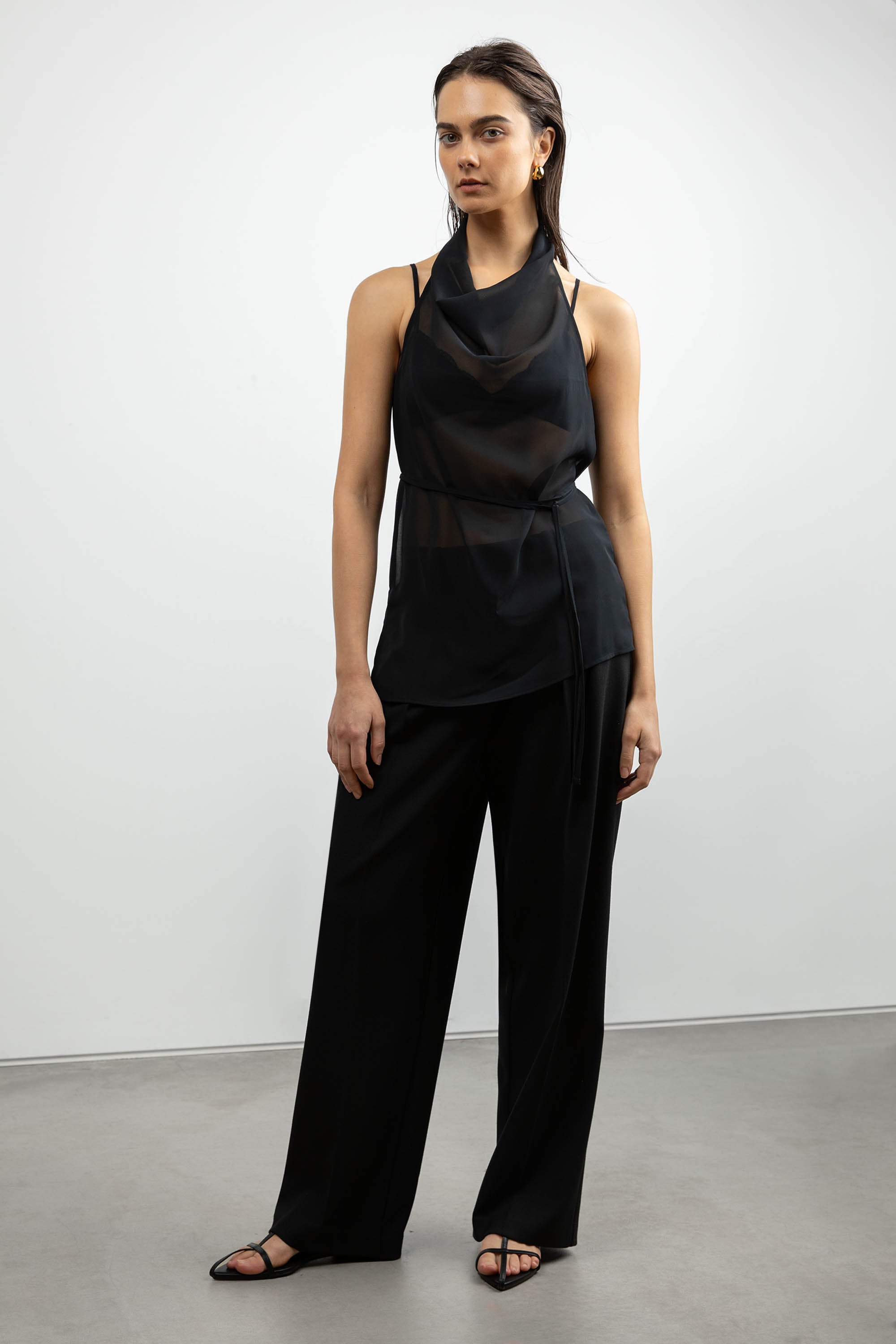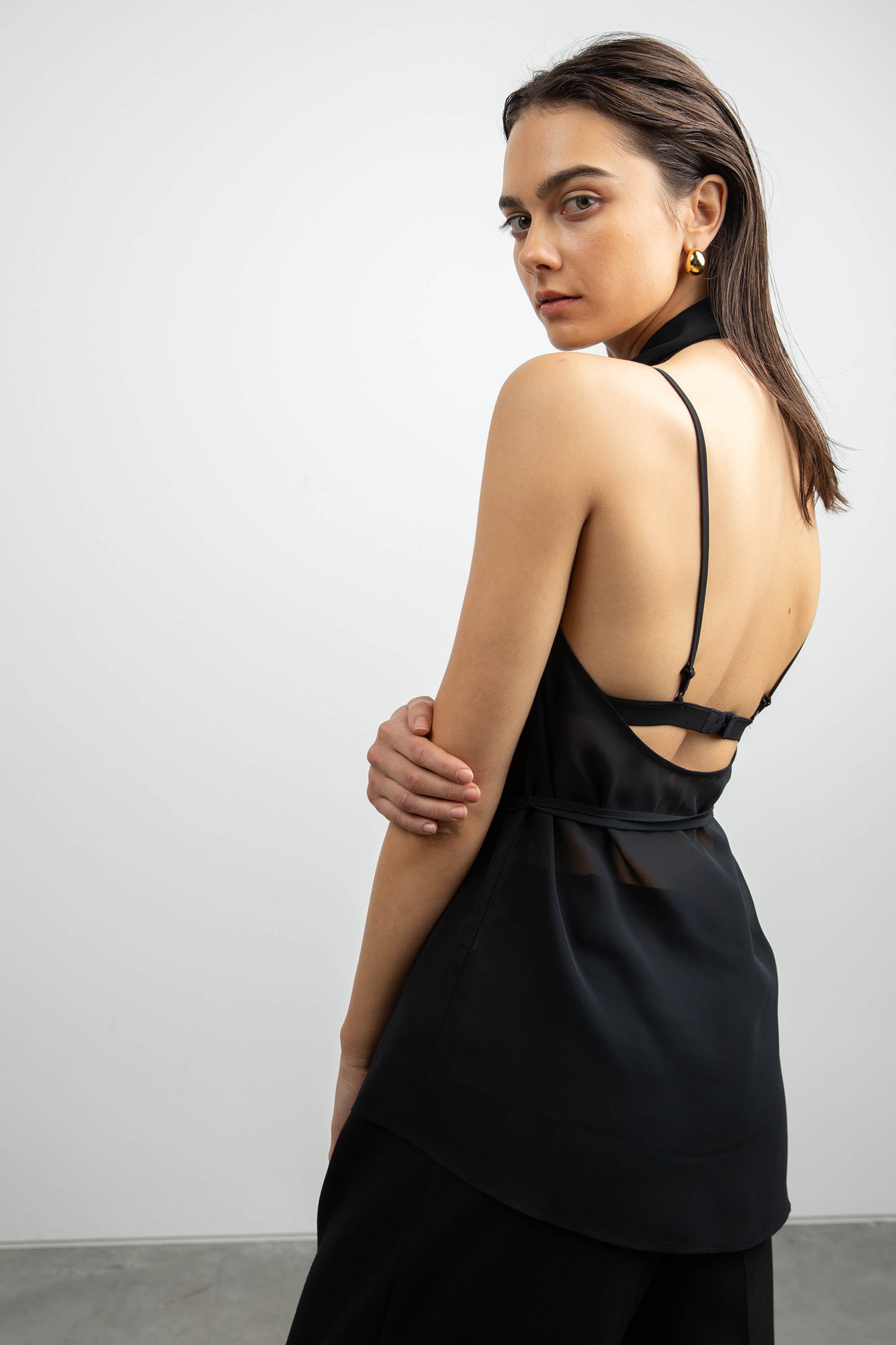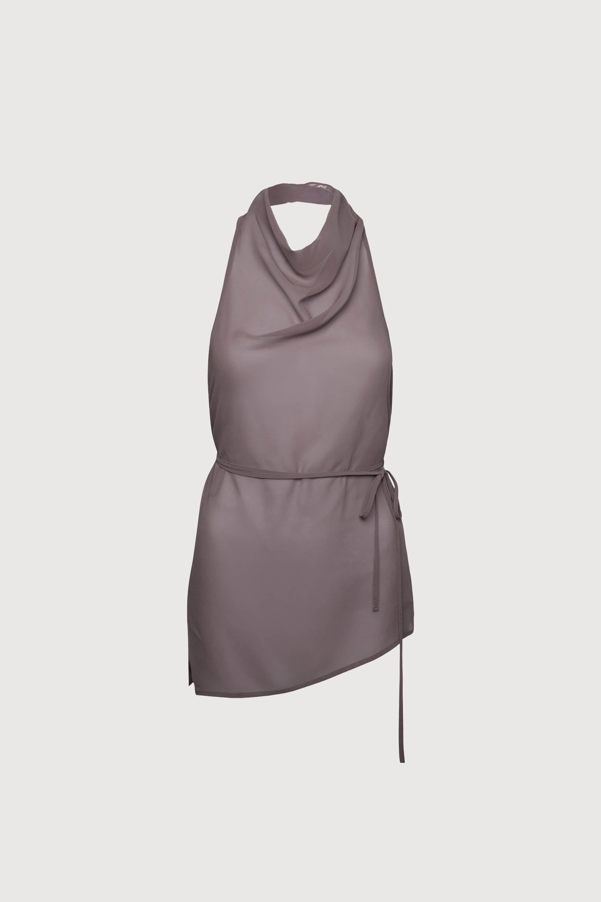 This halter top is cut from a sheer fabric and has a mock neckline, a waist tie and an asymmetric hem. A must-have top you can wear with any bottoms from mini skirts to wide leg trousers.