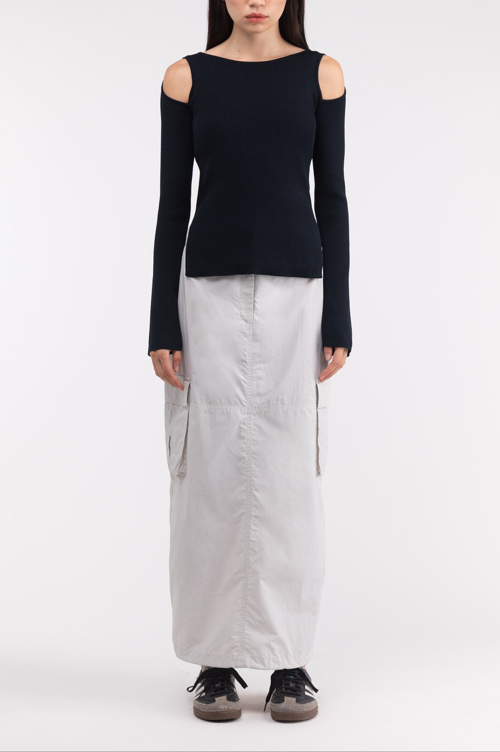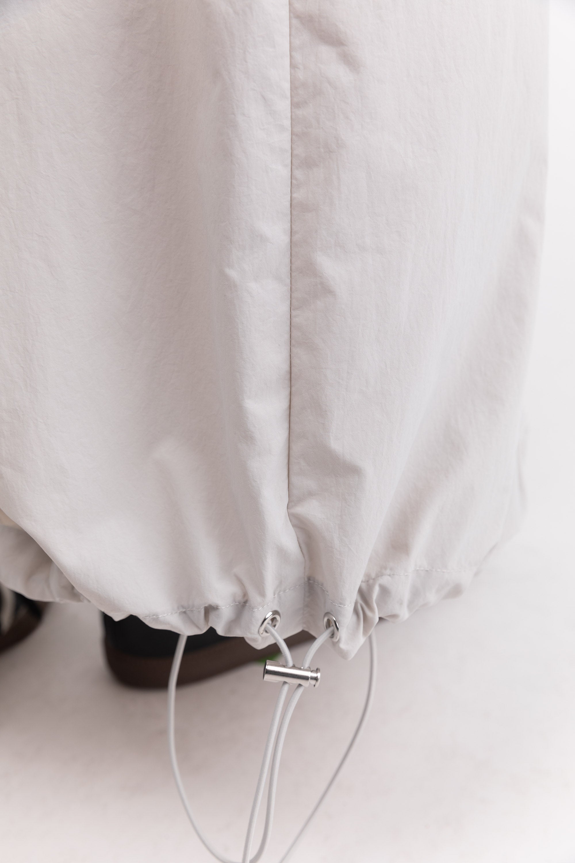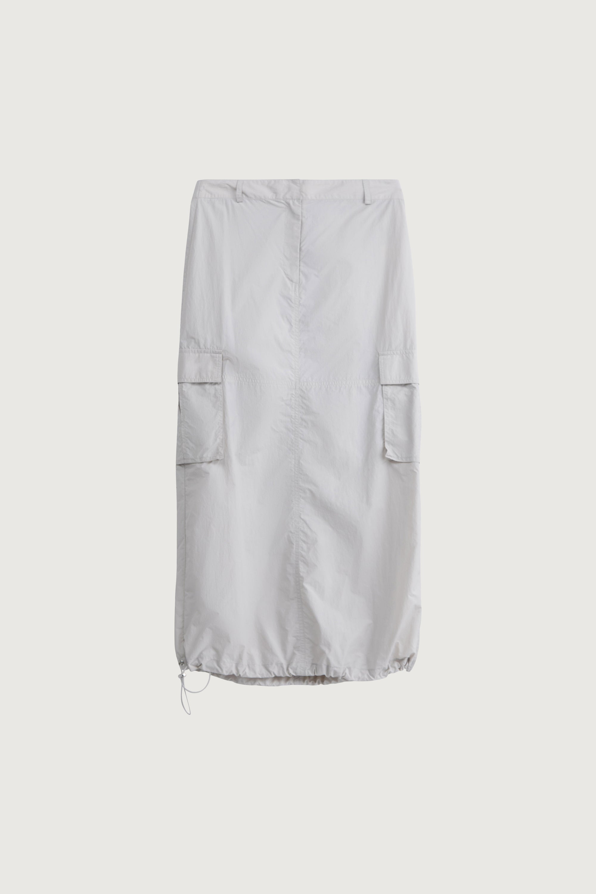 This nylon maxi cargo skirt is lightweight and made in a relaxed fit. It has an elasticated waist at the back, cargo pockets, side slits and shockcord and toggle hem.