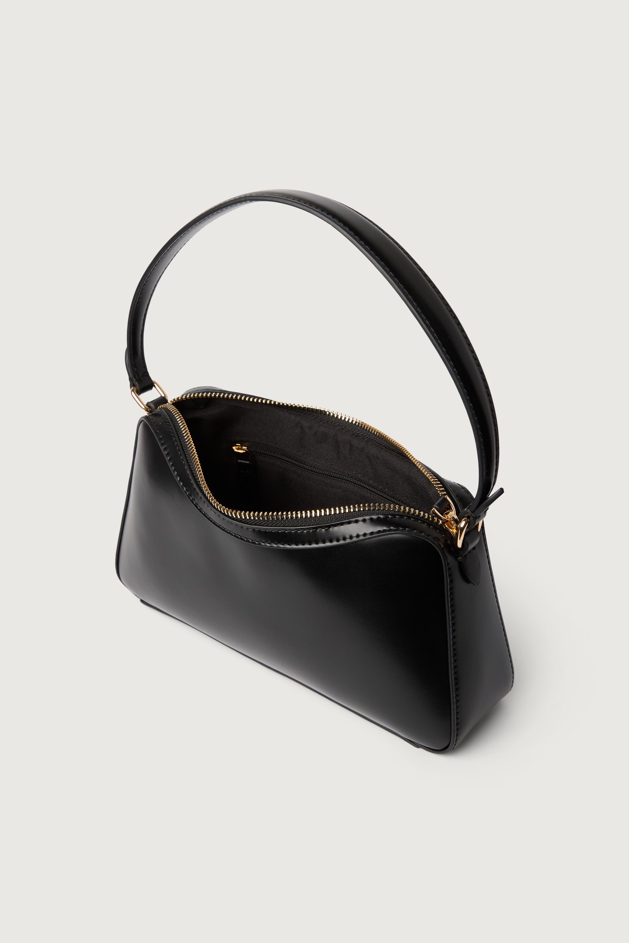 Lined interior. Zip-top closure. Bombe shoulder strap. One interior zip pocket. One interior slip pocket. Semi-structured shape.