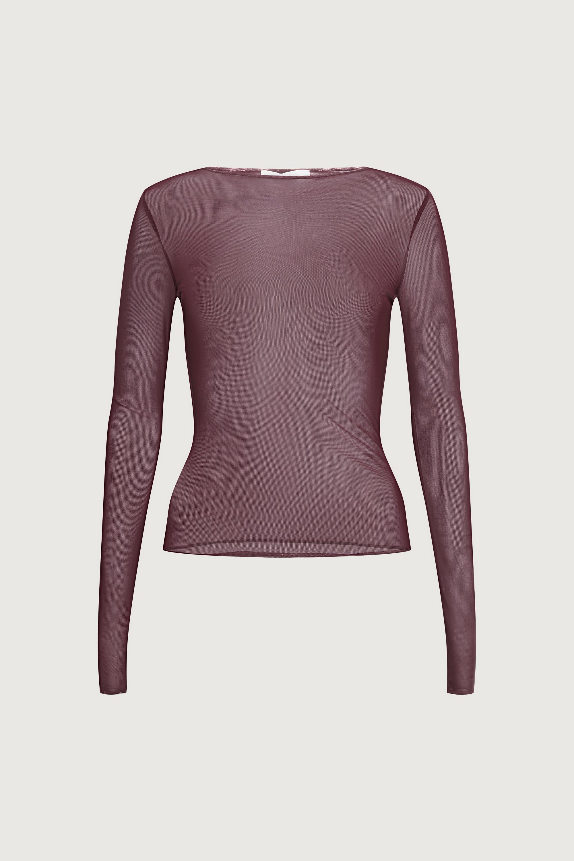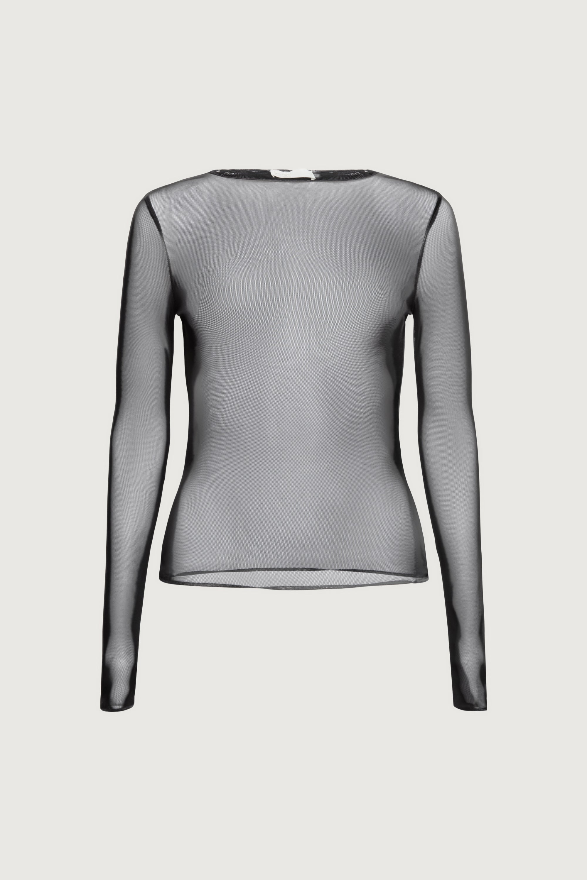 Mesh fabric. Boat neckline. Long sleeves.