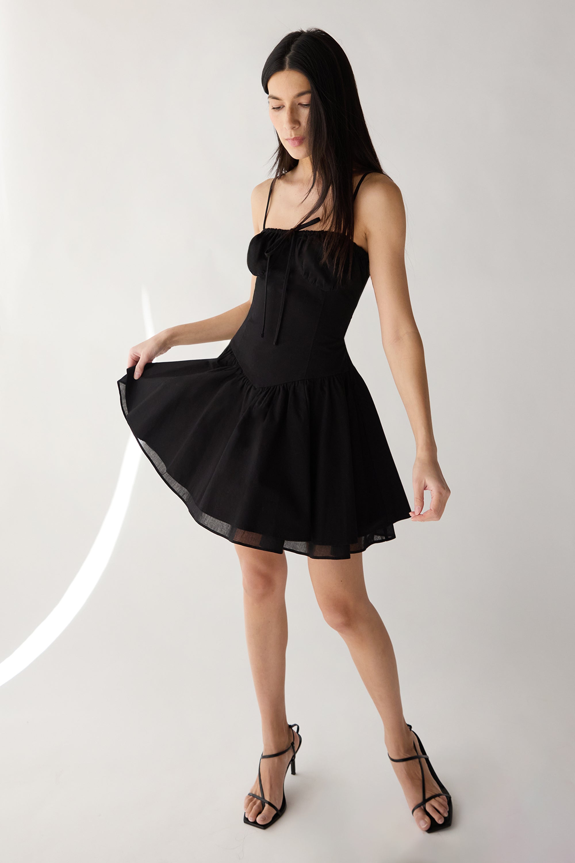 Poplin fabric. Corset bodice with smocked back. Adjustable shoulder straps. V-waist with gathering.